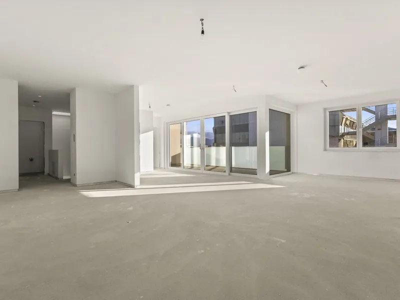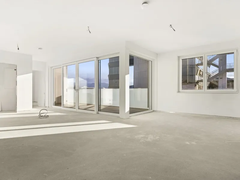 Ein junges Paar steht in einer leeren Wohnung mit großen Rundbogenfenstern, während eine Immobilienmaklerin ihnen etwas erklärt und in den Raum zeigt. Die Szene wirkt wie eine Wohnungsbesichtigung.