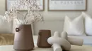 Junge Frau im pinken Blazer hält ein Modellhaus in der linken Hand und zeigt mit der rechten Hand nach oben, als hätte sie eine Idee. Sie lächelt und blickt leicht nach oben – symbolisch für Inspiration oder Immobilienberatung.