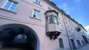 Junge Frau im pinken Blazer hält ein Modellhaus in der linken Hand und zeigt mit der rechten Hand nach oben, als hätte sie eine Idee. Sie lächelt und blickt leicht nach oben – symbolisch für Inspiration oder Immobilienberatung.