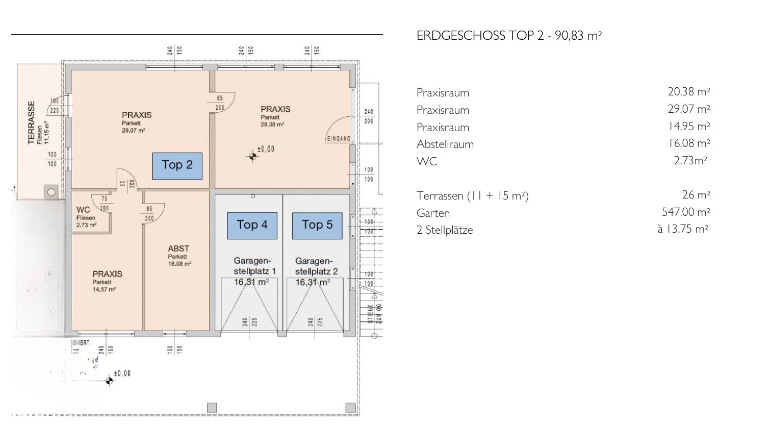 Zur Einheit gehören zwei Garagenstellplätze, damit ist komfortables Parken direkt am Objekt gesichert, was im Praxisbetrieb oder bei Kundenverkehr einen klaren Vorteil darstellt.