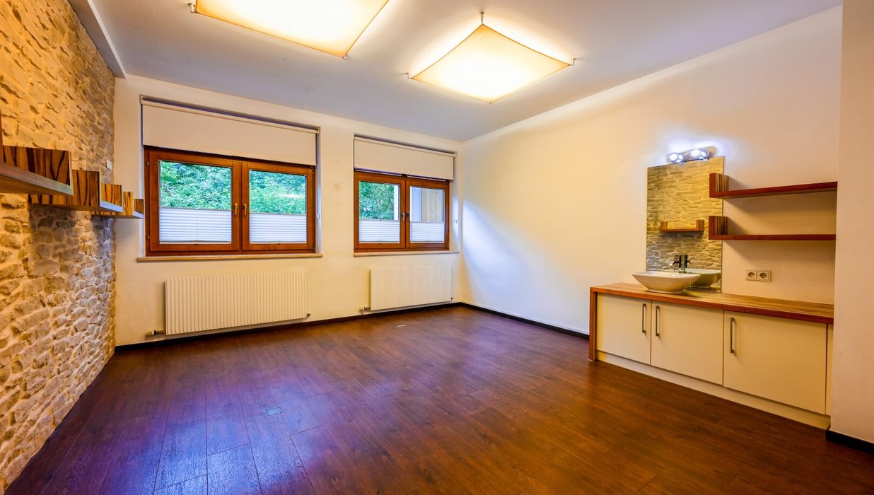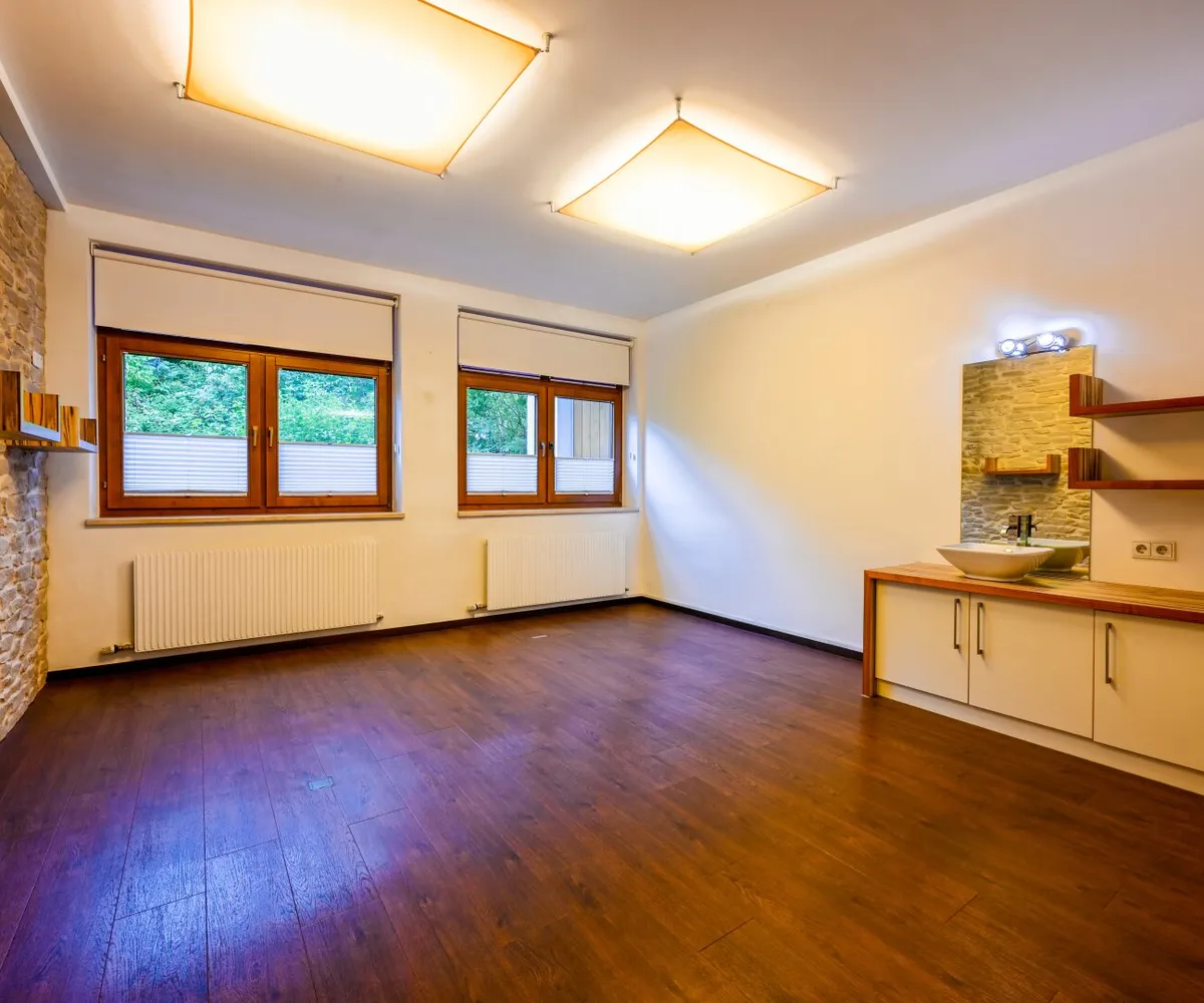 Die hochwertigen Materialien wie Fliesen und Parkett sorgen nicht nur für ein stilvolles Ambiente, sondern auch für eine angenehme Wohlfühlatmosphäre. Eine Fußbodenheizung bietet Ihnen an kalten Tagen den notwendigen Komfort, während die Massivbauweise für Stabilität und Langlebigkeit steht.