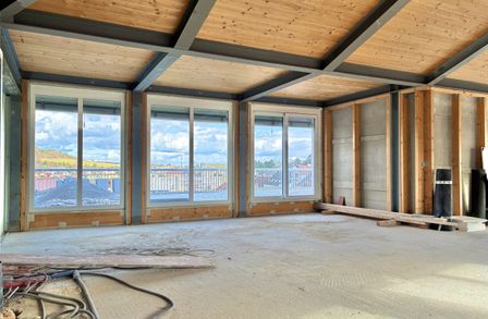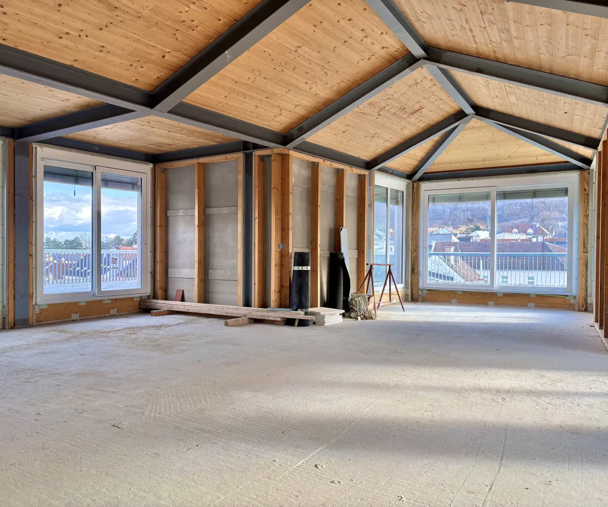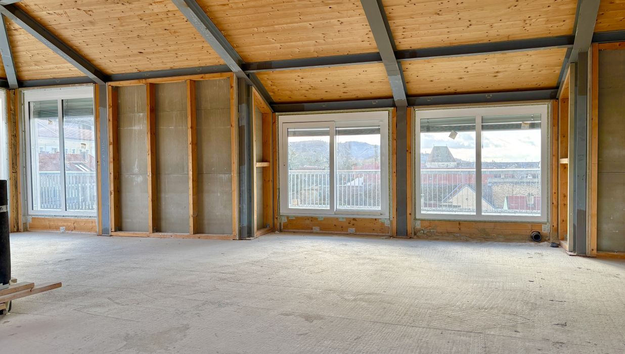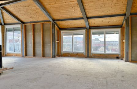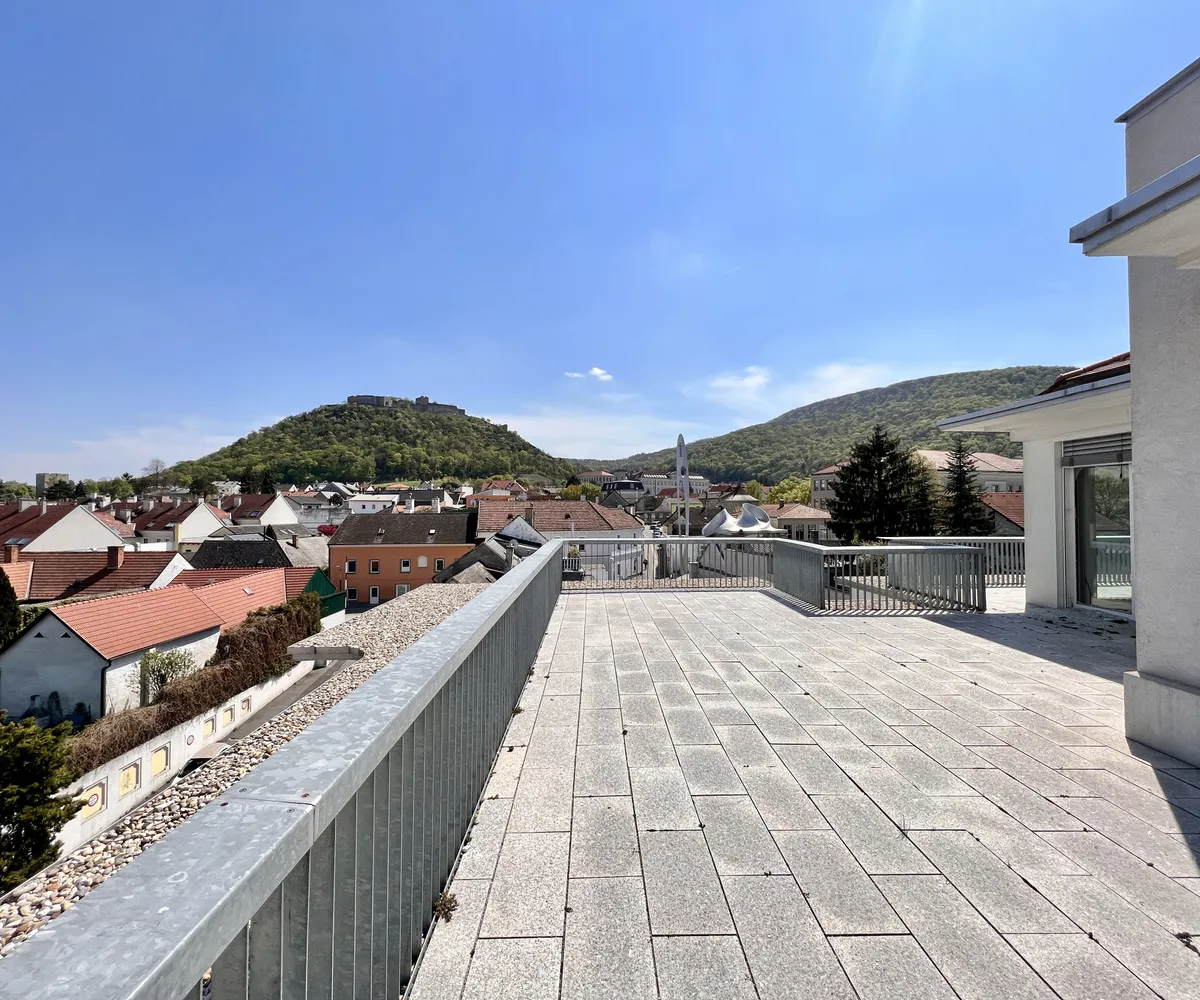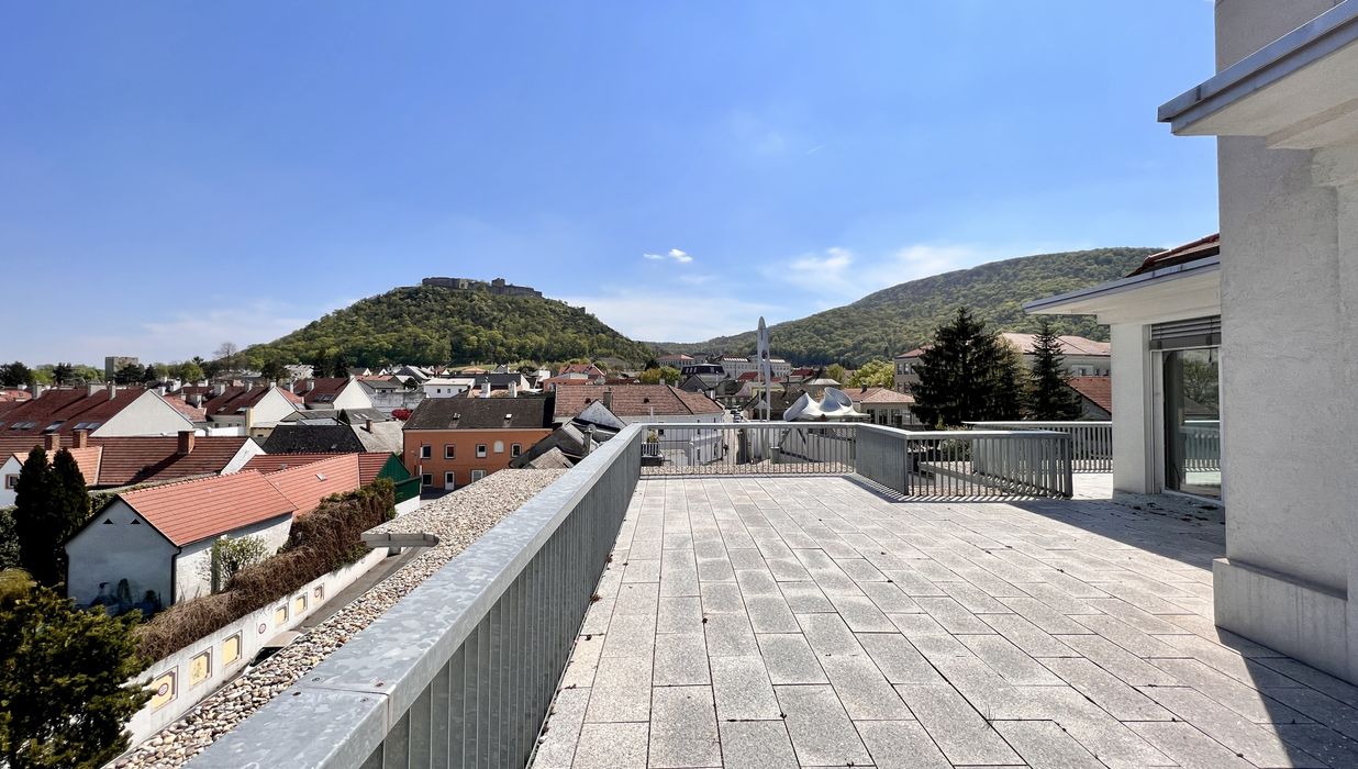 Die Fläche befindet sich im obersten Dachgeschoss und eröffnet einen herrlichen Blick über Hainburg sowie einen direkten Ausblick auf den Schlossberg.