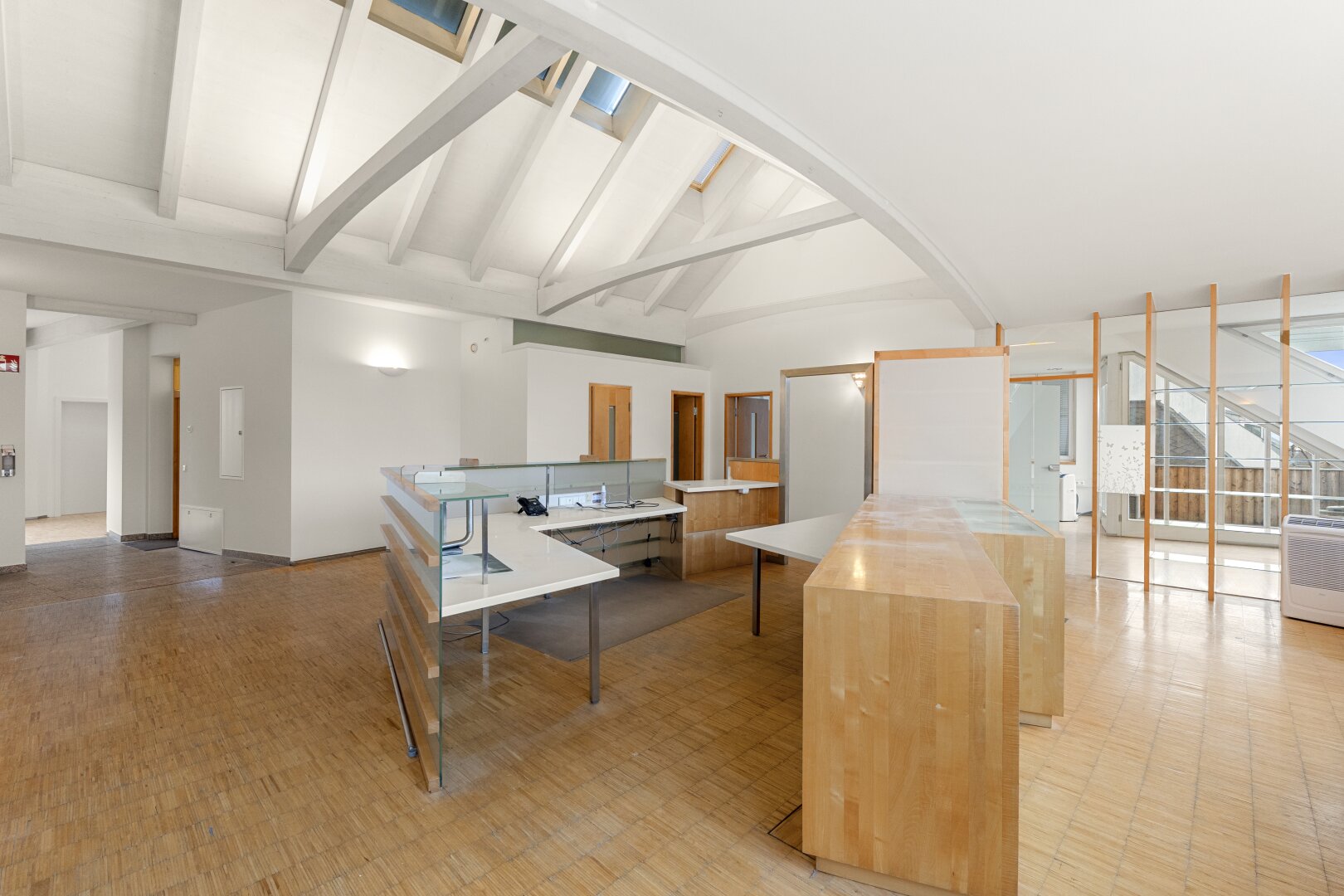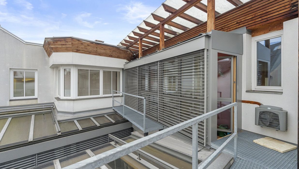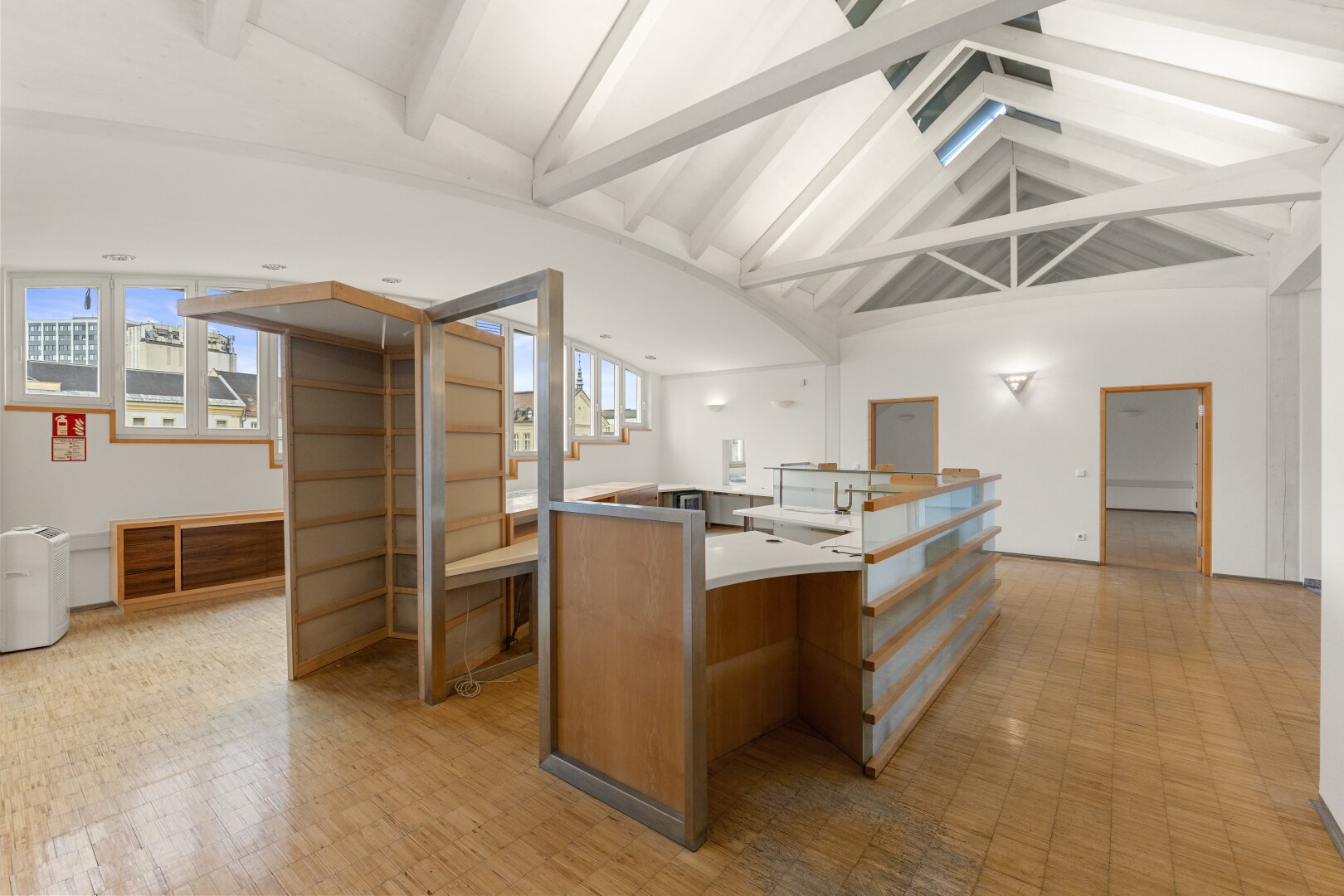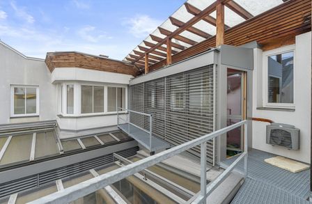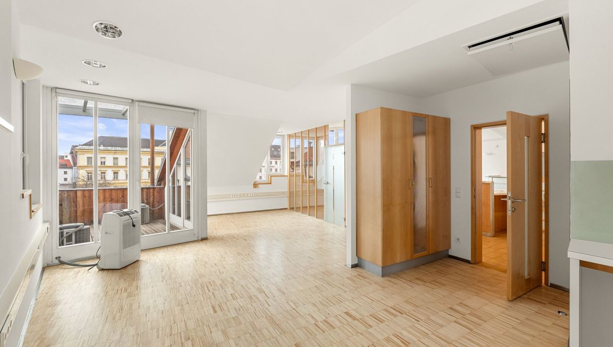Ein wesentliches Merkmal sind die großen Glasfronten, die für viel Tageslicht und eine offene, klare Atmosphäre sorgen. Ergänzt wird dies durch Klimageräte sowie zwei Balkone, die als echte Freiräume mitten in der Innenstadt dienen ideal für Pausen, Gespräche oder einen kurzen Perspektivwechsel.