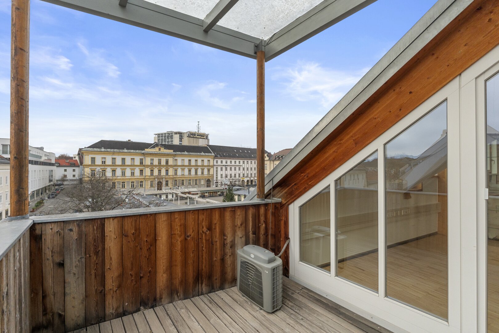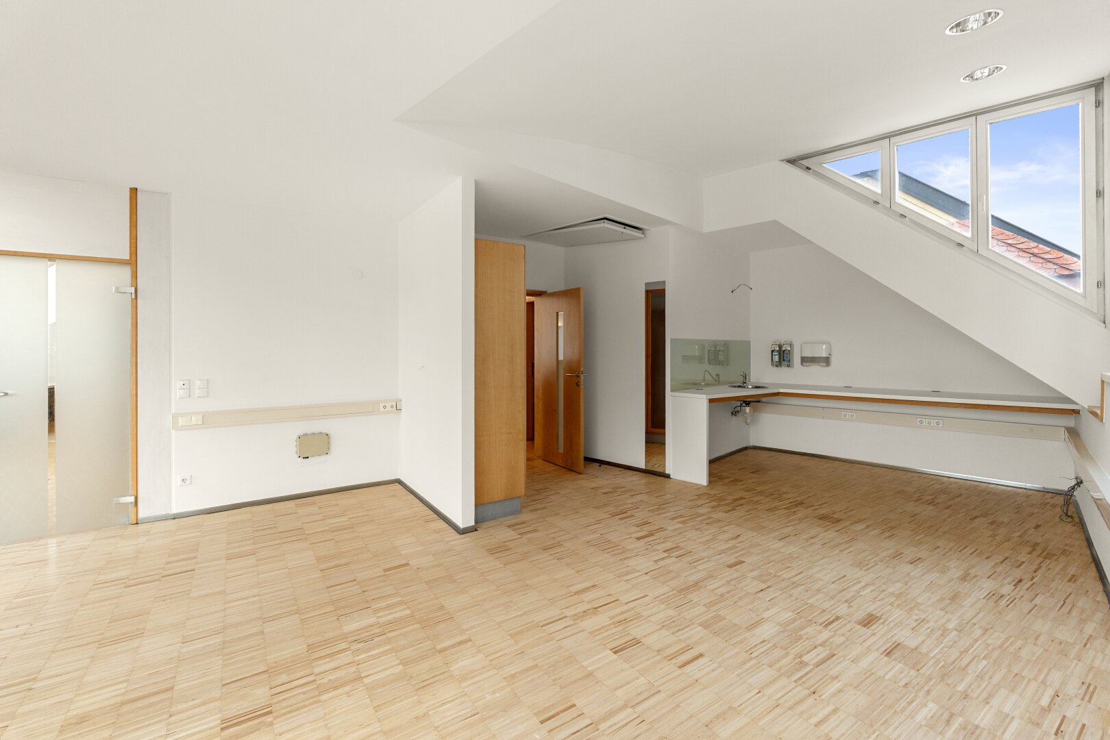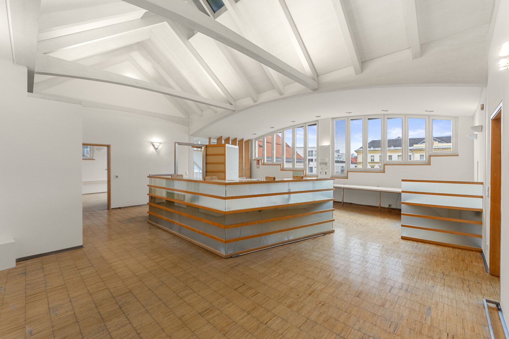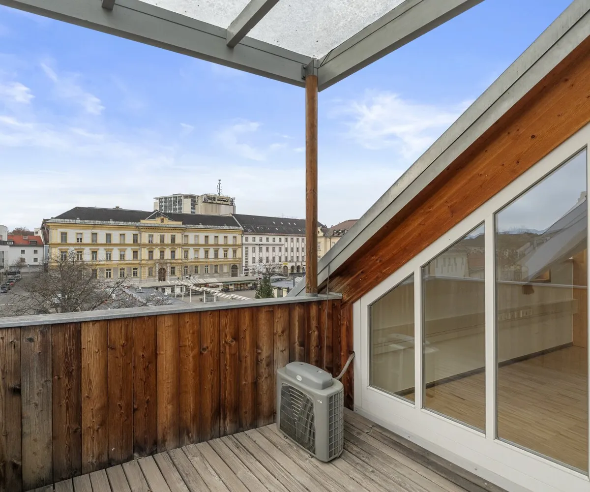 Ein wesentliches Merkmal sind die großen Glasfronten, die für viel Tageslicht und eine offene, klare Atmosphäre sorgen. Ergänzt wird dies durch Klimageräte sowie zwei Balkone, die als echte Freiräume mitten in der Innenstadt dienen ideal für Pausen, Gespräche oder einen kurzen Perspektivwechsel.