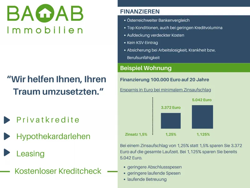 Bei jedem Kauf einer Immobilie oder eines Grundstücks ist es wichtig, die passende Finanzierung zu finden. Mit seiner eigenen Vertriebsorganisation ist Infina als Wohnbau-Finanz-Experte an über 100 Standorten in ganz Österreich vertreten und vermittelt Finanzierungen an über 150 Banken und Bausparkassen. Nutzen Sie unseren kostenlosen Kreditvergleich für den passenden Wohnkredit: