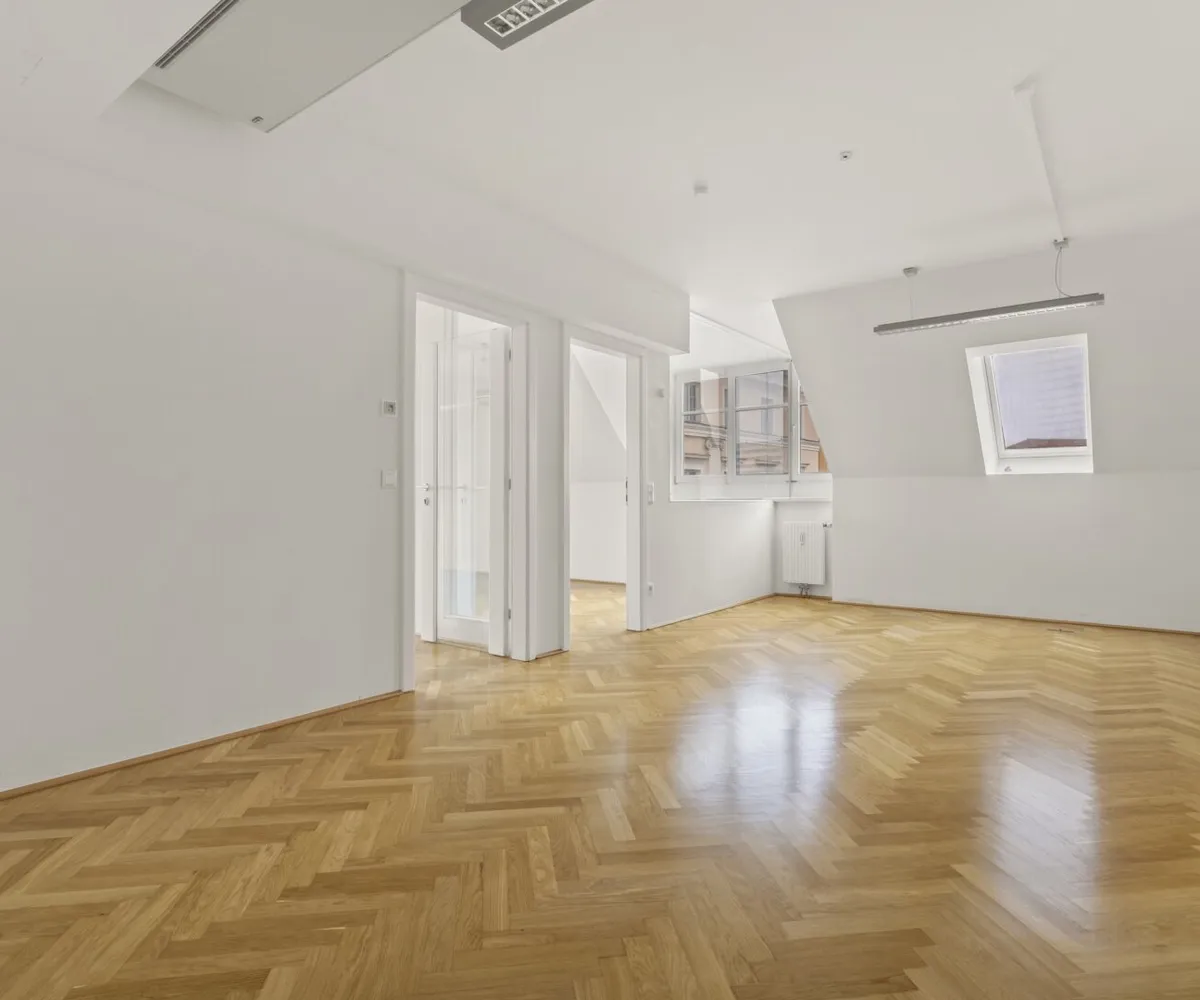 Die Räumlichkeiten im 3. Obergeschoss öffnen sich mit großzügiger Raumhöhe, edlem Fischgrätparkett und einem durchdachten Grundriss,