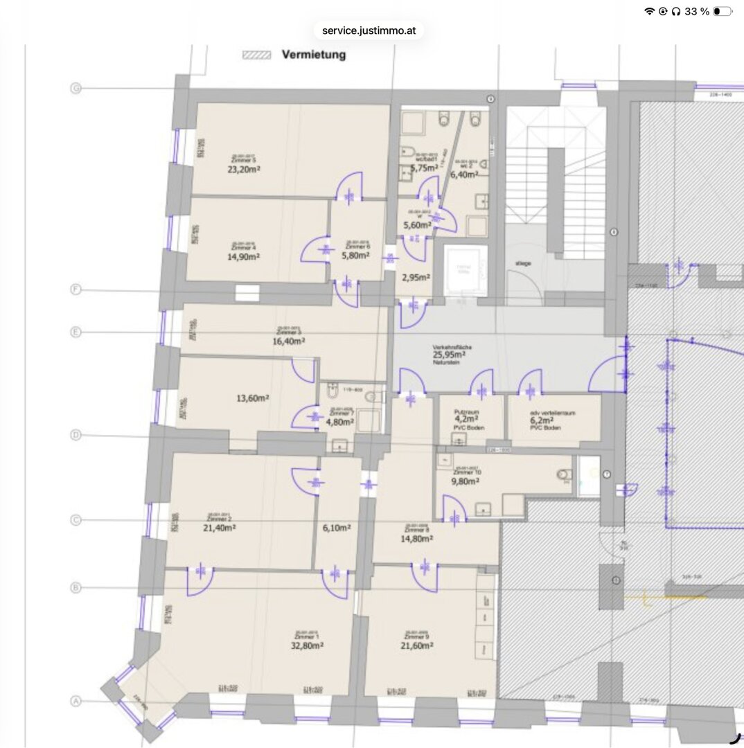 Die Bürofläche befindet sich im 1. OG eines altehrwürdigen Gebäudes im Zentrum von Klagenfurt am Wörthersee. Man erreicht diese Fläche über ein Stiegenhaus und mit einem barrierefreien Lift.