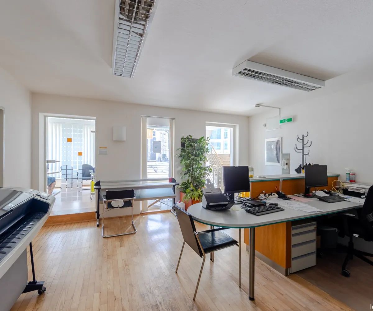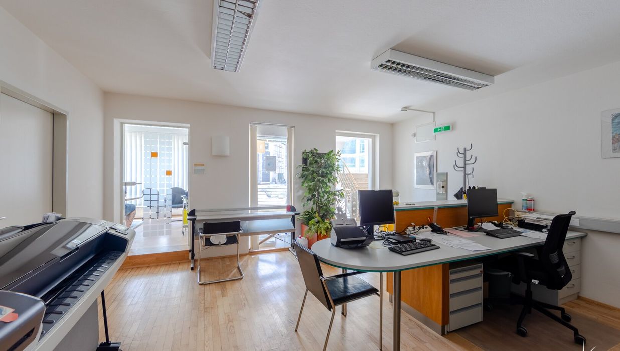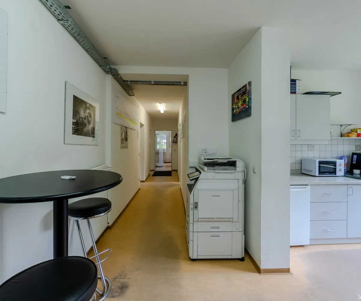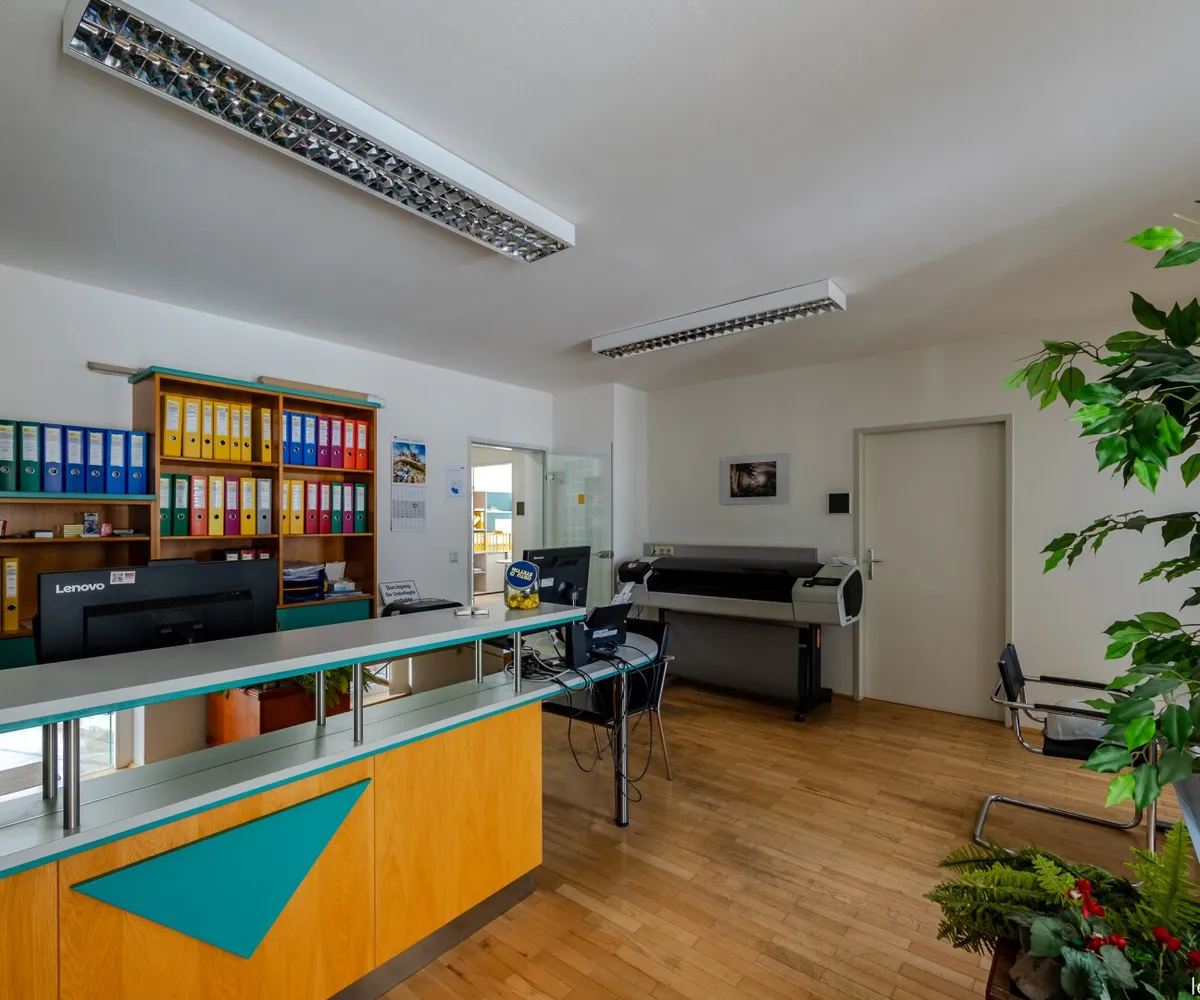 Die vermietbaren Büroflächen gehören zum EG und 1. Stock . Im Eingangsbereich des Erdgeschosses befindet sich ein zentraler Empfang. Jede Etage wird durch eine separate Teeküche und WC ergänzt.