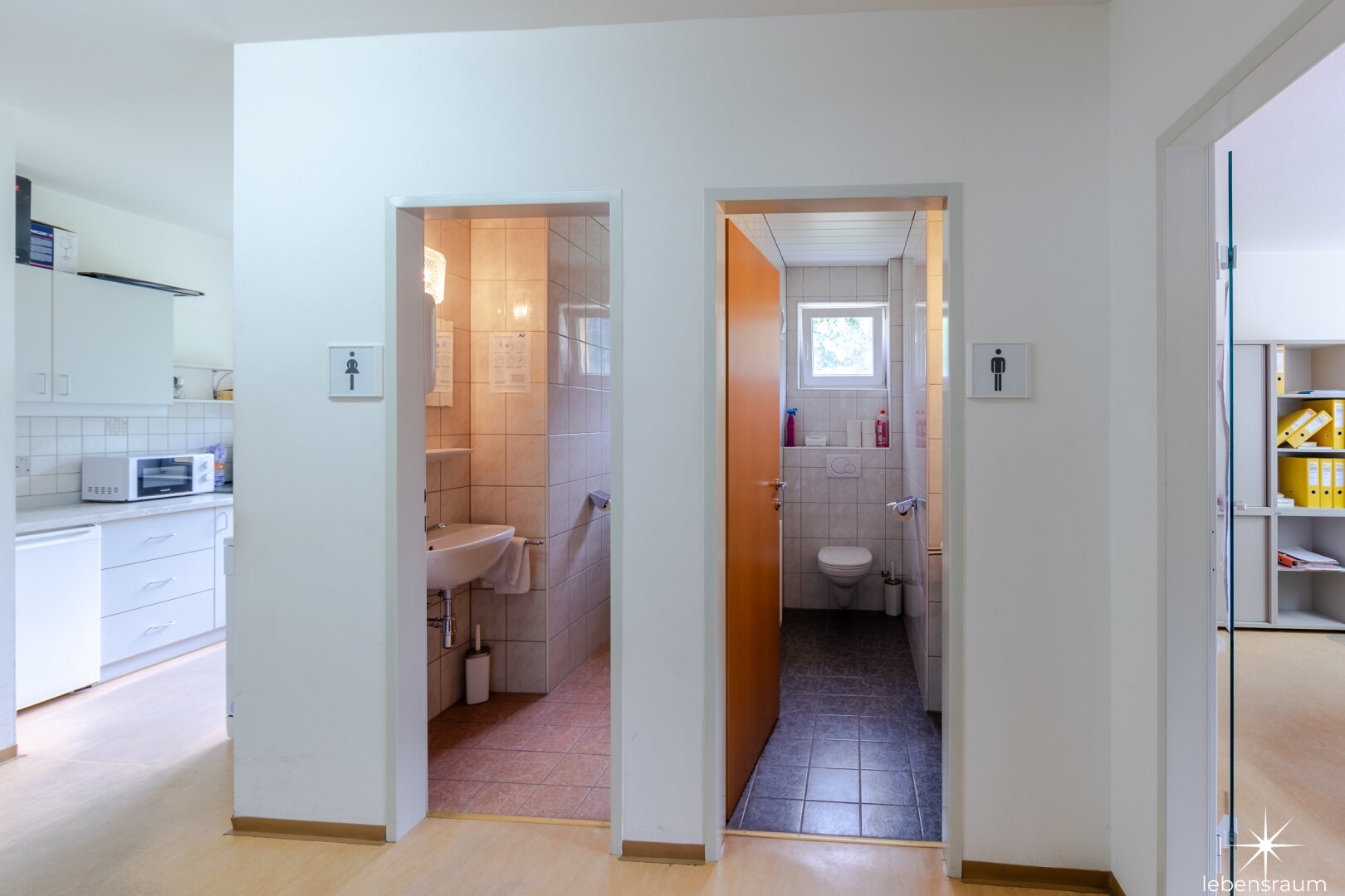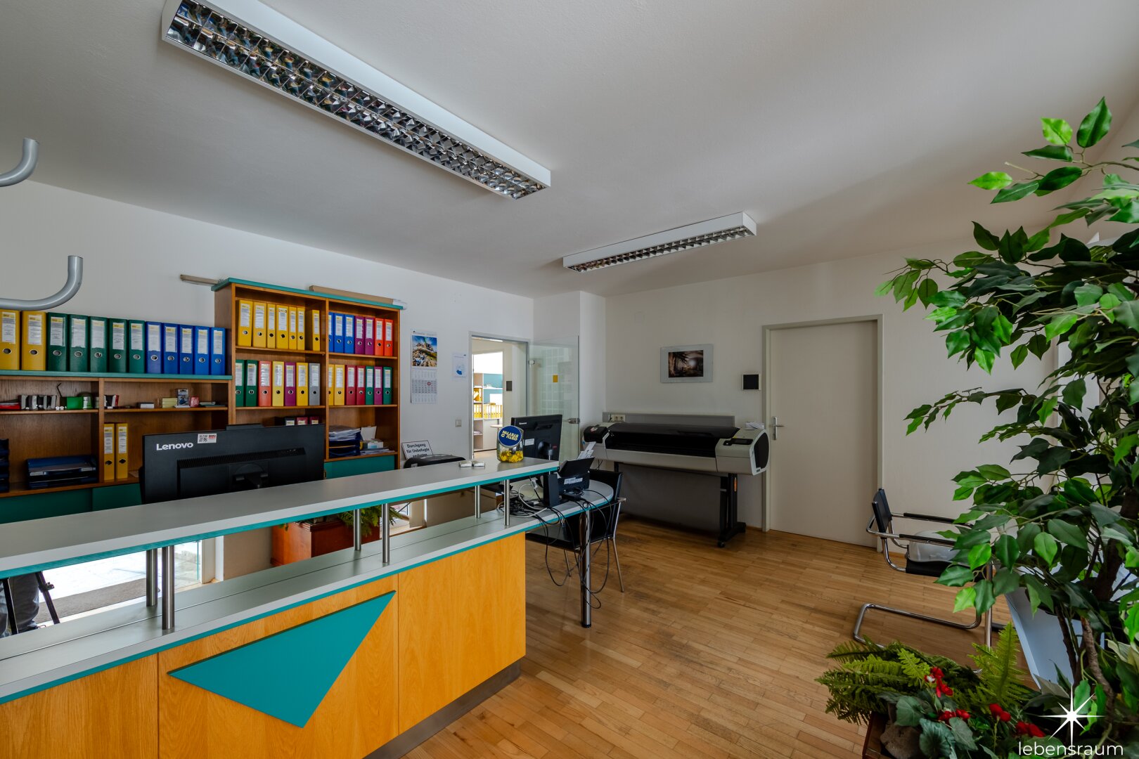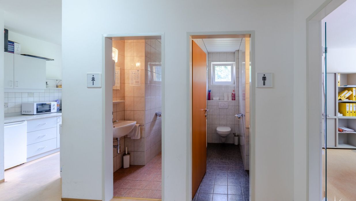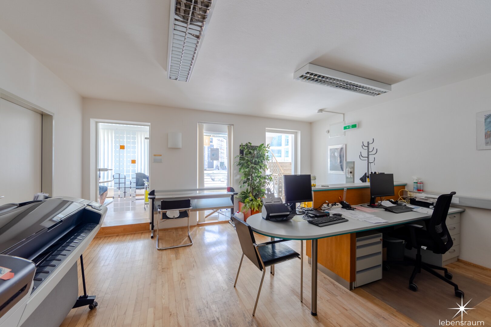 Die vermietbaren Büroflächen gehören zum EG und 1. Stock . Im Eingangsbereich des Erdgeschosses befindet sich ein zentraler Empfang. Jede Etage wird durch eine separate Teeküche und WC ergänzt.