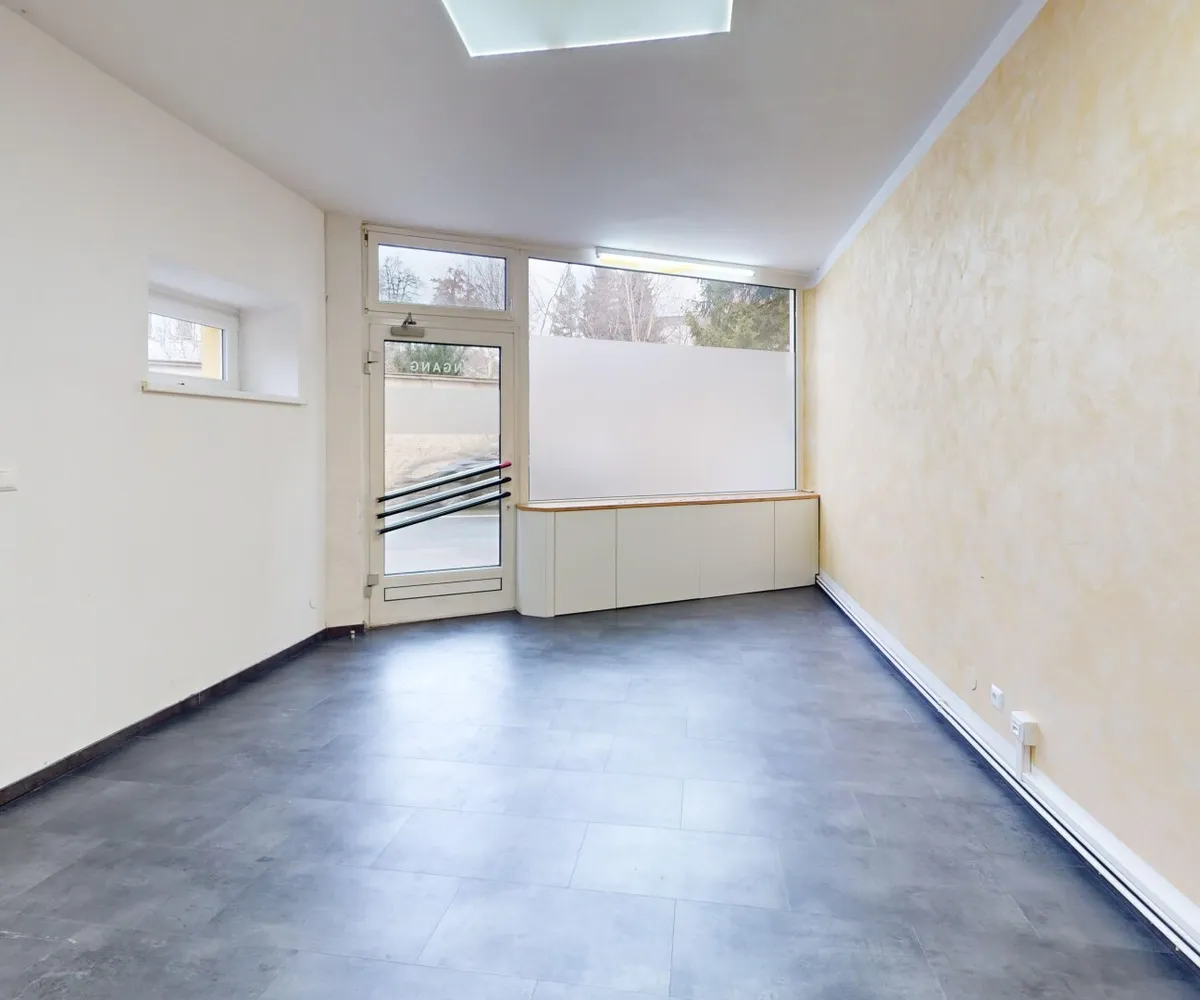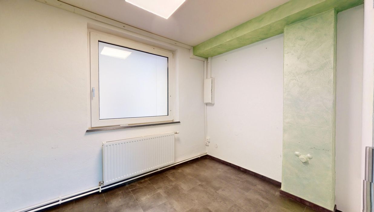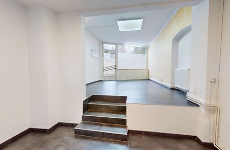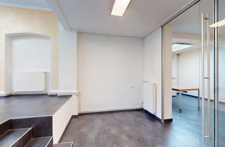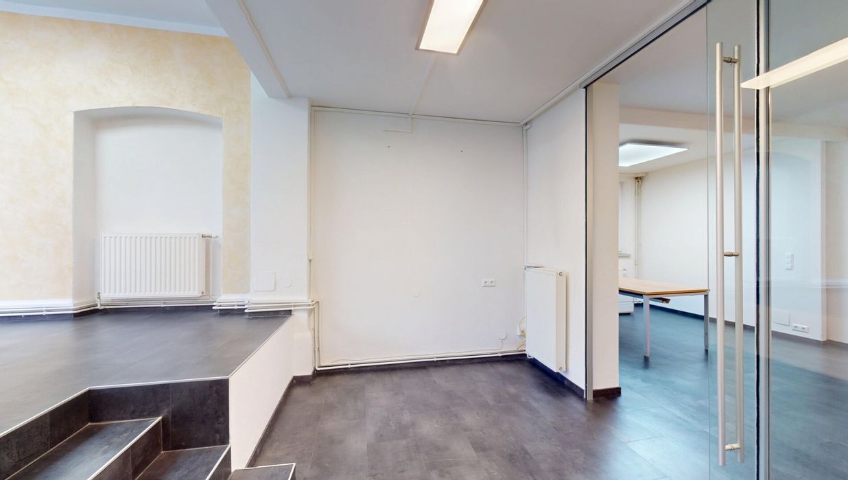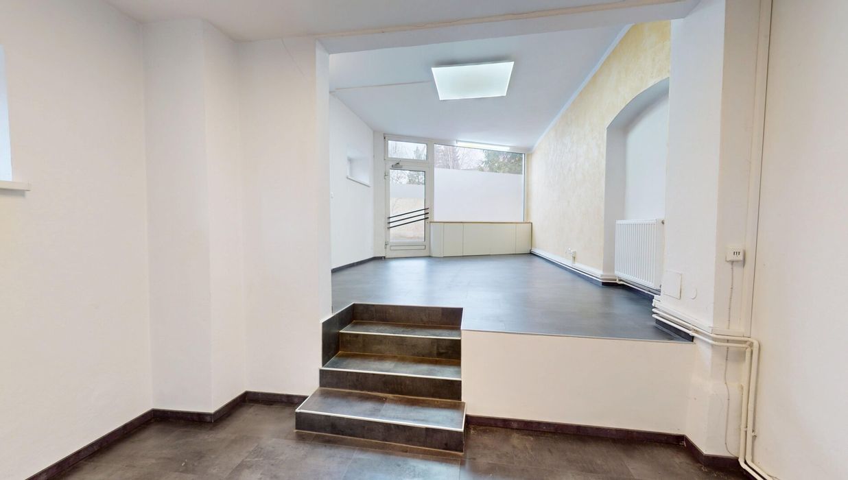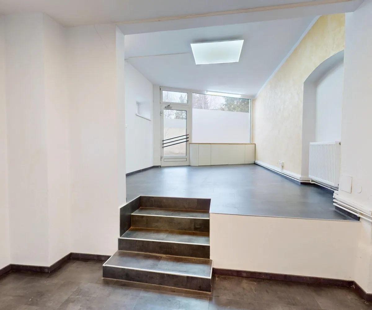 Die Bodenbeläge im vorderen Bereich bestehen aus hochwertigen Vinylböden in einer modernen, ansprechenden Blau-Grau-Farbgebung, die sich leicht mit unterschiedlichen Einrichtungskonzepten abstimmen lässt. Über drei Stufen gelangt man in einen kleinen Zwischenbereich, der vom Vormieter als Druckerzone und Kundenwartebereich genutzt wurde.