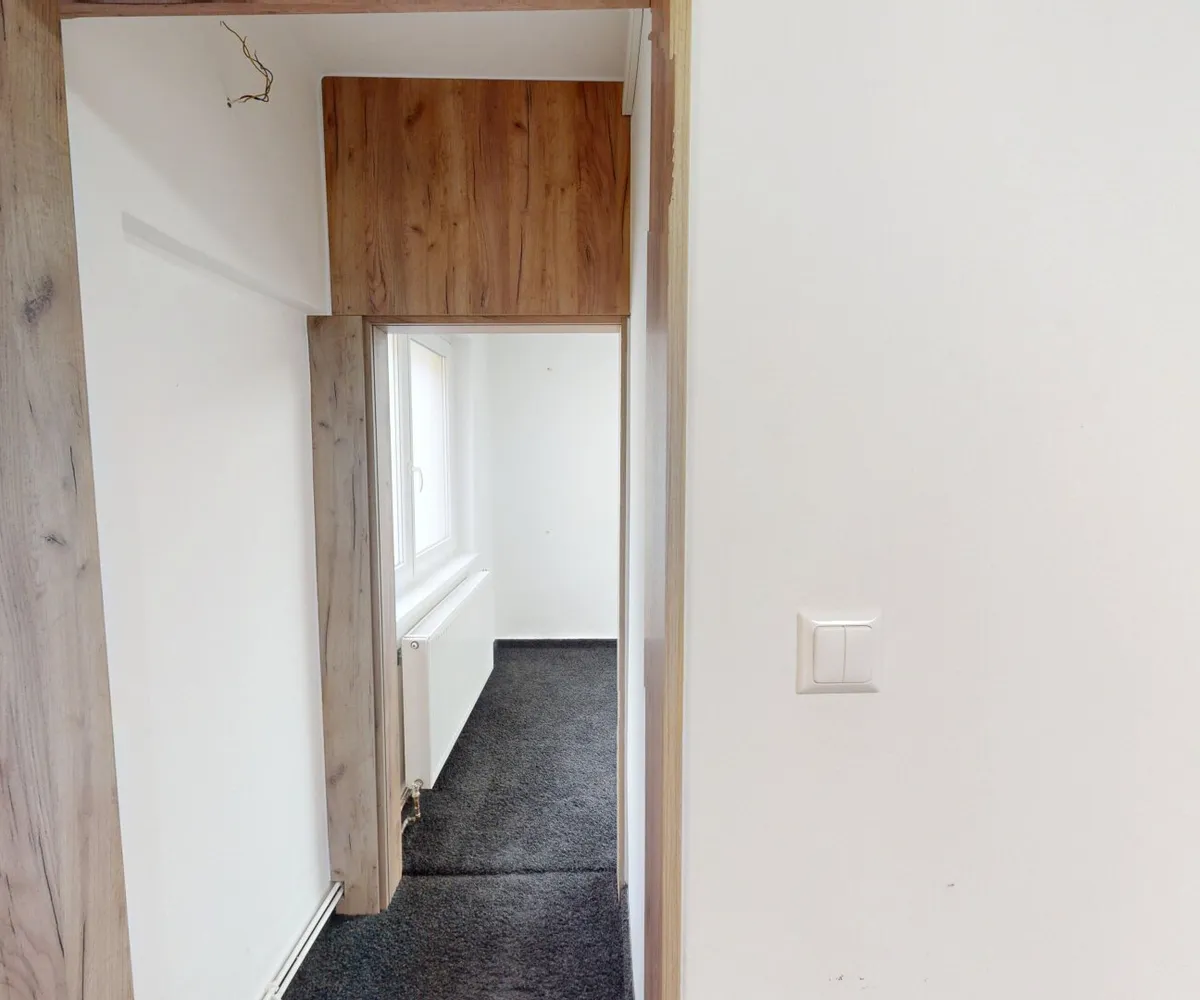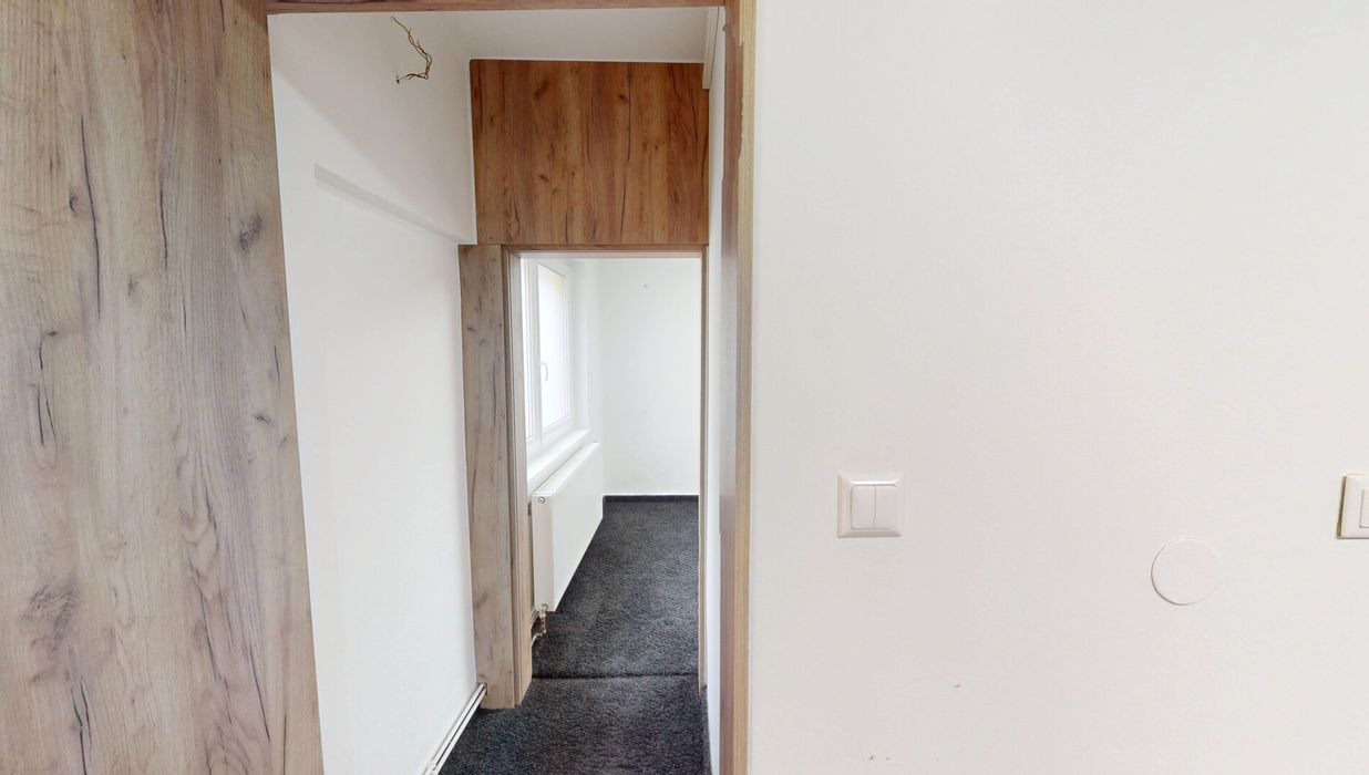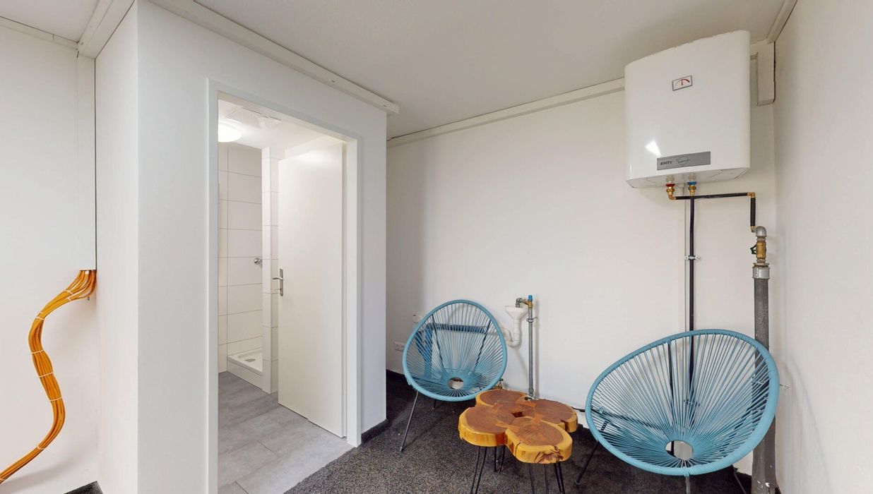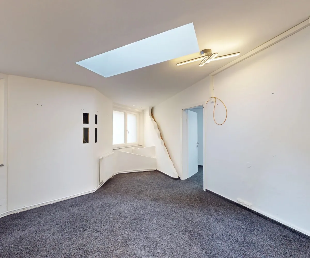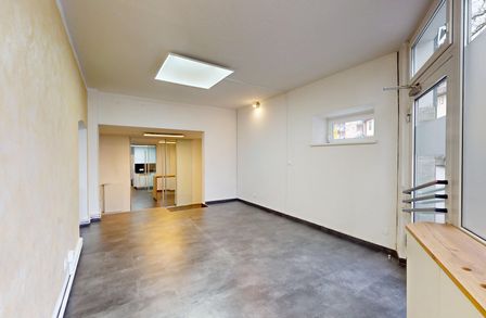 Die Bodenbeläge im vorderen Bereich bestehen aus hochwertigen Vinylböden in einer modernen, ansprechenden Blau-Grau-Farbgebung, die sich leicht mit unterschiedlichen Einrichtungskonzepten abstimmen lässt. Über drei Stufen gelangt man in einen kleinen Zwischenbereich, der vom Vormieter als Druckerzone und Kundenwartebereich genutzt wurde.