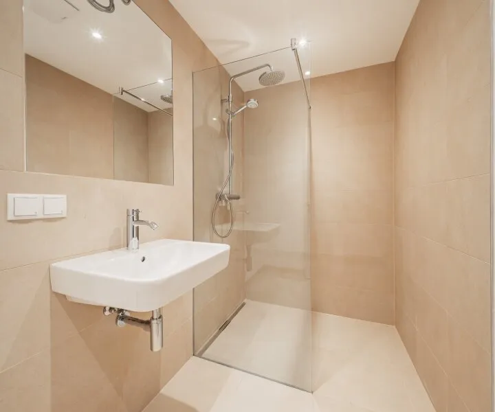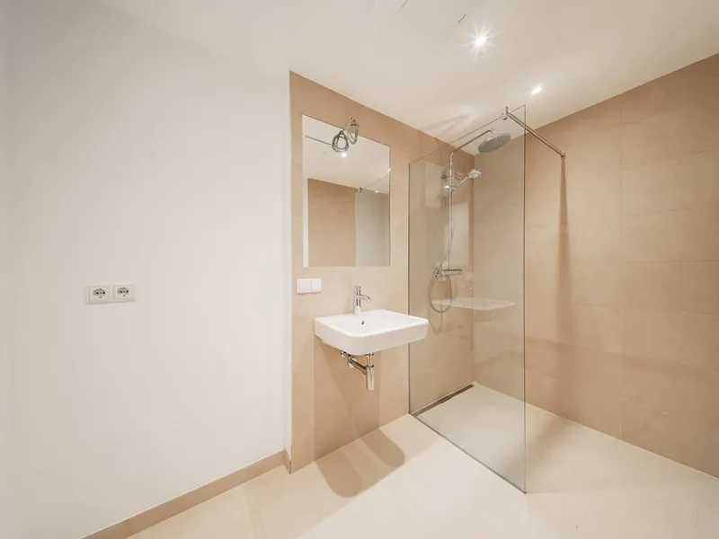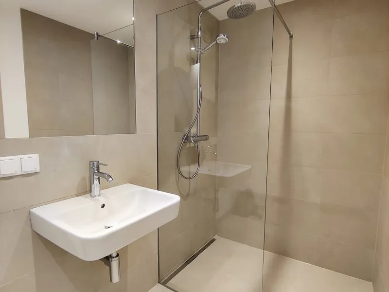 - Badezimmer mit Dusche und Waschmaschinenanschluss, WC separat