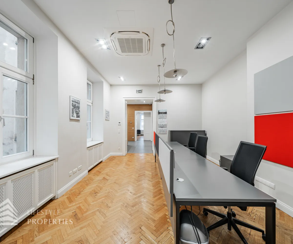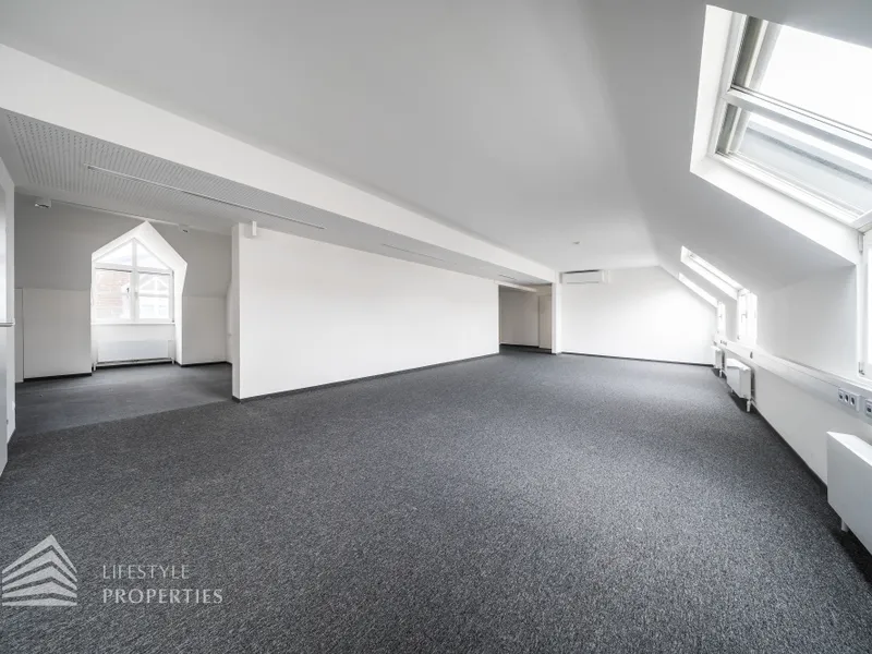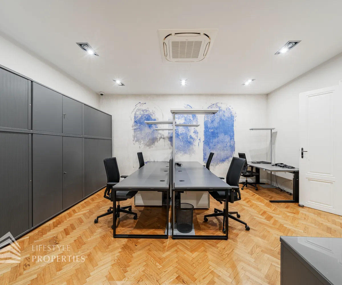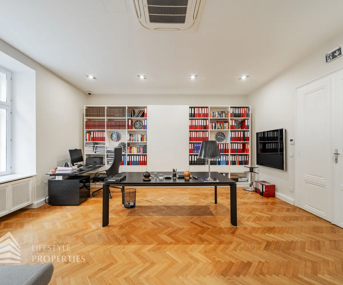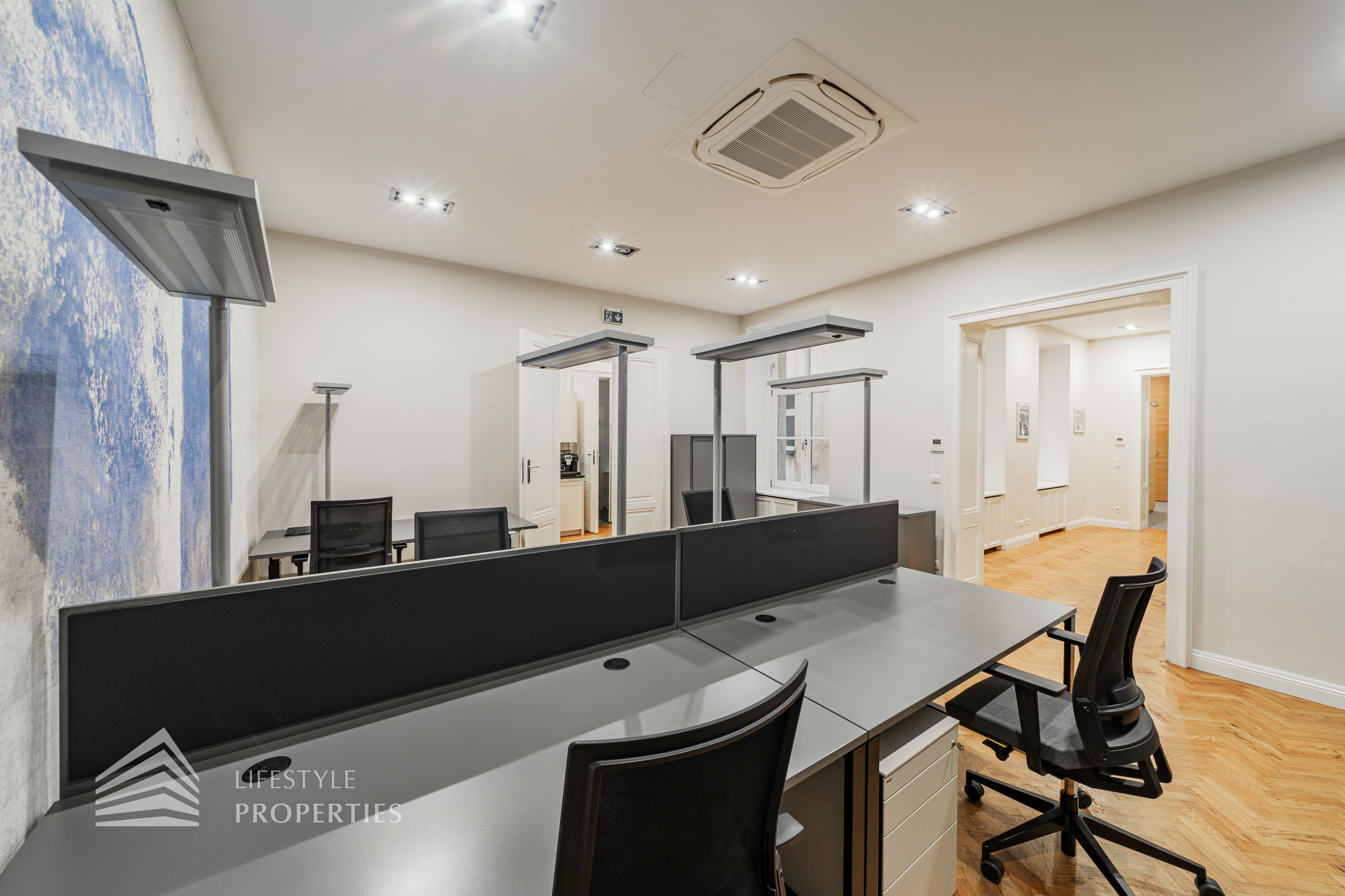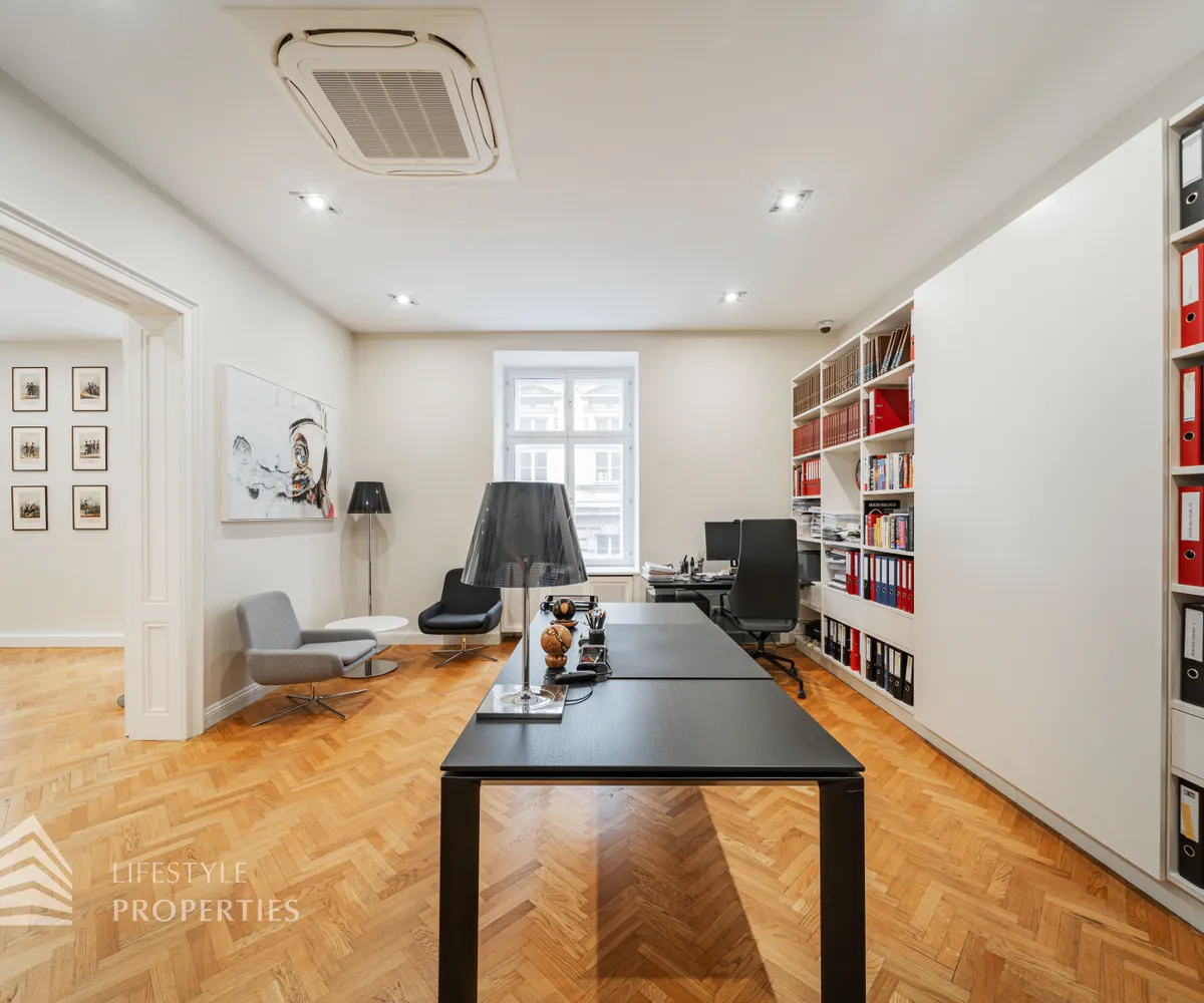 Das Büro befindet sich im zweiten Obergeschoss eines im Jahre 1850 erbauten, charmanten Altbaus. Die ca. 174 m² Fläche teilen sich auf in vier Büroräume, einen Empfangsraum und einer Küche. Das Büro ist durchwegs mit hochwertigem Parkett und exklusiven Fliesen ausgekleidet. Alle Räume sind klimatisiert und mit Kameras ausgestattet.