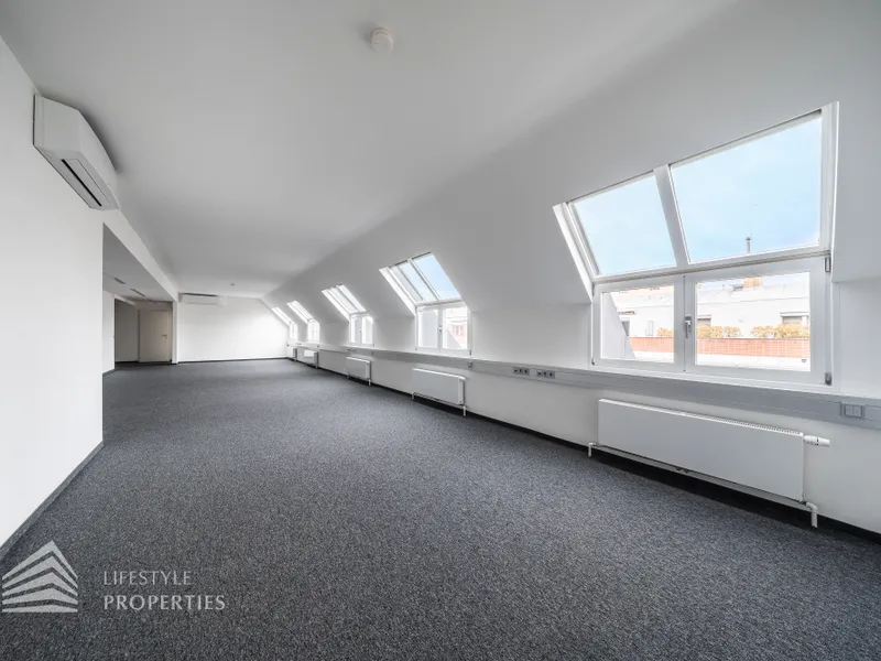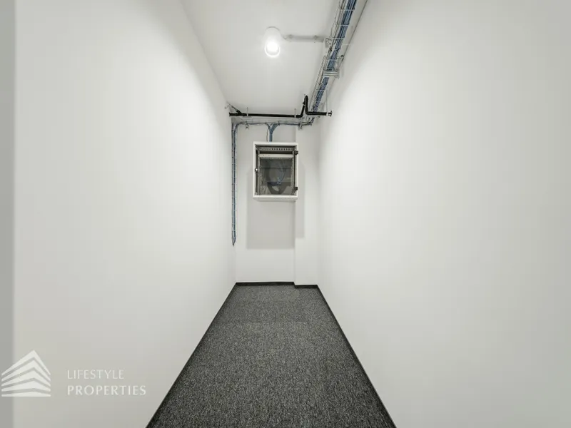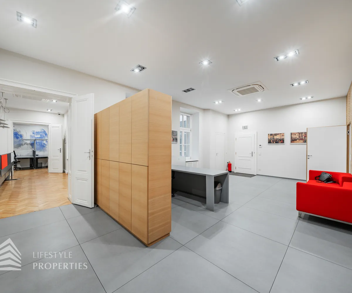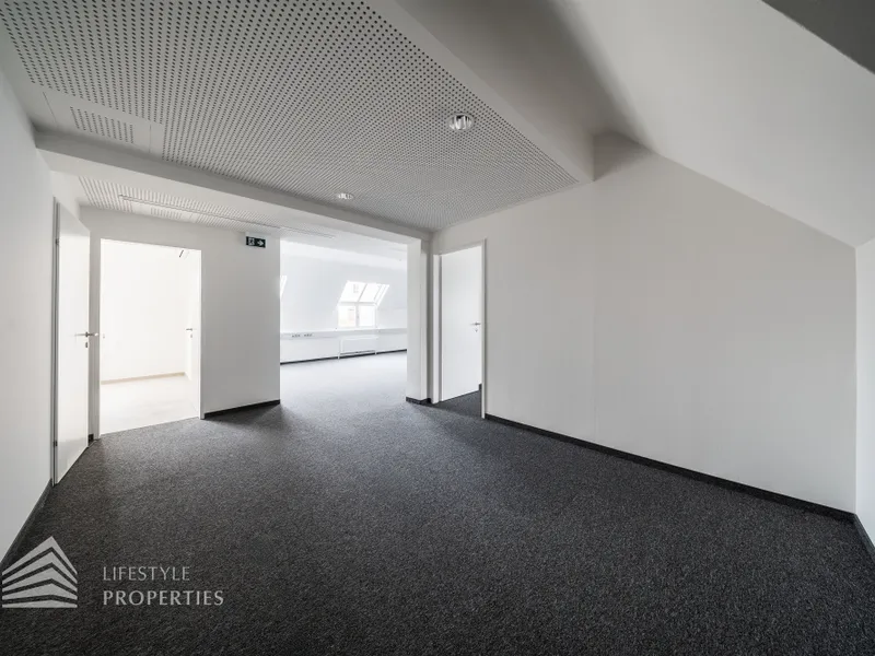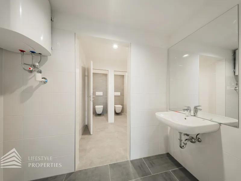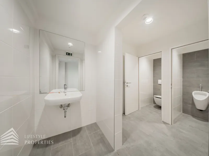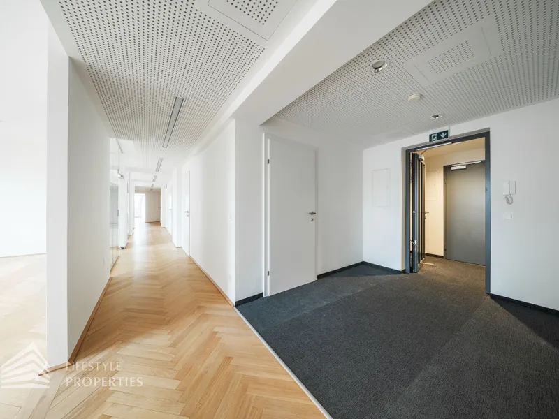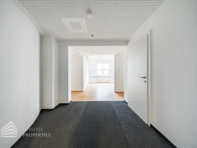 Sie betreten die Immobilie und gelangen direkt in den großen Empfangsraum mit einer Fläche von ca. 39,84 m², dieser mit exklusiven Fliesen ausgelegt ist. Auf der linken Seite gelangt man in den beeindruckenden Besprechungsraum mit einer Größe von ca. 31,35 m², von diesen man durch eine große Flügeltüre das ca. 27,65 m² große Chefbüro erreicht. Rückwerts beim Empfang befindet sich die Gästetoilette und der Serverraum. Des Weiteren erreichen Sie am Ende des Empfangs das Arbeitszimmer mit ca. 21,10 m², als auch den mit ca. 30,26 m² großen Büroraum. Anschließend befindet sich die Teeküche, ausgestattet mit allen Geräten sowie nebenan die Toilette für die Angestellten. Von dieser Seite erreicht man den Fluchtweg zum Stiegenhaus. Beheizt wird das Büro mittels Zentralheizung.