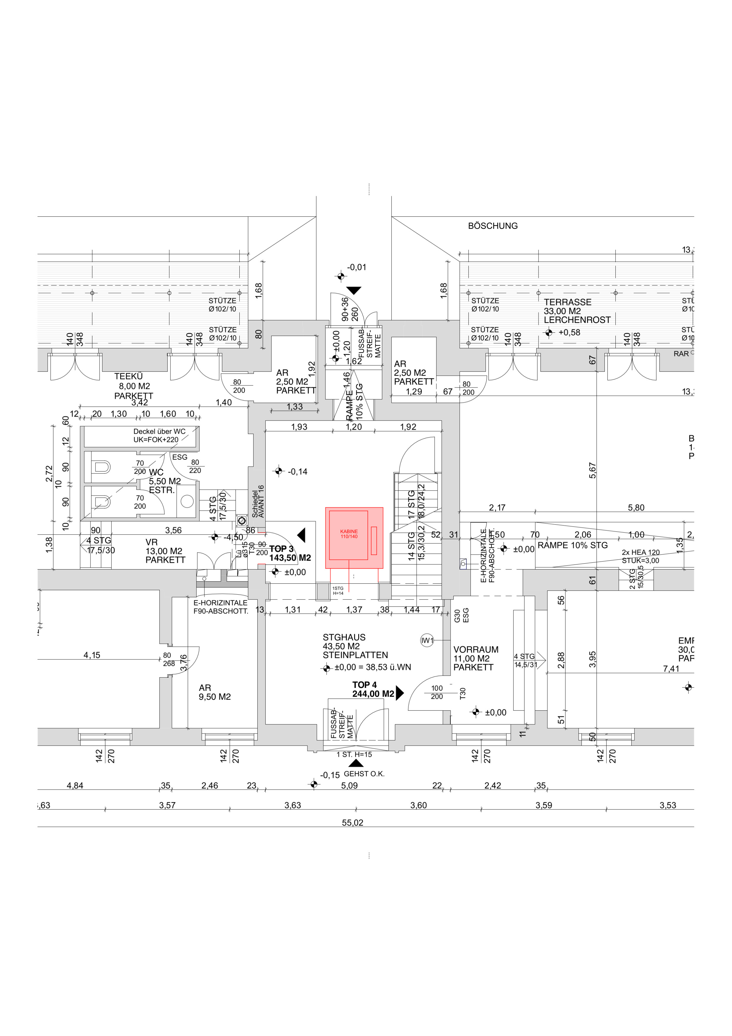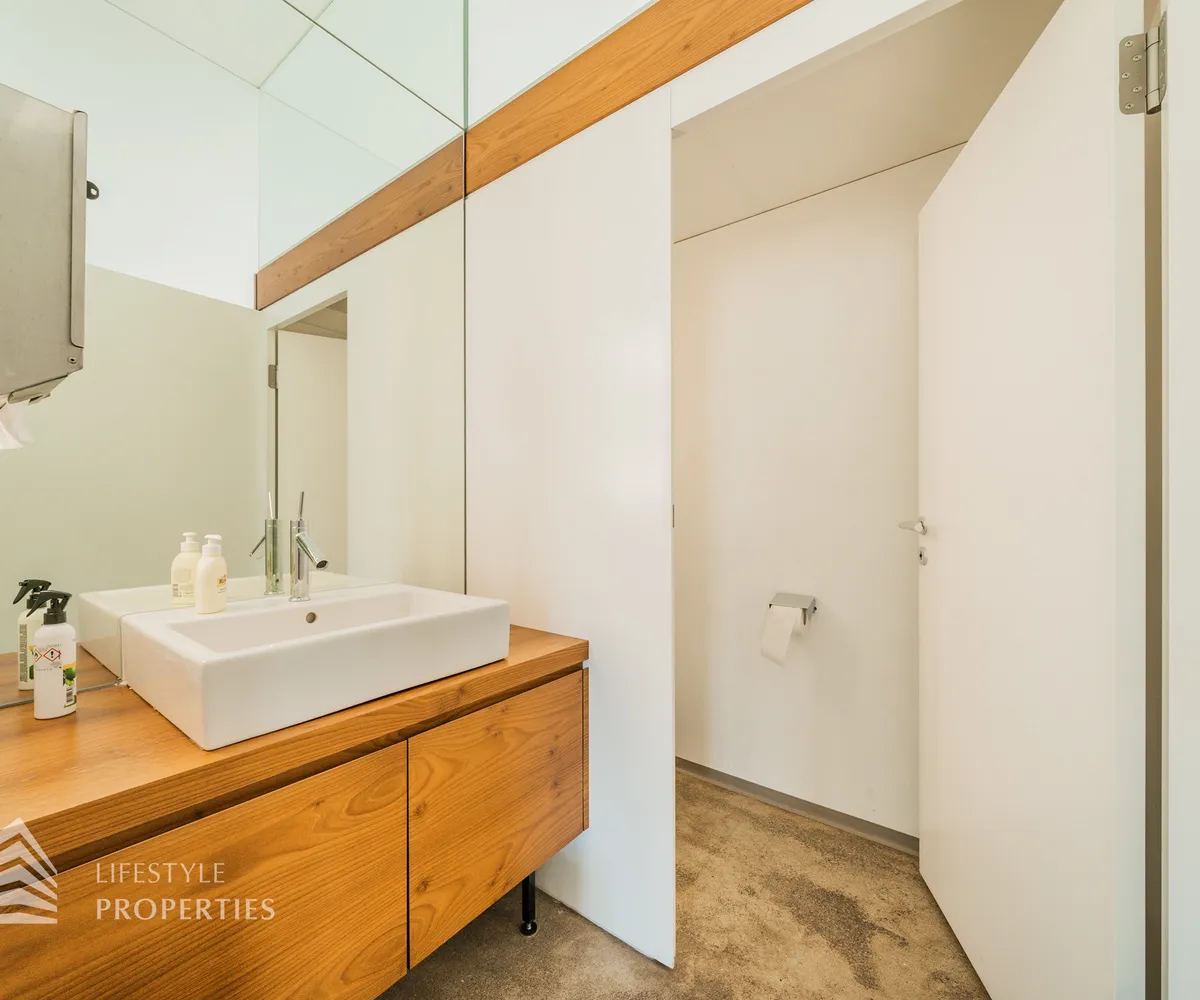 Aus dem großzügigen Vorraum gelangt man in den 1. großen Raum in welchem sich links genügend Platz für eine Ablagefläche/Aktenschränke oder anderes bietet. Rechts geht es in die weiteren Räume welche nacheinander angelegt sind und mit modernen Glaselementen getrennt wurden und so genügend Licht durchlassen. Die zwei Toiletten befinden sich in der Mitte. Die praktische Teeküche lässt sich direkt aus dem Vorraum betreten.