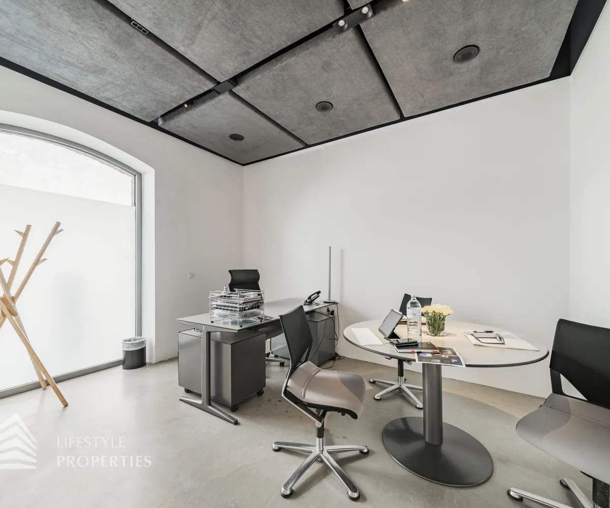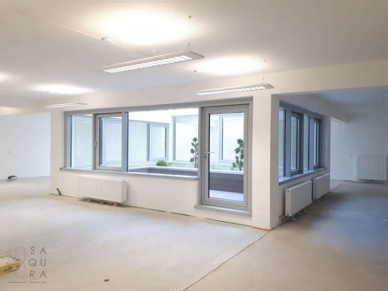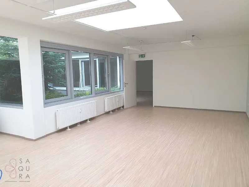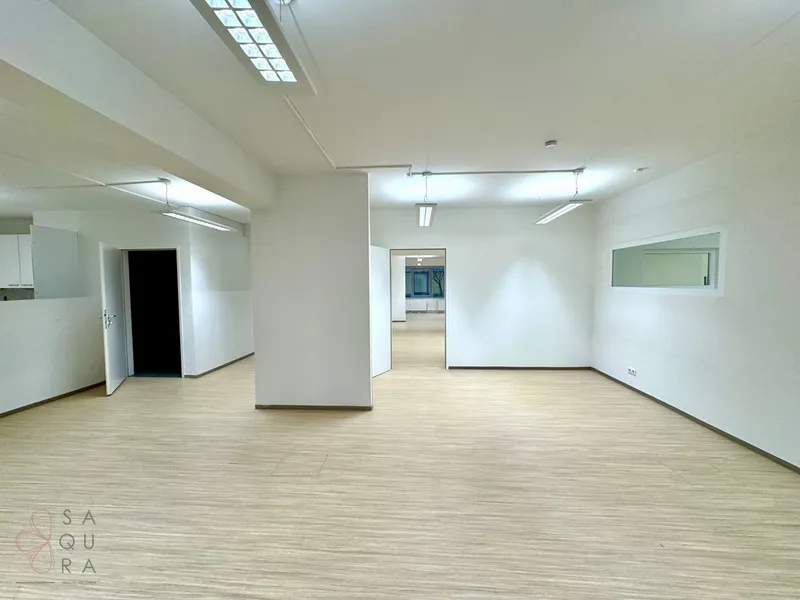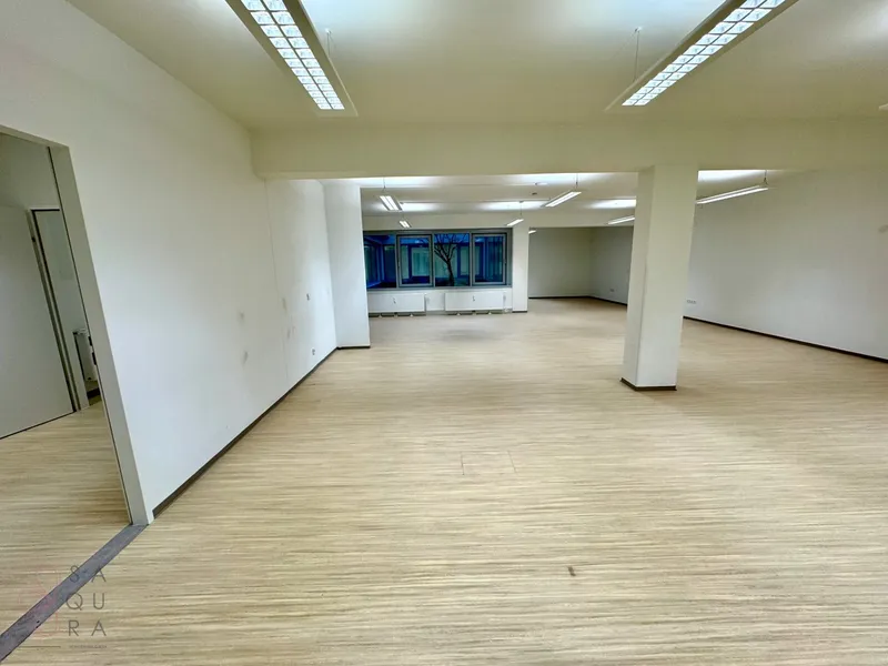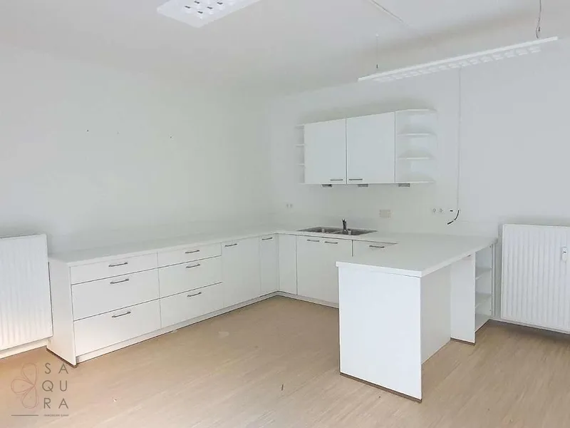 Die Bürofläche zeichnet sich durch die offene Raumgestaltung aus. Viele große Fenster versorgen die Räumlichkeiten mit viel Licht und schaffen eine angenehme Arbeitsatmosphäre. Die Küche ist mit modernen Geräten ausgestattet und verfügt über ausreichend Stauraum.