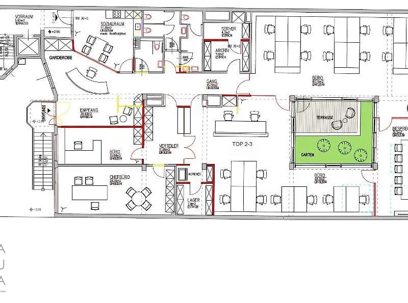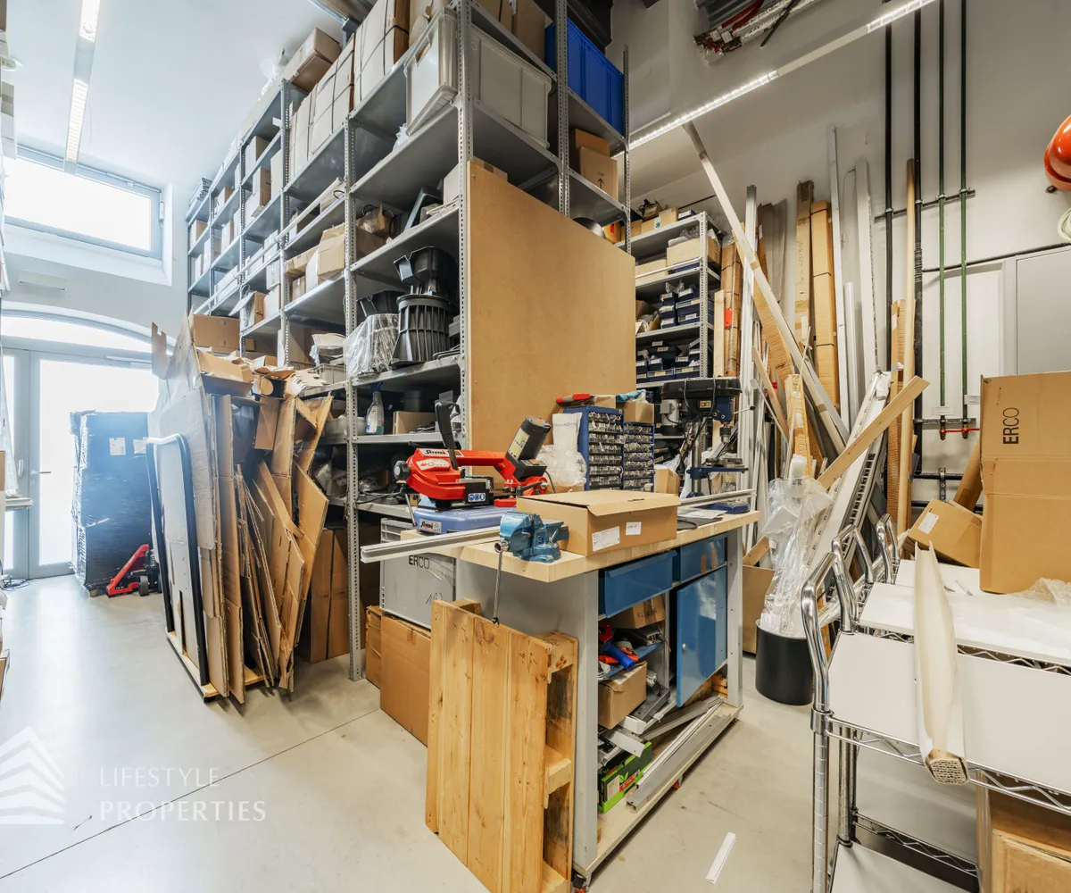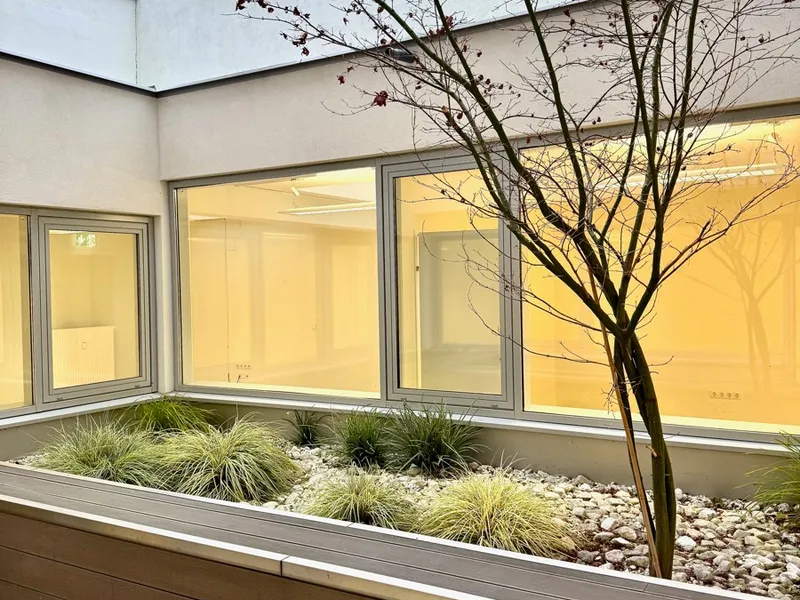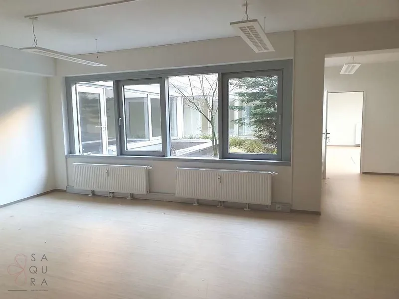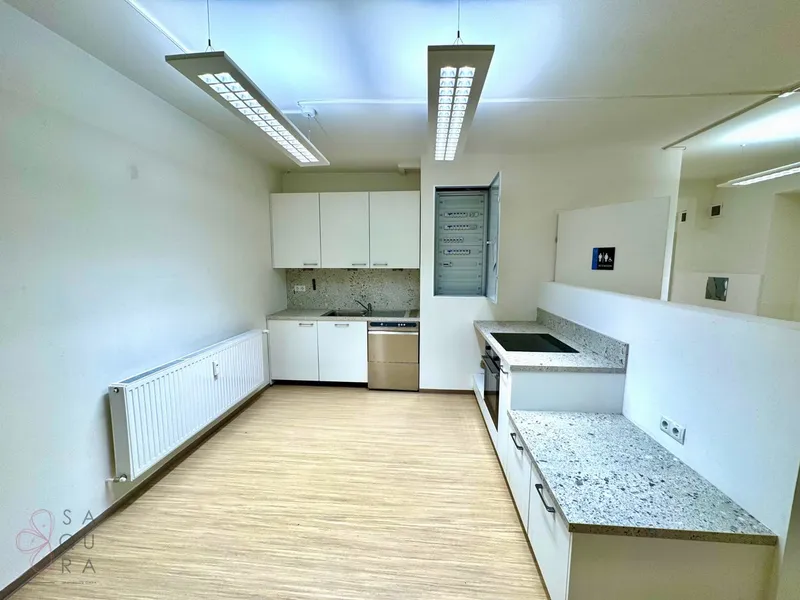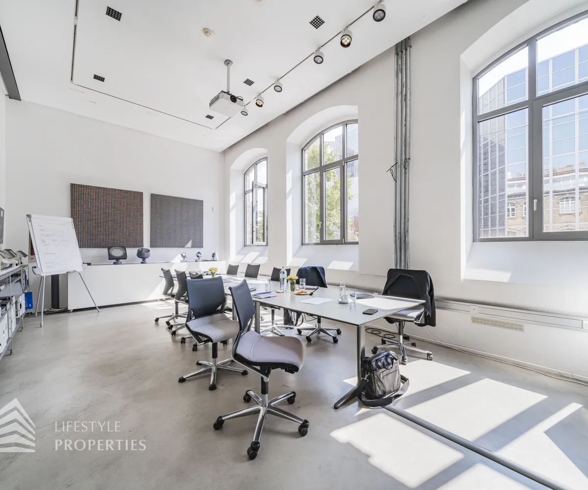 Die Bürofläche zeichnet sich durch die offene Raumgestaltung aus. Viele große Fenster versorgen die Räumlichkeiten mit viel Licht und schaffen eine angenehme Arbeitsatmosphäre. Die Küche ist mit modernen Geräten ausgestattet und verfügt über ausreichend Stauraum.