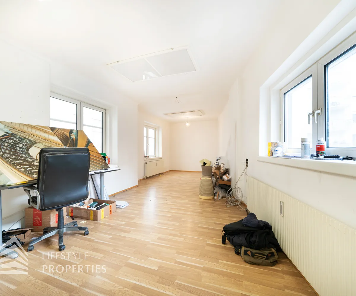 Dieses außergewöhnliche Objekt liegt im Mezzanin eines sehr gepflegten Hauses, welches um 1900 erbaut wurde und besitzt daher keinen Lift. Insgesamt stehen Ihnen ca. 100,18 m² Nutzfläche zur Verfügung. Durch die Struktur des Gebäudes ergibt sich ein Schnitt der Wohnräume in einer langen Trapez-Form, welche die Räume besonders ausgefallen macht. Im großzügigen Vorraum, welcher als einziger eine rechteckige Form besitzt, befinden sich eine Küchenzeile, ein Badezimmer und eine Toilette. Folgend betreten Sie einen überragenden Raum mit einer Größe von ca. 50 m², welcher insgesamt sieben Fenster besitzt, wovon drei davon in den Innenhof führen. Durch die Form und den Umfang entsteht hier ein Gefühl in einem Loft oder in einem Atelier zu residieren. Ein separates Zimmer mit ca. 32 m² liegt im Anschluss daran und bietet ausreichend Platz als Lagerraum oder zweiten Büroraum.