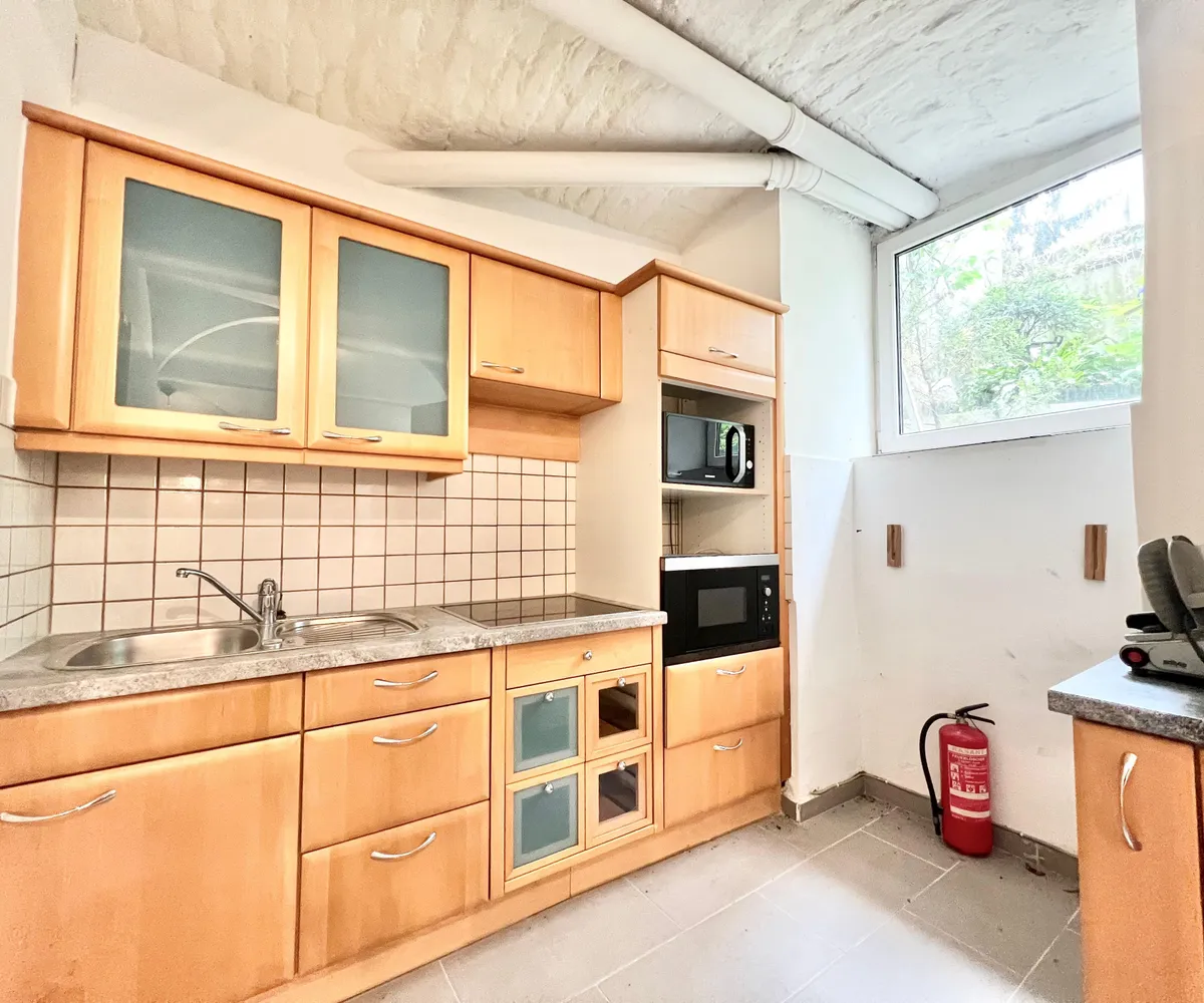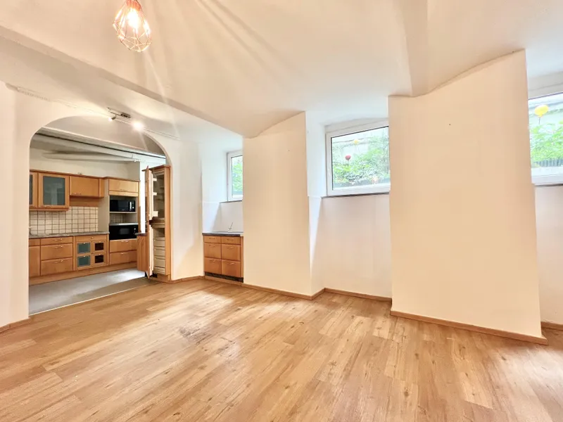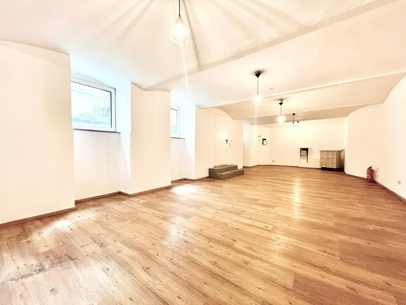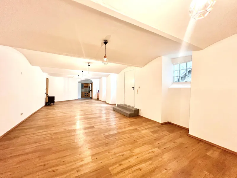 Der Zugang erfolgt über wenige Stufen direkt vom Innenhof. Der große Hauptraum mit Gewölbedecke und mehreren Fenstern bietet flexible Nutzungsmöglichkeiten. Zusätzlich stehen eine voll ausgestattete Küche sowie ein Badezimmer mit Dusche, Waschbecken und WC zur Verfügung.