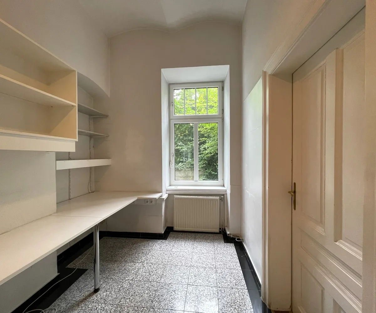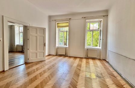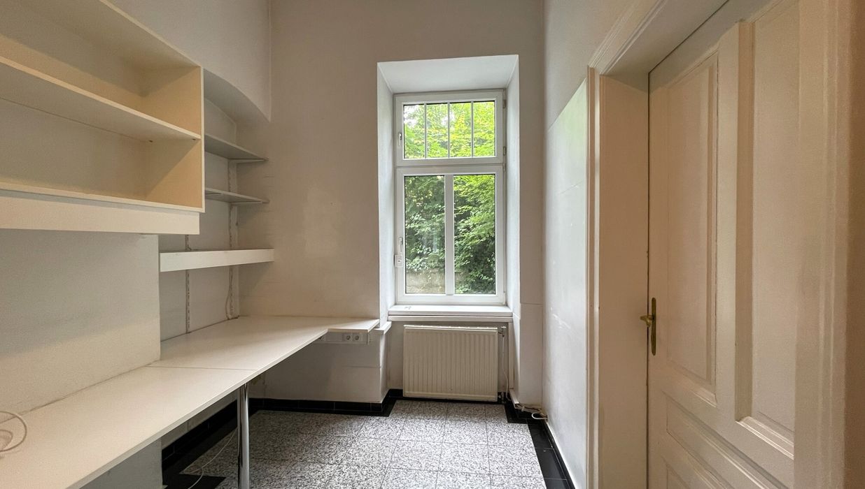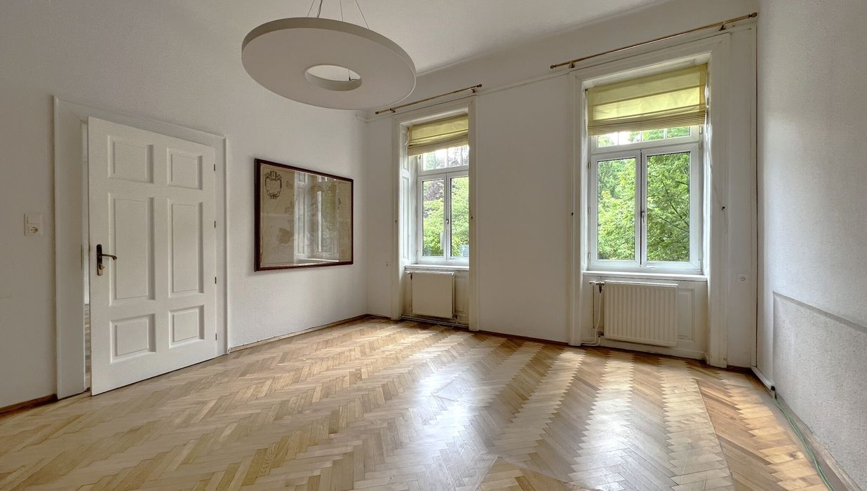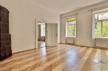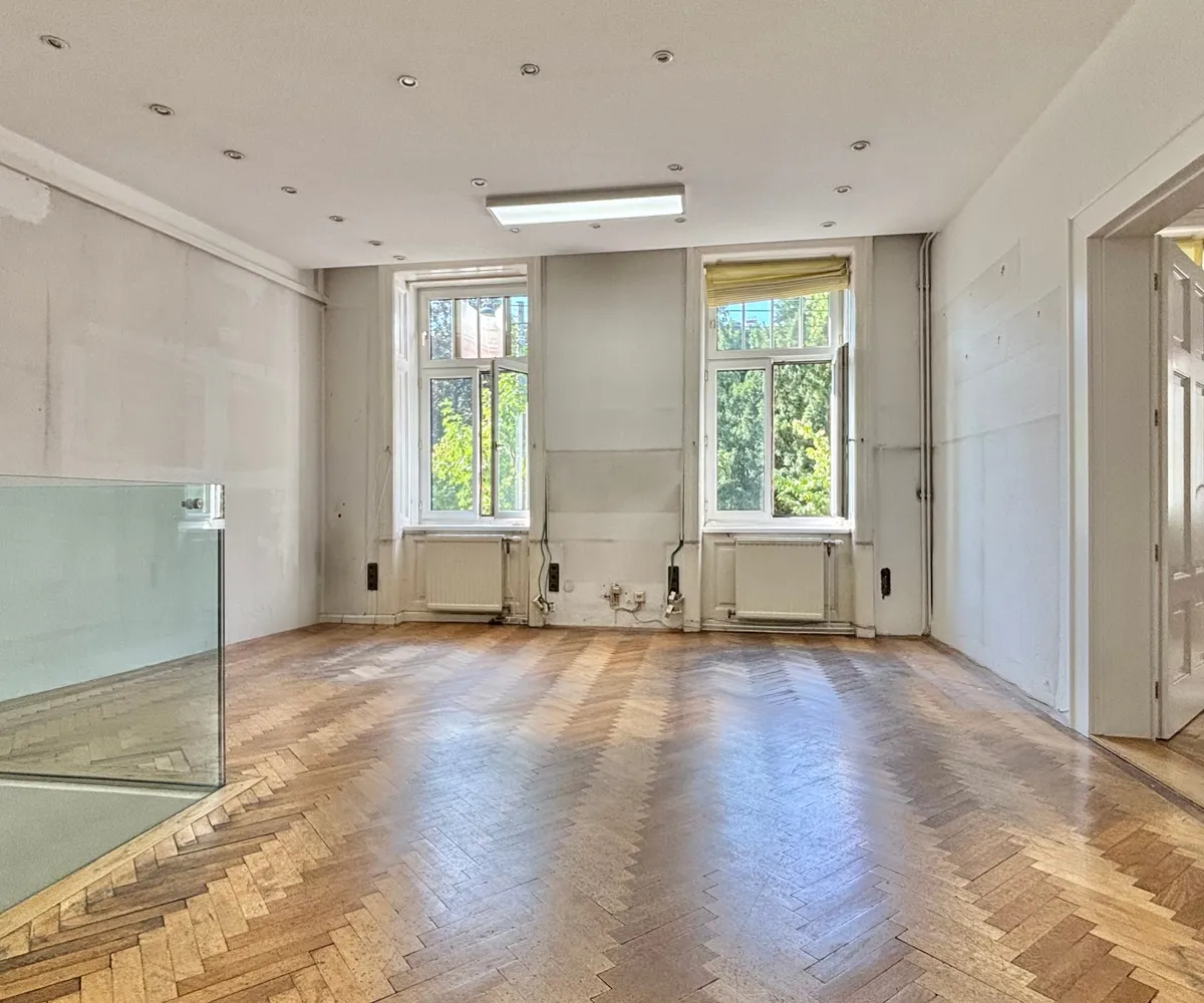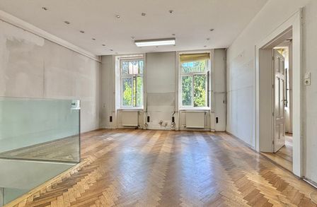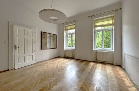 Die große 4-Zimmer-Hochparterrewohnung und das 2-Zimmer-Souterrain werden auch von der gut frequentierten Straße aus gesehen und eignen sich miteinander daher ideal als repräsentatives Büro, als Kanzlei oder Privatordination. Die hohen Altbauräume in Verbindung mit den Parkettböden vermitteln eintretenden Personen ein gediegenes Ambiente. Über eine breite Holztreppe gelangt man in das sehr schön ausgebaute und helle Souterrain. OPTION: Die Wohnung kann auch ohne Souterrain gekauft werden: es verbleiben dann 118m² Wohnfläche zum Preis von € 499.000,--. Die Verbindung zwischen Wohnung und Souterrain erfolgt durch den Verkäufer)