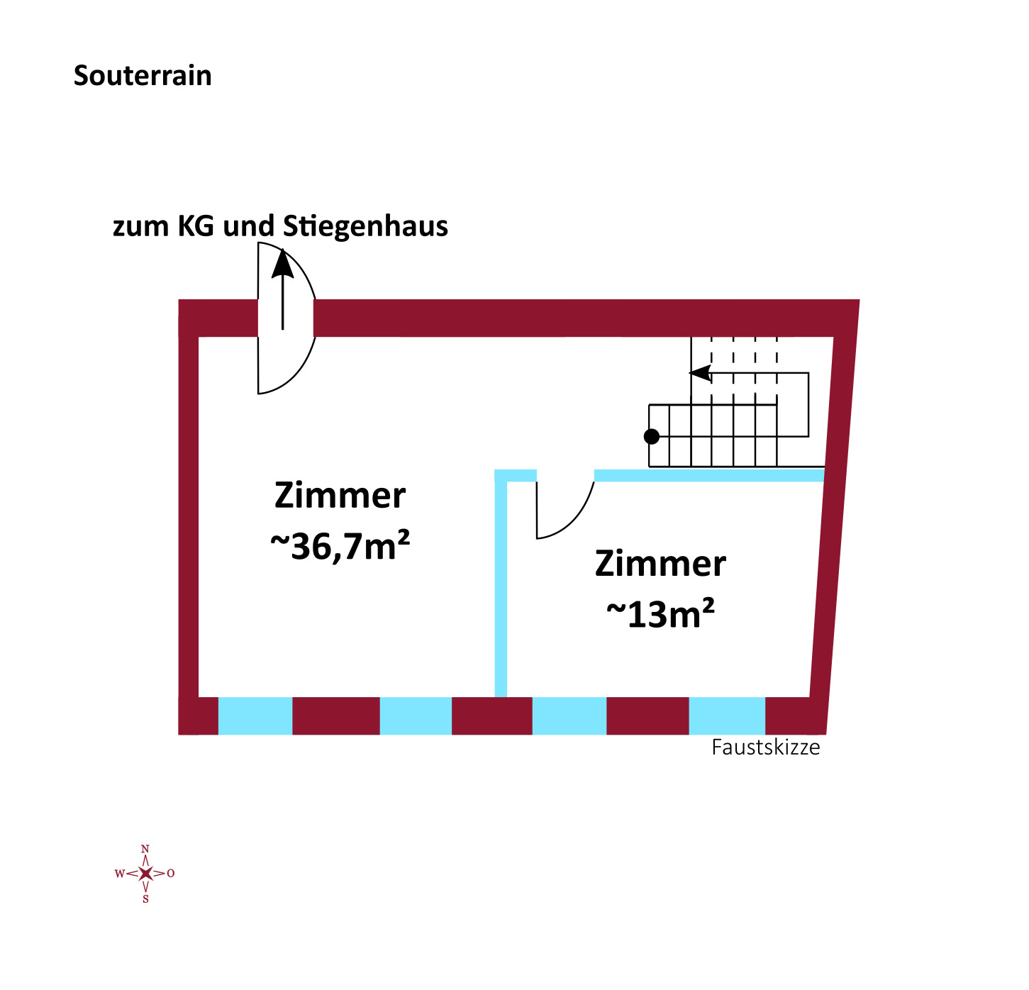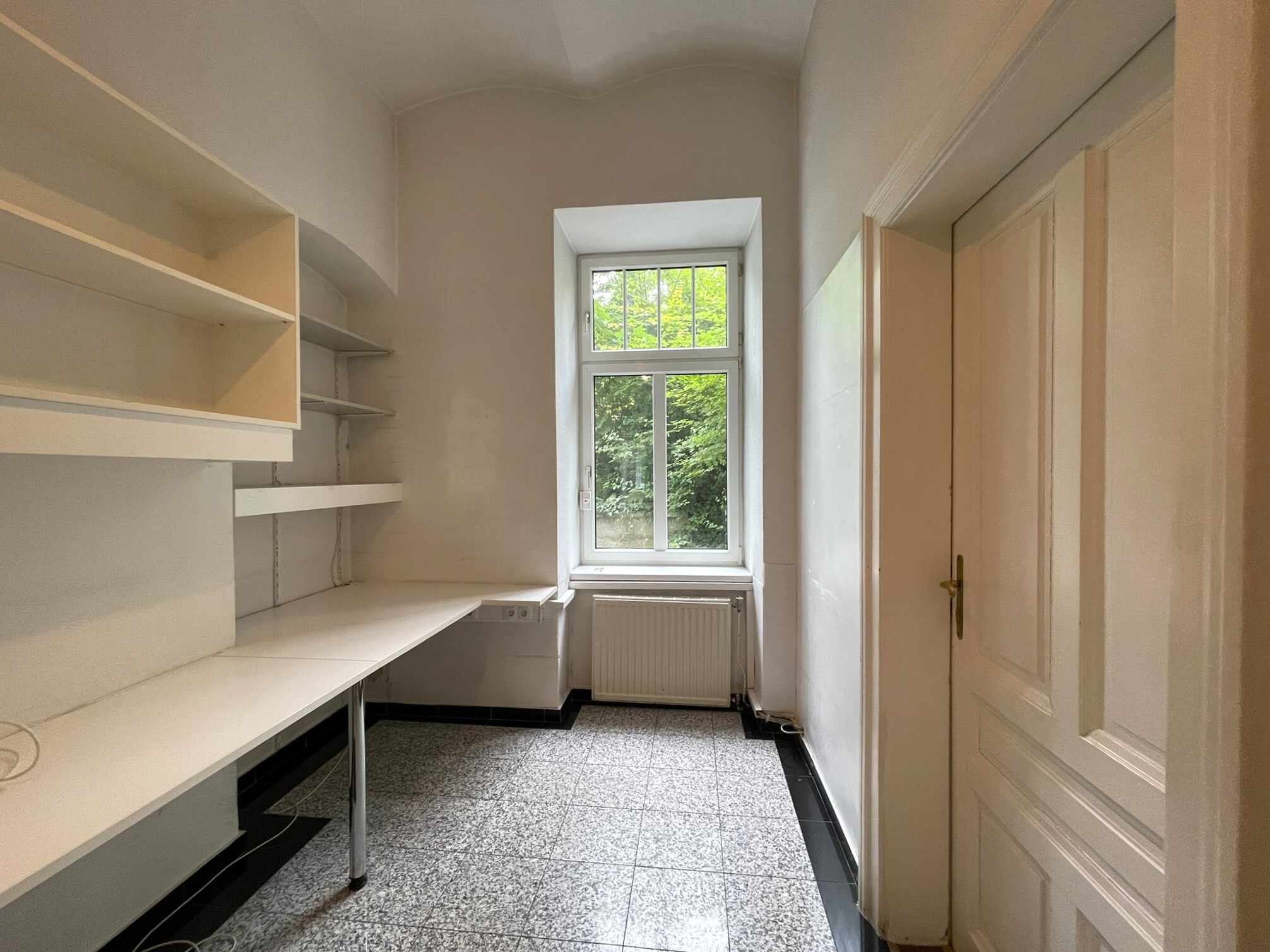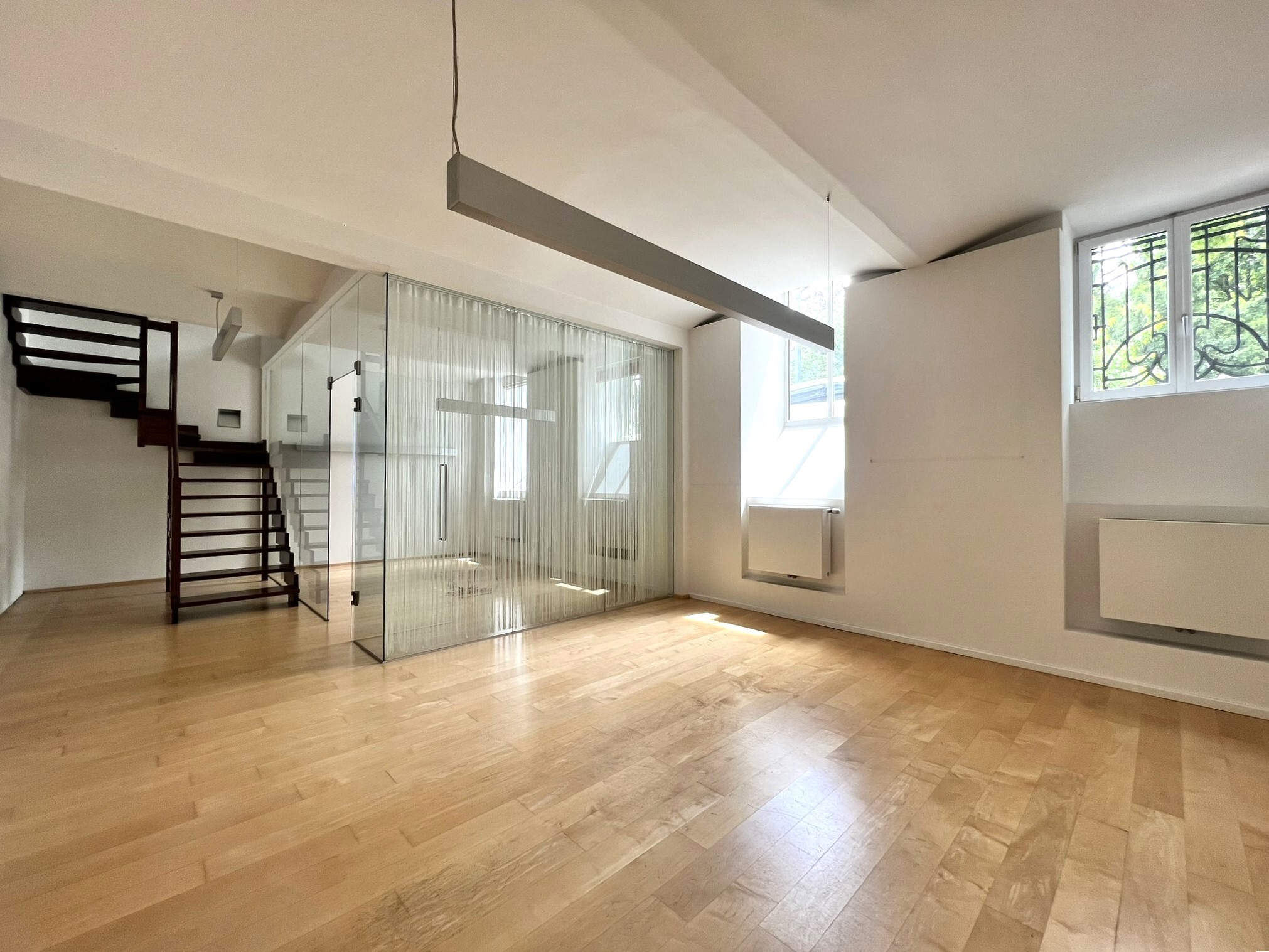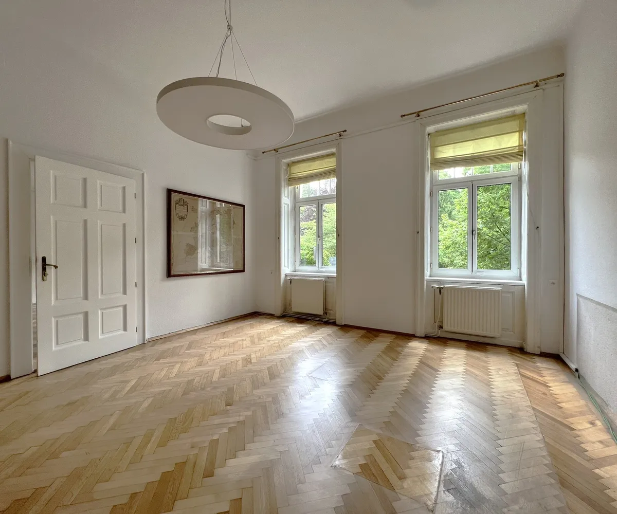 Die große 4-Zimmer-Hochparterrewohnung und das 2-Zimmer-Souterrain werden auch von der gut frequentierten Straße aus gesehen und eignen sich miteinander daher ideal als repräsentatives Büro, als Kanzlei oder Privatordination. Die hohen Altbauräume in Verbindung mit den Parkettböden vermitteln eintretenden Personen ein gediegenes Ambiente. Über eine breite Holztreppe gelangt man in das sehr schön ausgebaute und helle Souterrain. OPTION: Die Wohnung kann auch ohne Souterrain gekauft werden: es verbleiben dann 118m² Wohnfläche zum Preis von € 499.000,--. Die Verbindung zwischen Wohnung und Souterrain erfolgt durch den Verkäufer)