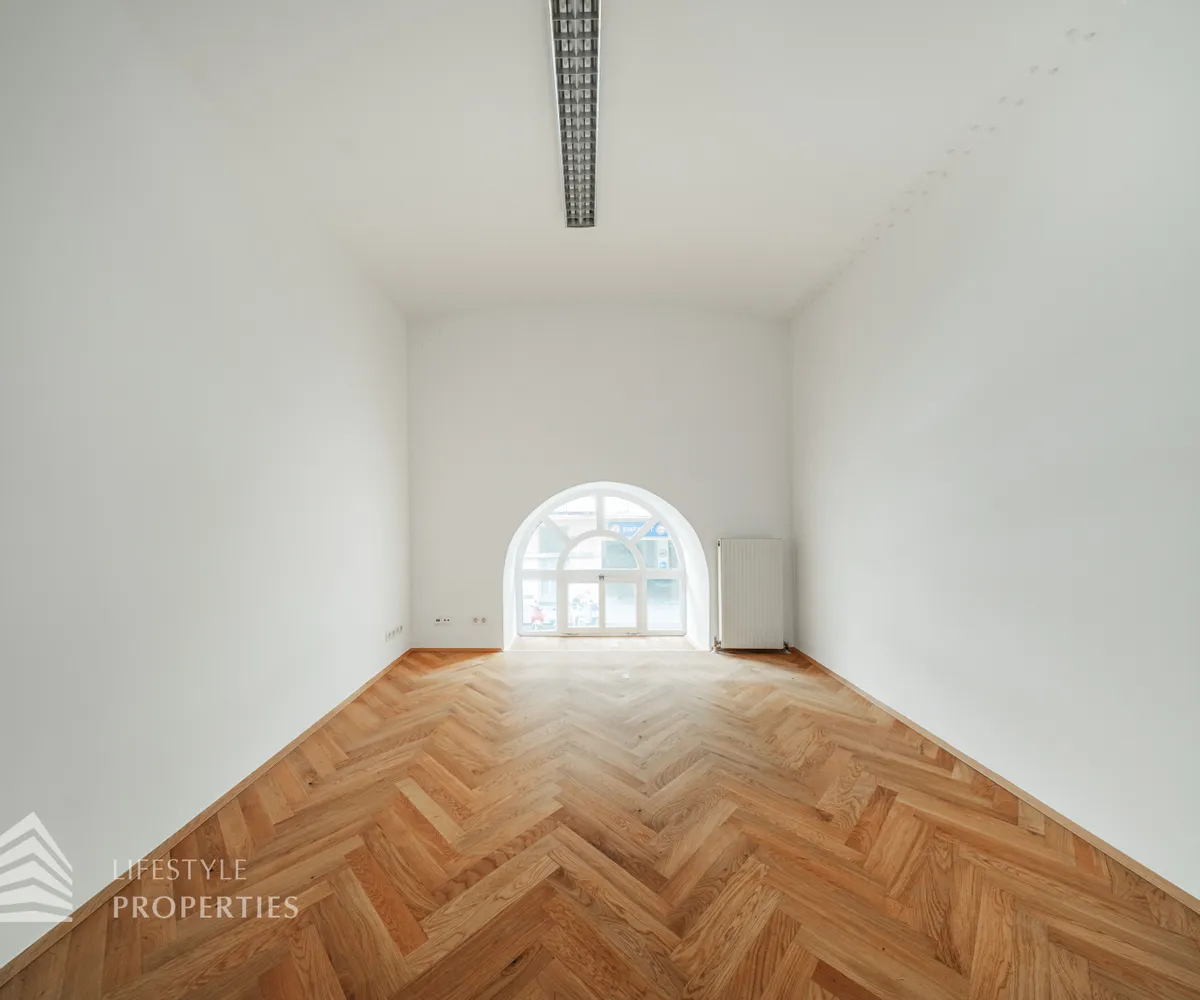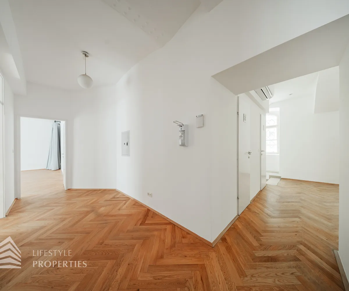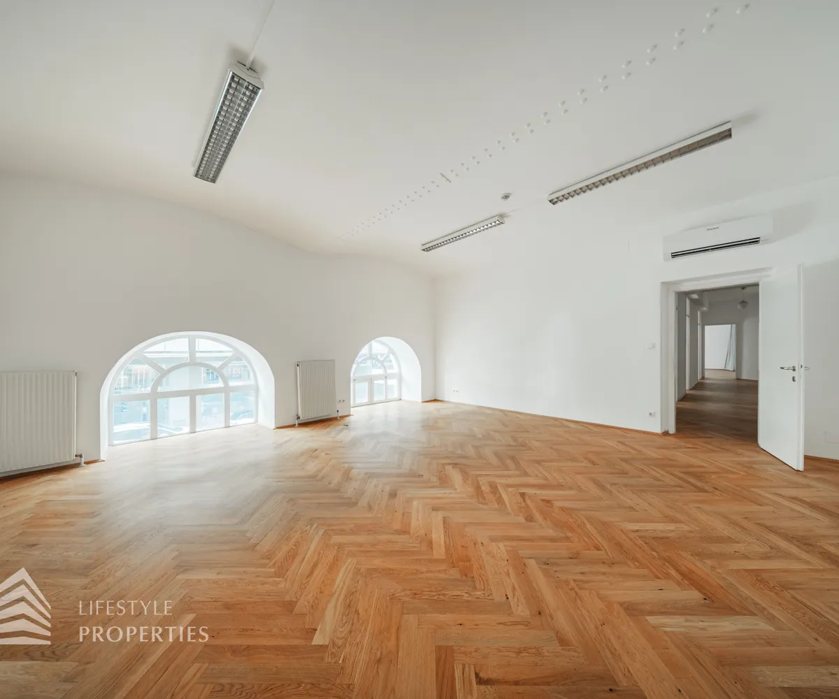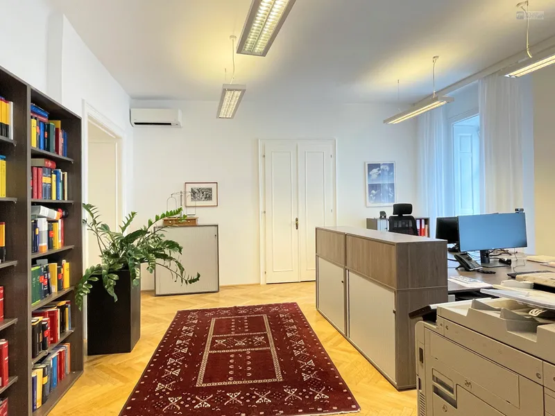 Beim Betreten des Büros steht man direkt im ca. 18 m² großen Empfang, wo sich auf der rechten Seite zwei Toiletten befinden. Geradeaus vom Empfang gelangt man in die Küche, diese mit allen Geräten ausgestattet ist und über viel Stauraum verfügt. Durch einen Gang gelangt man zu den fünf zentral begehbaren Büroräumen, diese von einer Größe über 29,50 m², 12,05 m², 11,32 m², 14 m² und 36,54 m² verfügen. Alle Räume sind mit einen Fischgrät-Parkettboden ausgelegt und verfügen über eine Klimaanlage.