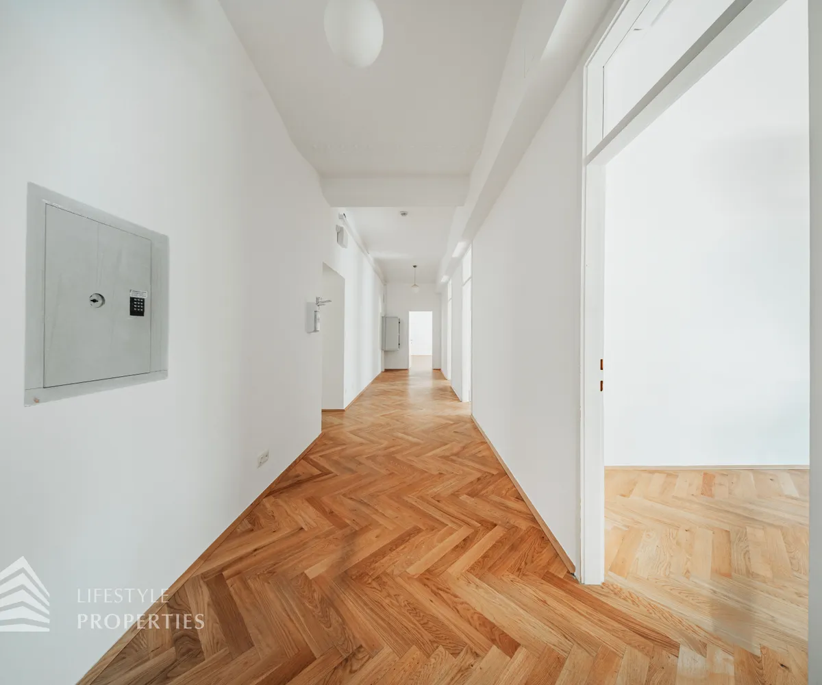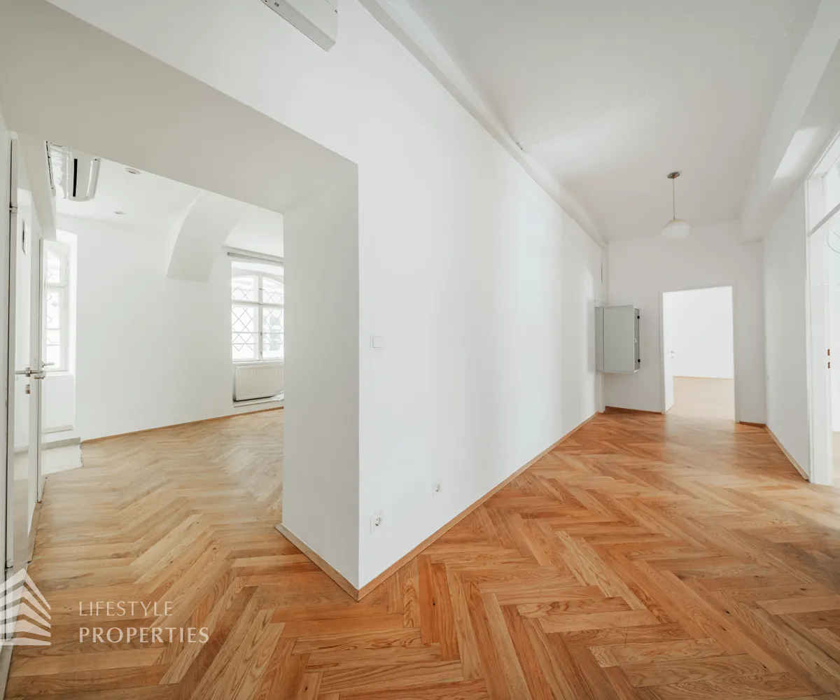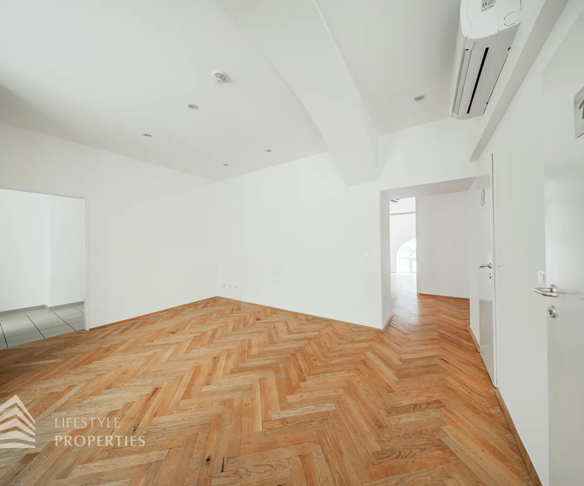 Beim Betreten des Büros steht man direkt im ca. 18 m² großen Empfang, wo sich auf der rechten Seite zwei Toiletten befinden. Geradeaus vom Empfang gelangt man in die Küche, diese mit allen Geräten ausgestattet ist und über viel Stauraum verfügt. Durch einen Gang gelangt man zu den fünf zentral begehbaren Büroräumen, diese von einer Größe über 29,50 m², 12,05 m², 11,32 m², 14 m² und 36,54 m² verfügen. Alle Räume sind mit einen Fischgrät-Parkettboden ausgelegt und verfügen über eine Klimaanlage.