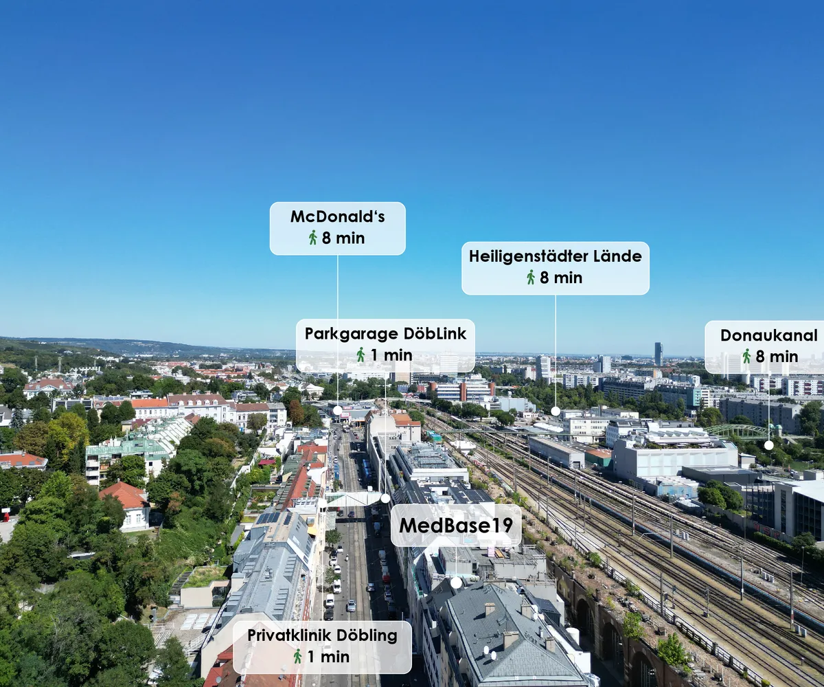 An der Adresse Heiligenstädter Straße 38, direkt gegenüber der Privatklinik Döbling, befindet sich das MedBase19, welches auf 4 Geschoßen zahlreiche Ordinationseinheiten bietet. Die äußerst repräsentative Lage auf der Heiligenstädter Straße direkt gegenüber der Privatklinik, nur 4 Gehminuten von der U4/U6 Station Spittelau sowie der Straßenbahnhaltestelle D entfernt und in unmittelbarer Nachbarschaft zahlreicher Betriebe und Büros, garantiert hohe Frequenz und beste Patienten-Zielgruppen.