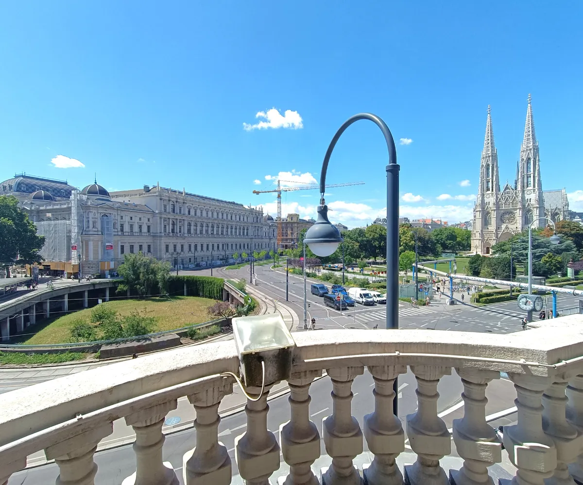 Einmalig ist der langläufige Balkon mit Südwest-Ausrichtung, welcher vom Konferenzzimmer aus betreten werden kann und einen beeindruckenden, exklusiven Ausblick auf die Votivkirche, den Sigmund-Freud-Park und die Universität Wien bietet. So großzügig wie die Fläche selbst präsentierten sich auch die restlichen Räume. Ihren Mitarbeitern steht eine Küche mit einer Fläche von rund 28 m² zur Verfügung. Ausreichend Platz für den Essbereich ist vorhanden und die Einbauküche selbst verfügt über einen Geschirrspüler, Kühlschrank und separaten Gefrierschrank - zum aktuellen Zeitpunkt jedoch über kein Kochfeld! Neben Damen- und Herrentoilette (mit Pissoir) steht eine zusätzliche Mitarbeitertoilette mit praktischem Waschraum zur Verfügung. Sämtliche Sanitärräume verfügen über hochwertige, großflächige Fliesen und jeweils 2 Handwaschbecken.