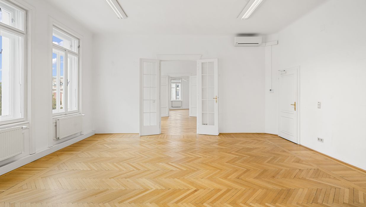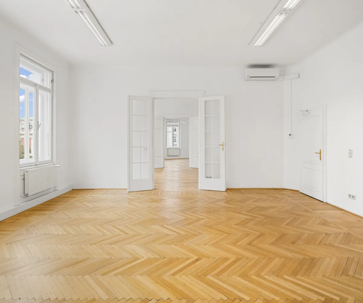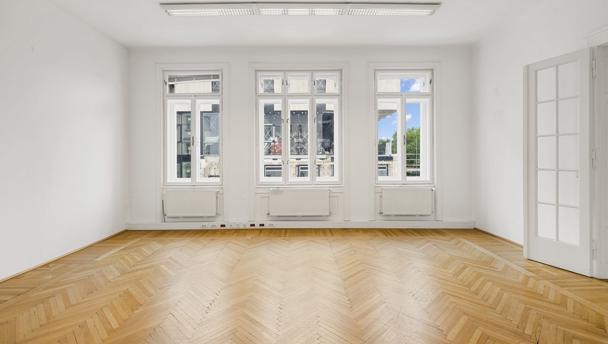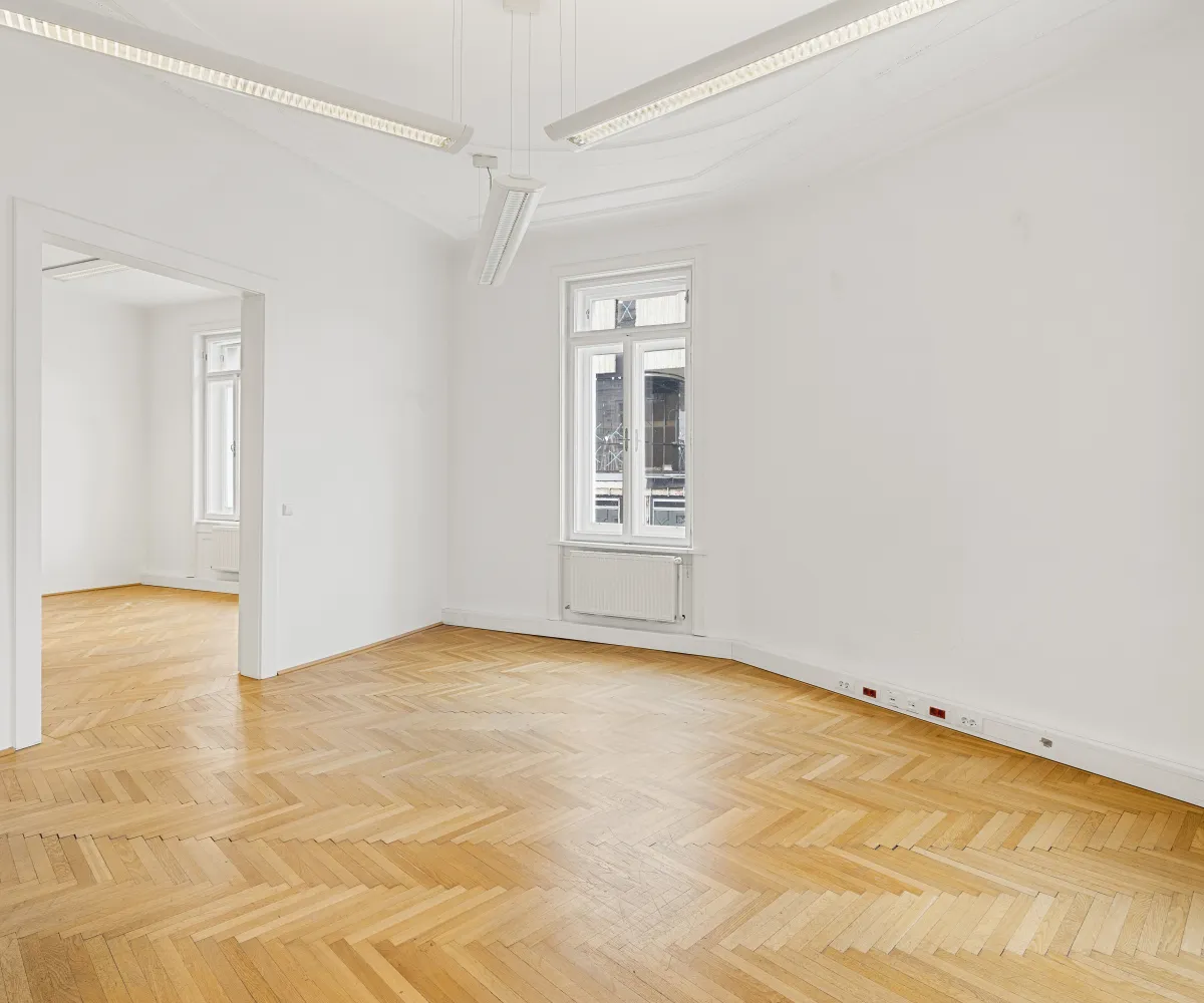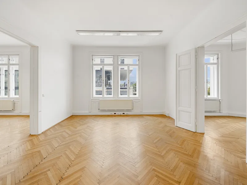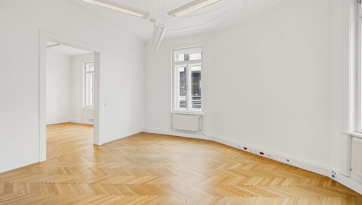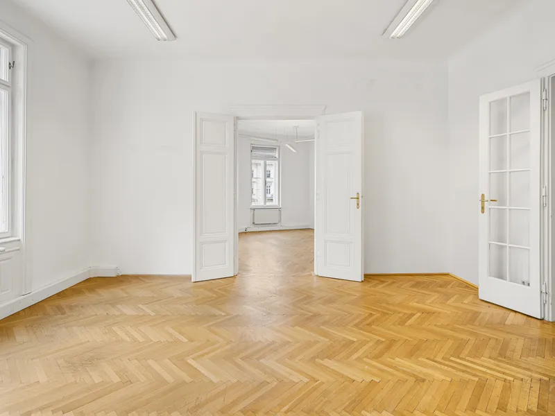 Die Gesamtfläche ist großzügig geschnitten und bietet eine durchdachte Raumaufteilung, die sowohl effiziente Teamarbeit als auch Rückzugsmöglichkeiten ermöglicht. Dank der eleganten Fischgrätparkettböden, hohen Räume und großen Fensterflächen präsentiert sich das Büro hell, modern und zugleich mit klassischem Wiener Altbau-Charakter.