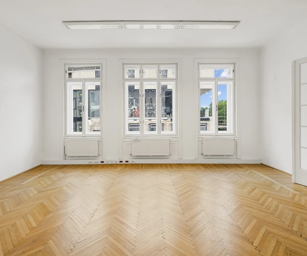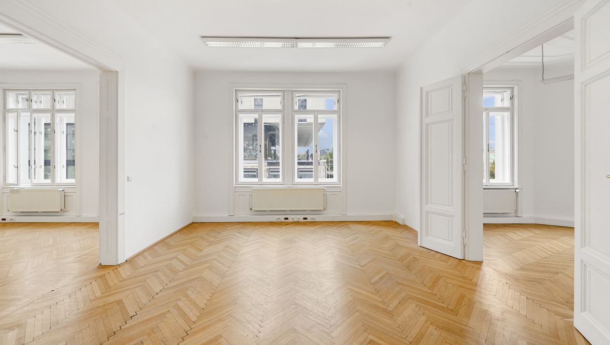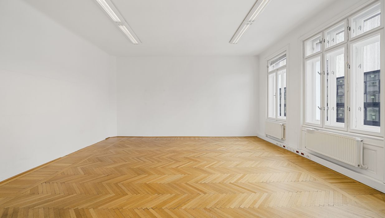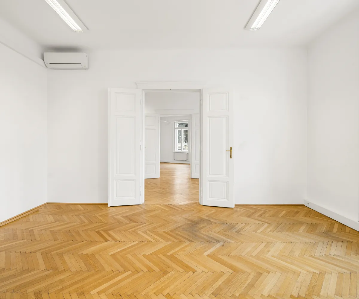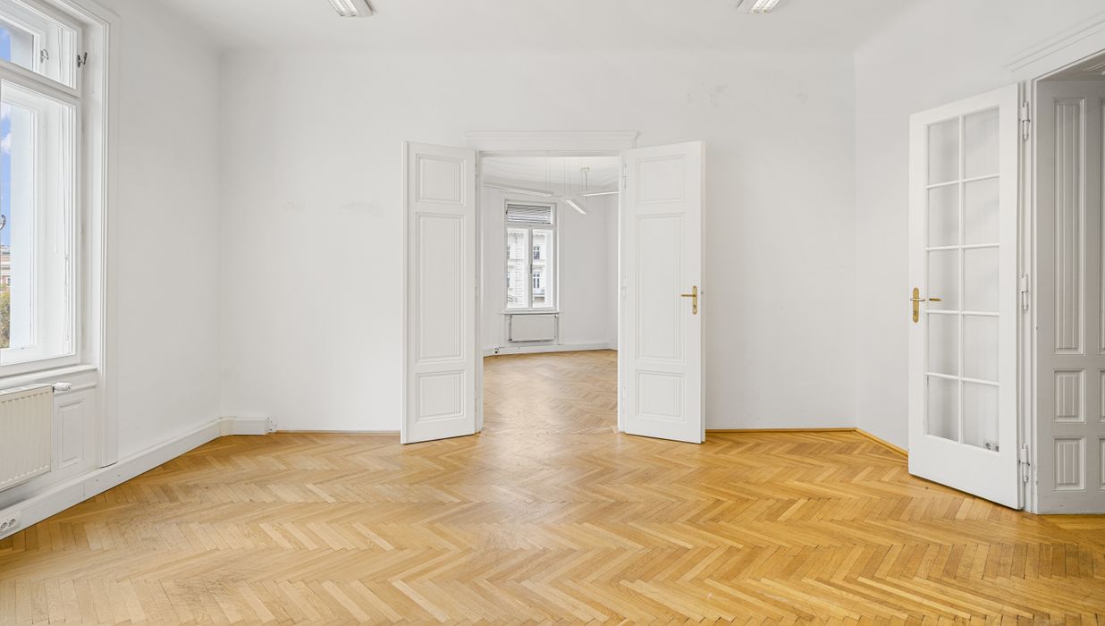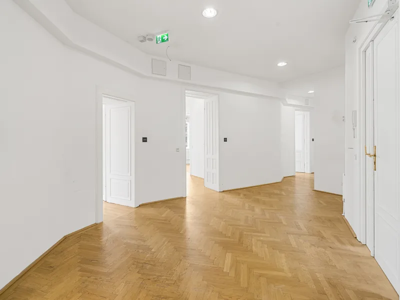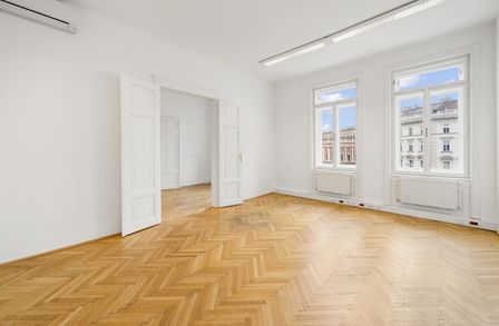 Die Gesamtfläche ist großzügig geschnitten und bietet eine durchdachte Raumaufteilung, die sowohl effiziente Teamarbeit als auch Rückzugsmöglichkeiten ermöglicht. Dank der eleganten Fischgrätparkettböden, hohen Räume und großen Fensterflächen präsentiert sich das Büro hell, modern und zugleich mit klassischem Wiener Altbau-Charakter.