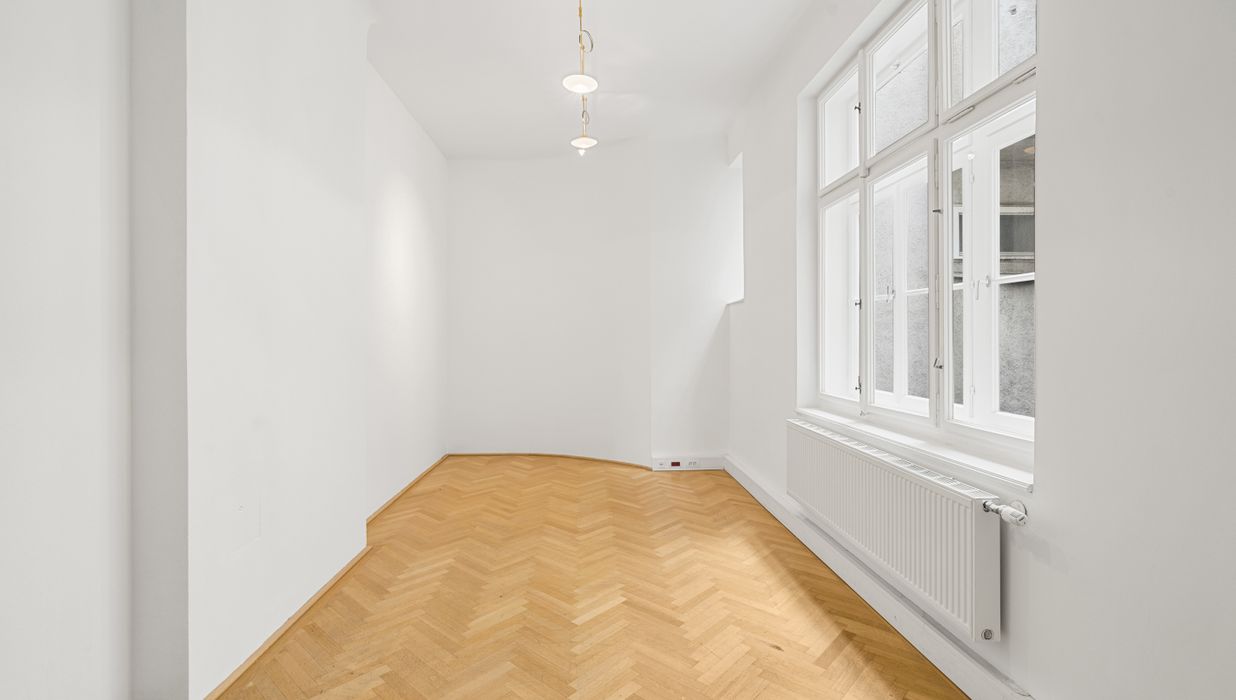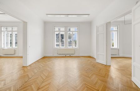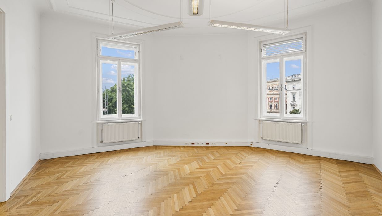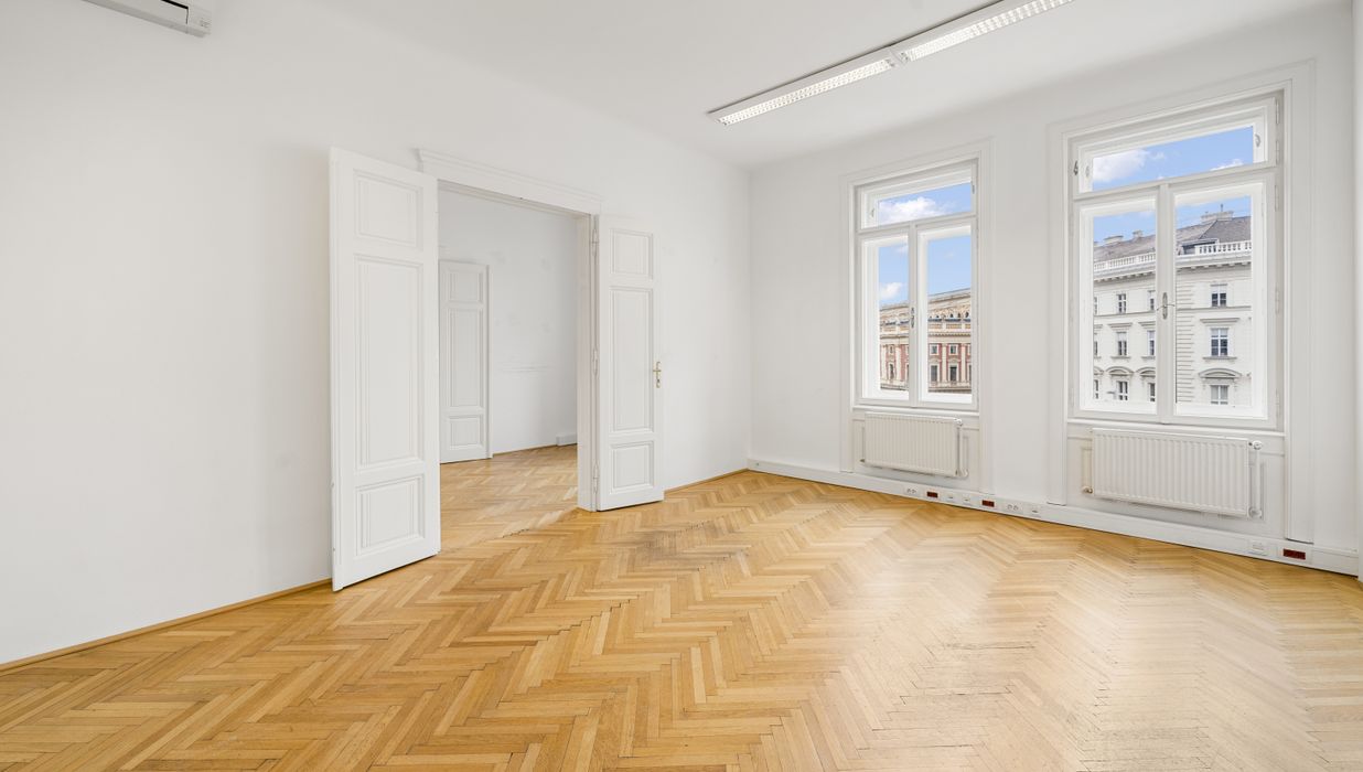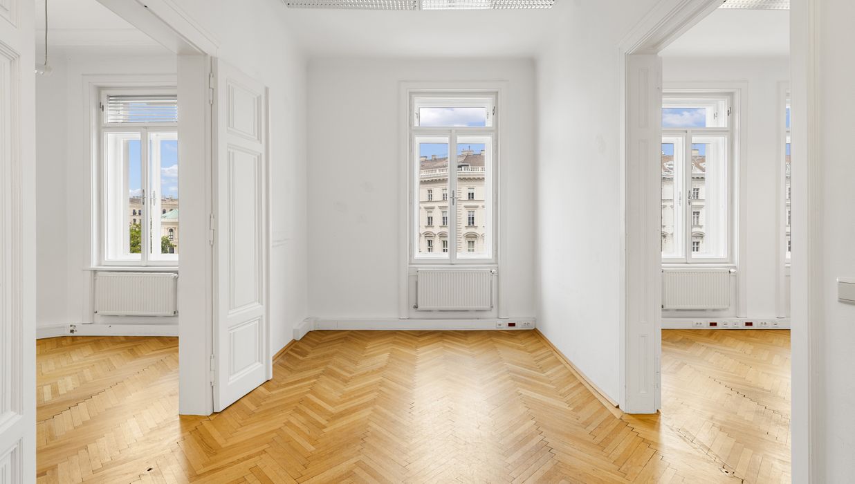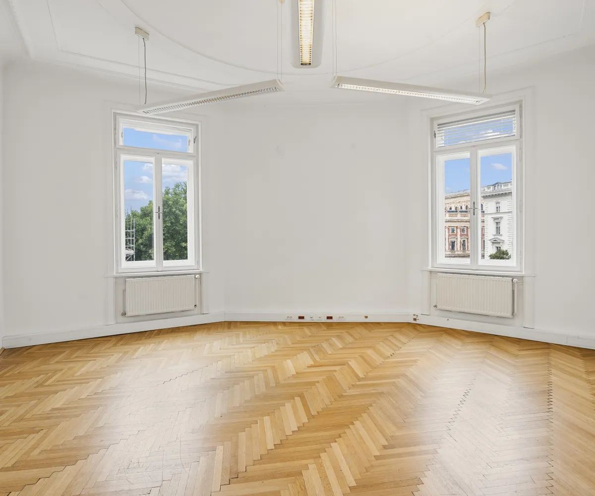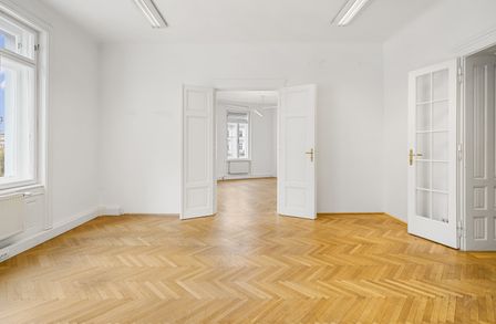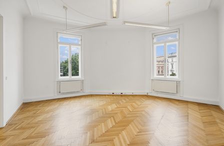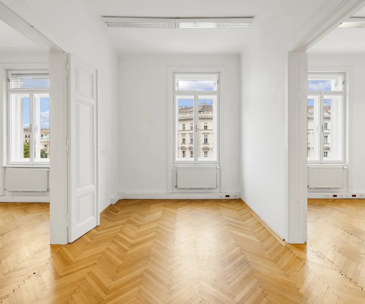 Die Gesamtfläche ist großzügig geschnitten und bietet eine durchdachte Raumaufteilung, die sowohl effiziente Teamarbeit als auch Rückzugsmöglichkeiten ermöglicht. Dank der eleganten Fischgrätparkettböden, hohen Räume und großen Fensterflächen präsentiert sich das Büro hell, modern und zugleich mit klassischem Wiener Altbau-Charakter.