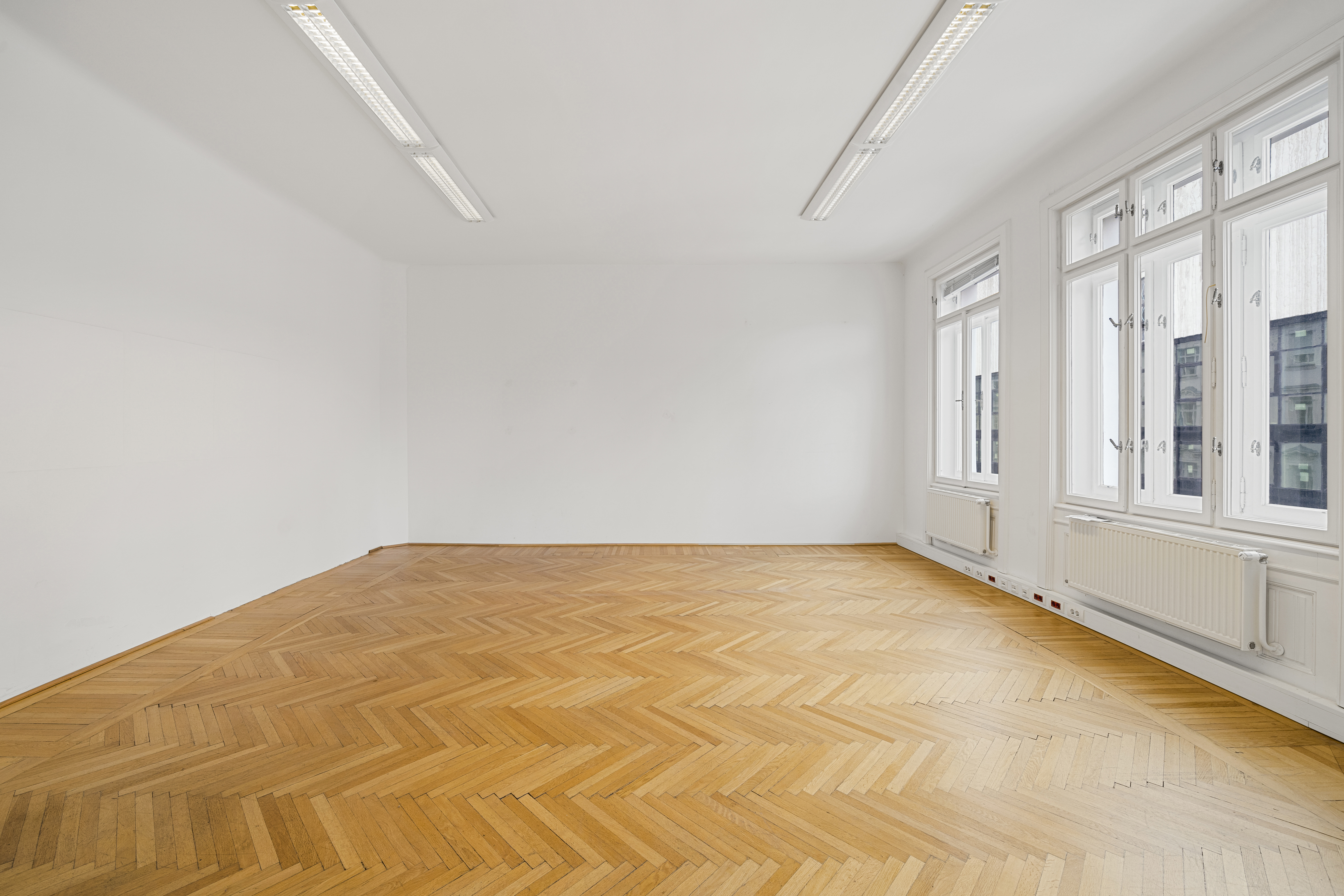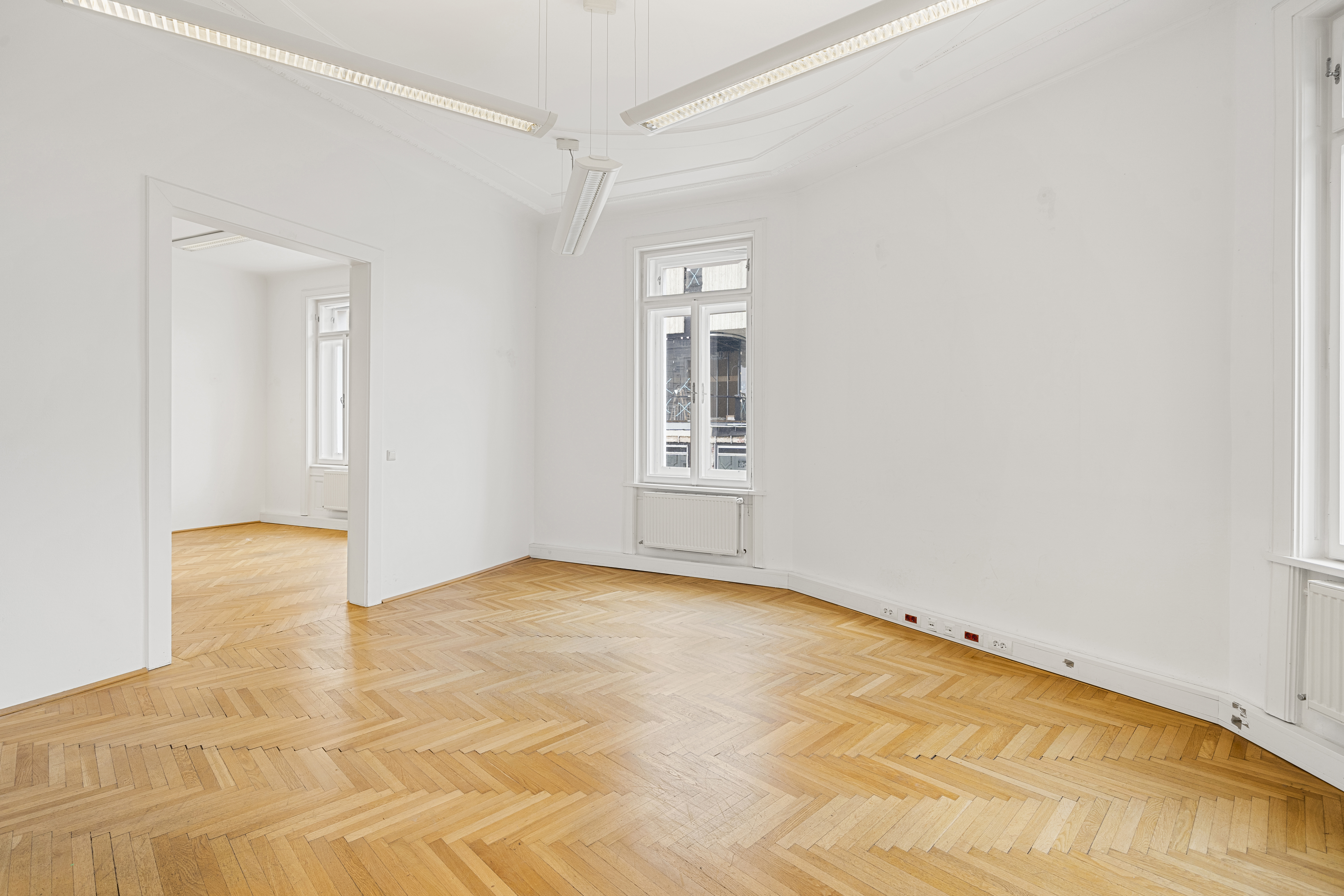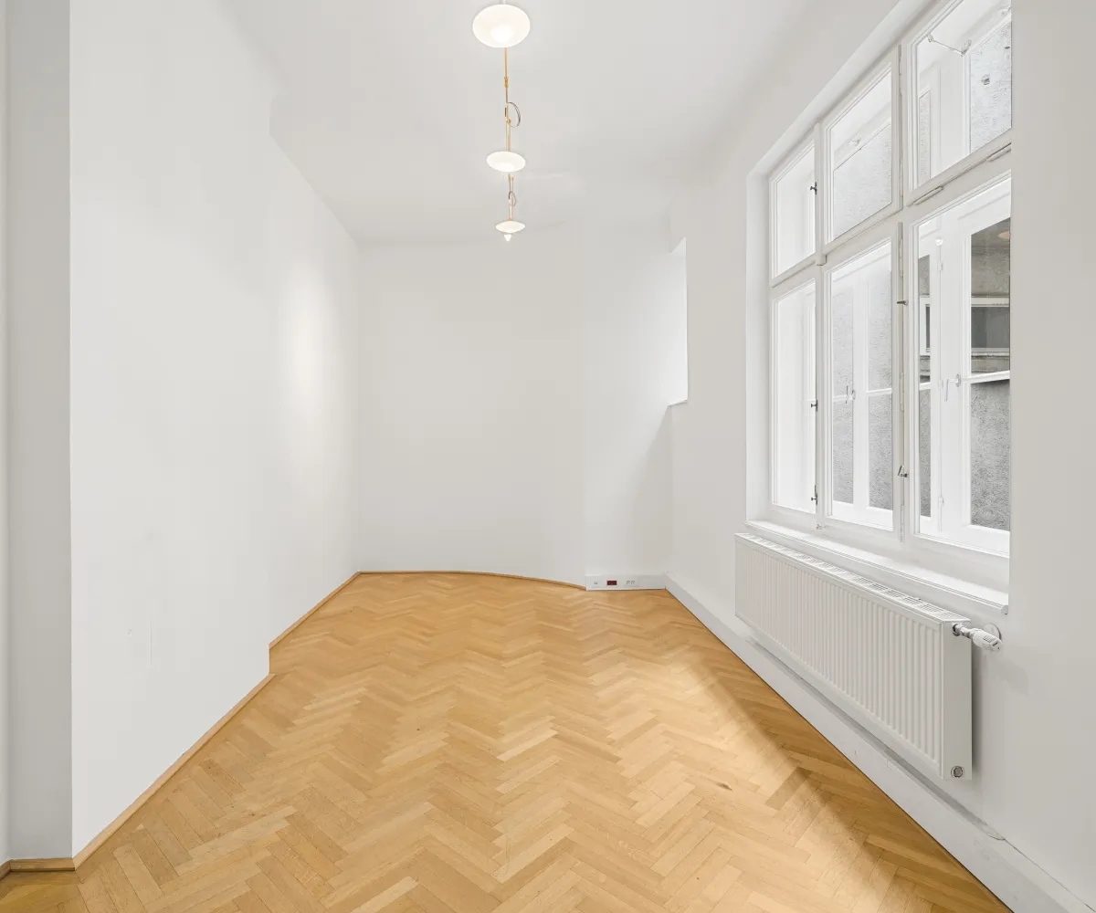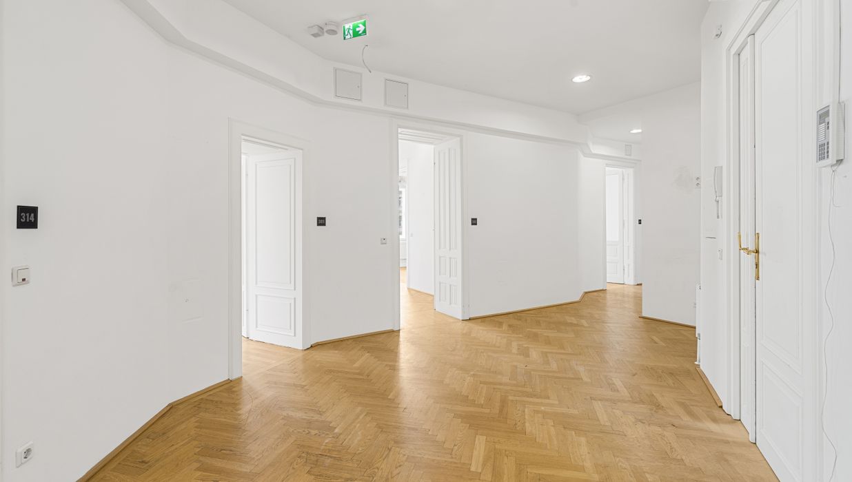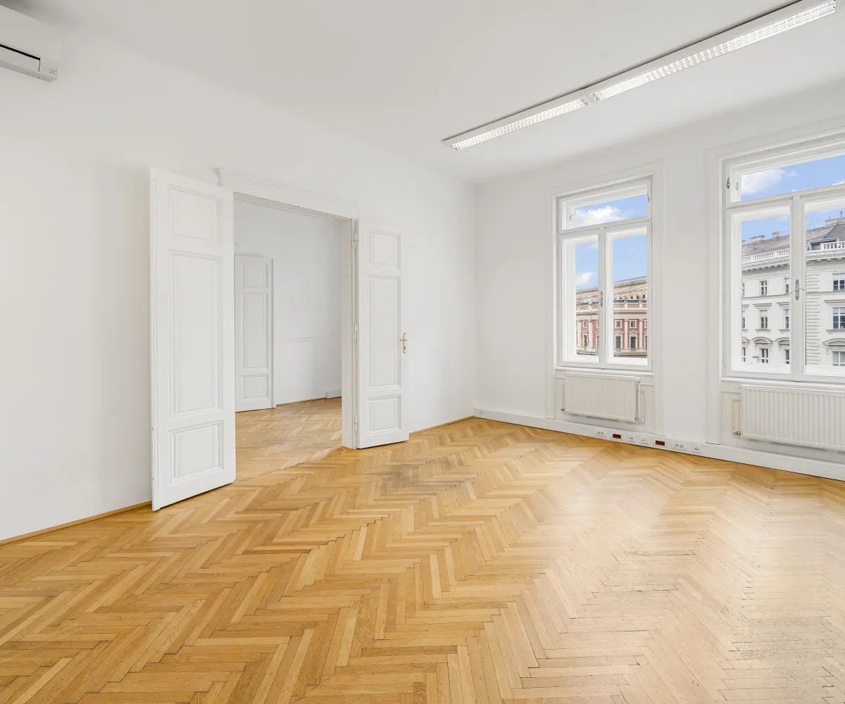 Die Gesamtfläche ist großzügig geschnitten und bietet eine durchdachte Raumaufteilung, die sowohl effiziente Teamarbeit als auch Rückzugsmöglichkeiten ermöglicht. Dank der eleganten Fischgrätparkettböden, hohen Räume und großen Fensterflächen präsentiert sich das Büro hell, modern und zugleich mit klassischem Wiener Altbau-Charakter.