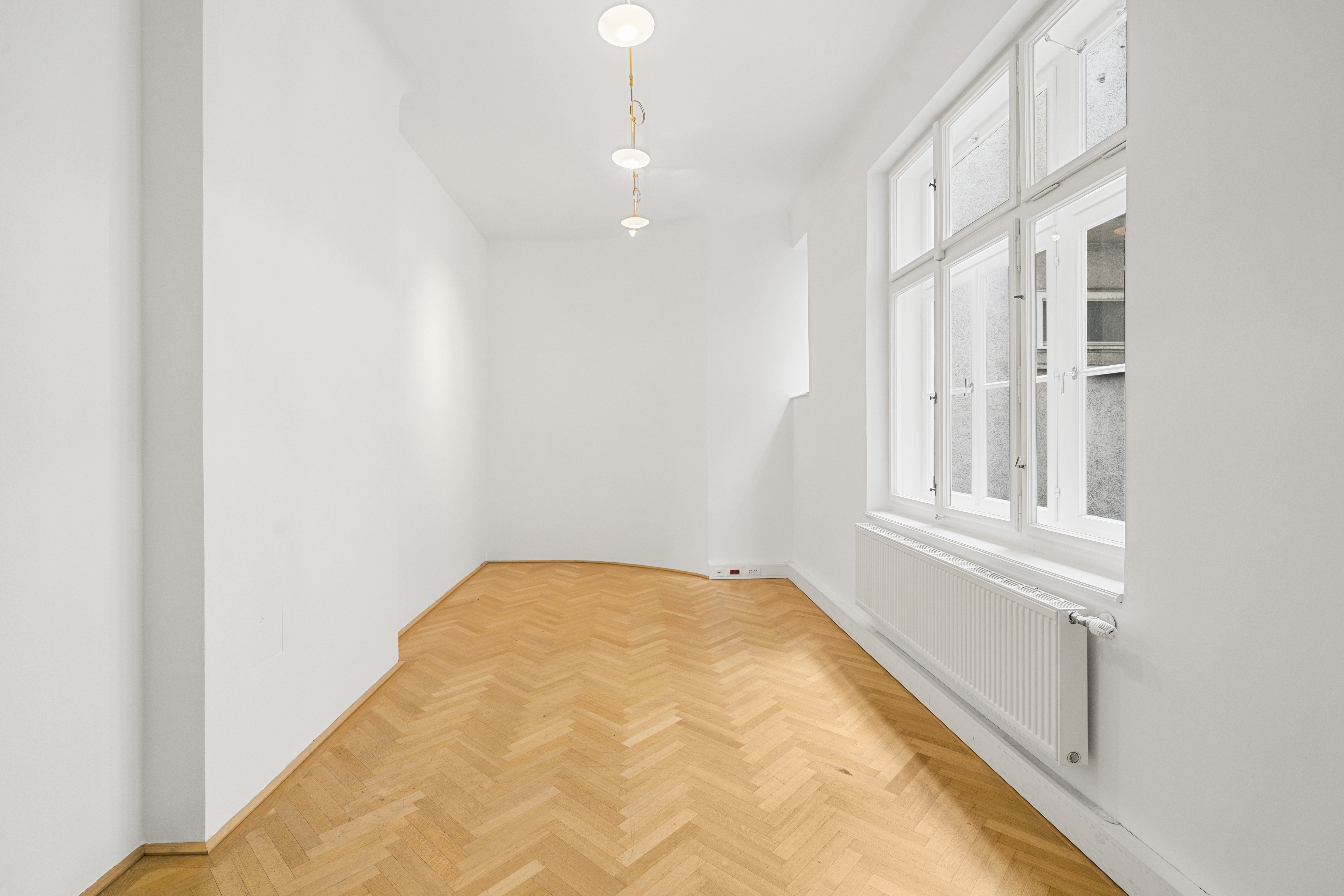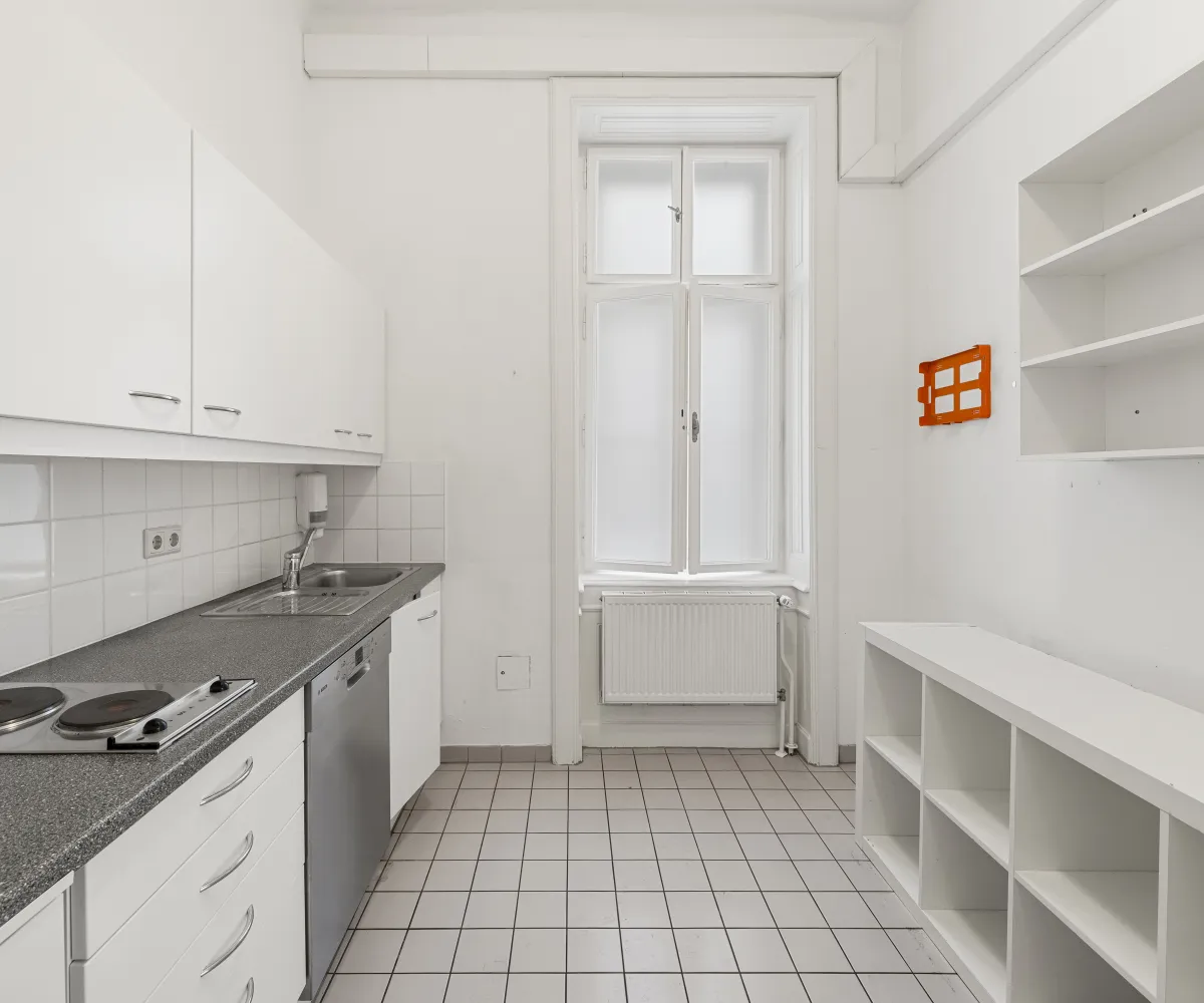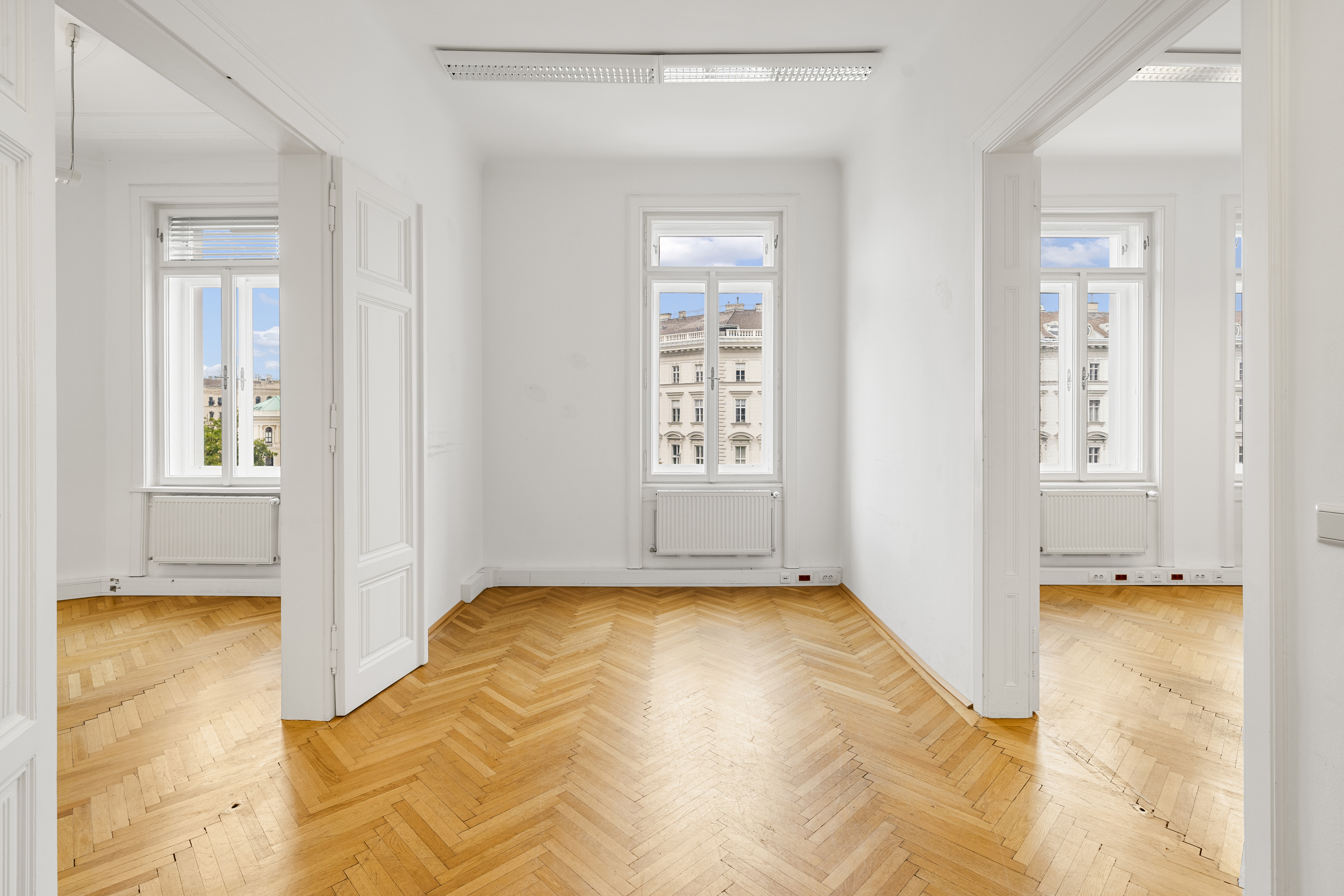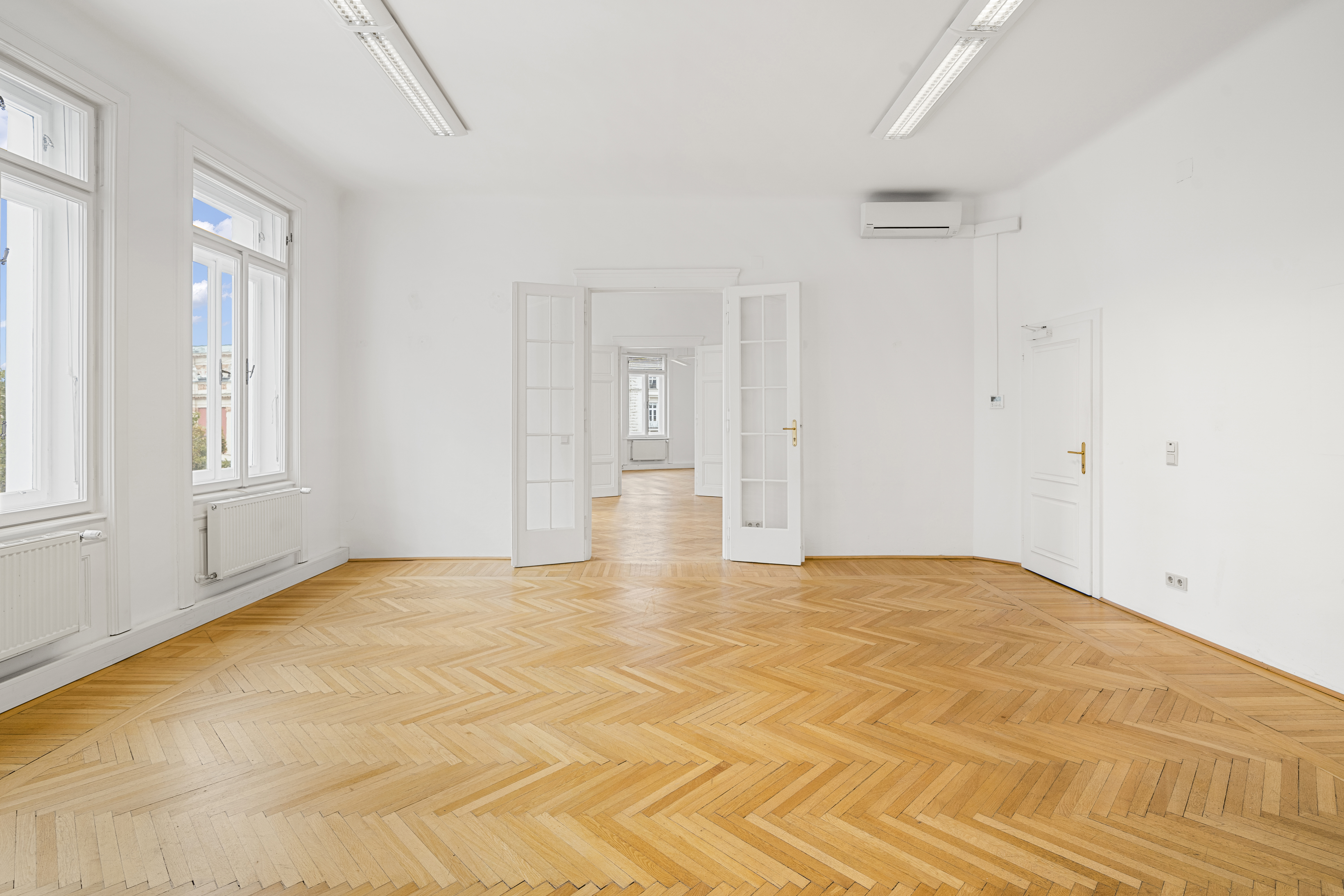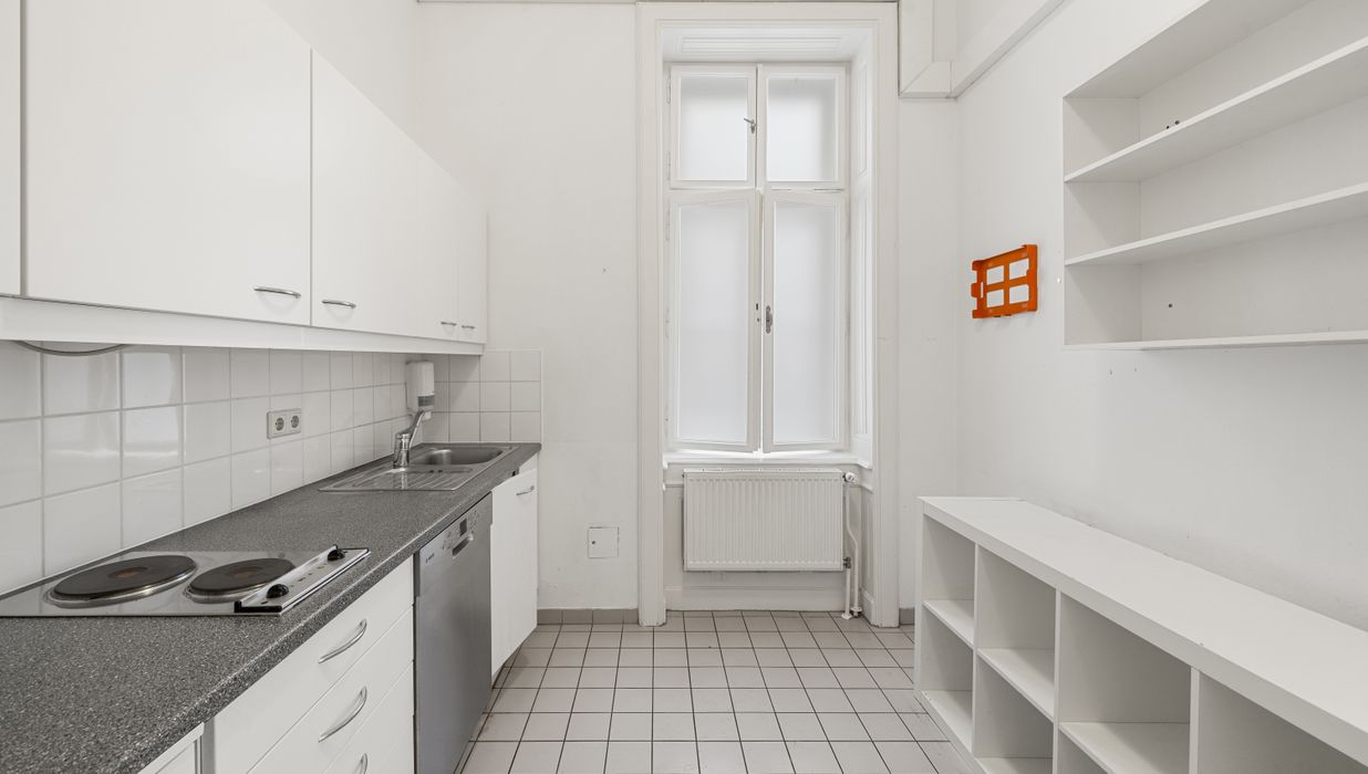 Die Gesamtfläche ist großzügig geschnitten und bietet eine durchdachte Raumaufteilung, die sowohl effiziente Teamarbeit als auch Rückzugsmöglichkeiten ermöglicht. Dank der eleganten Fischgrätparkettböden, hohen Räume und großen Fensterflächen präsentiert sich das Büro hell, modern und zugleich mit klassischem Wiener Altbau-Charakter.