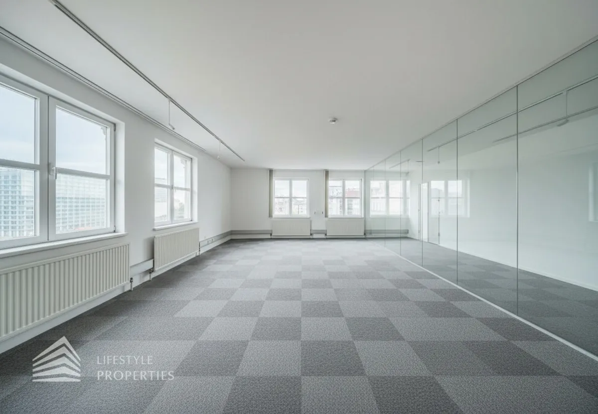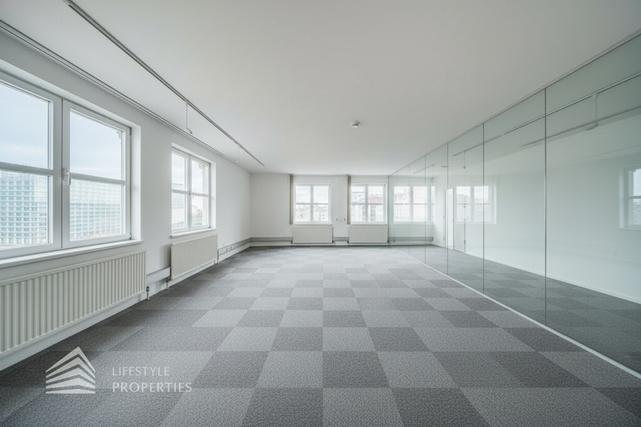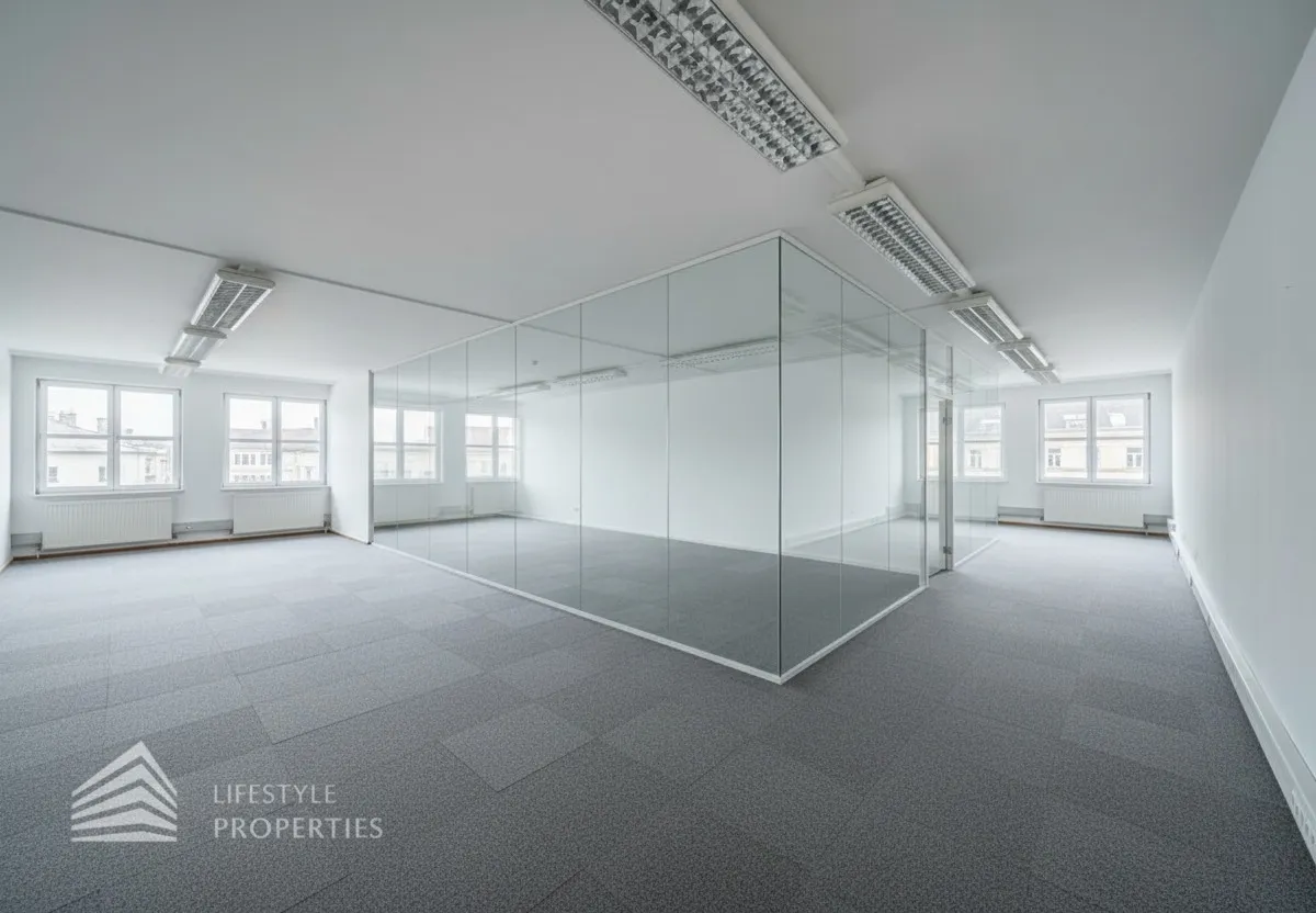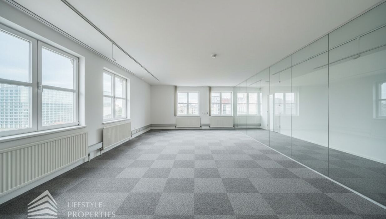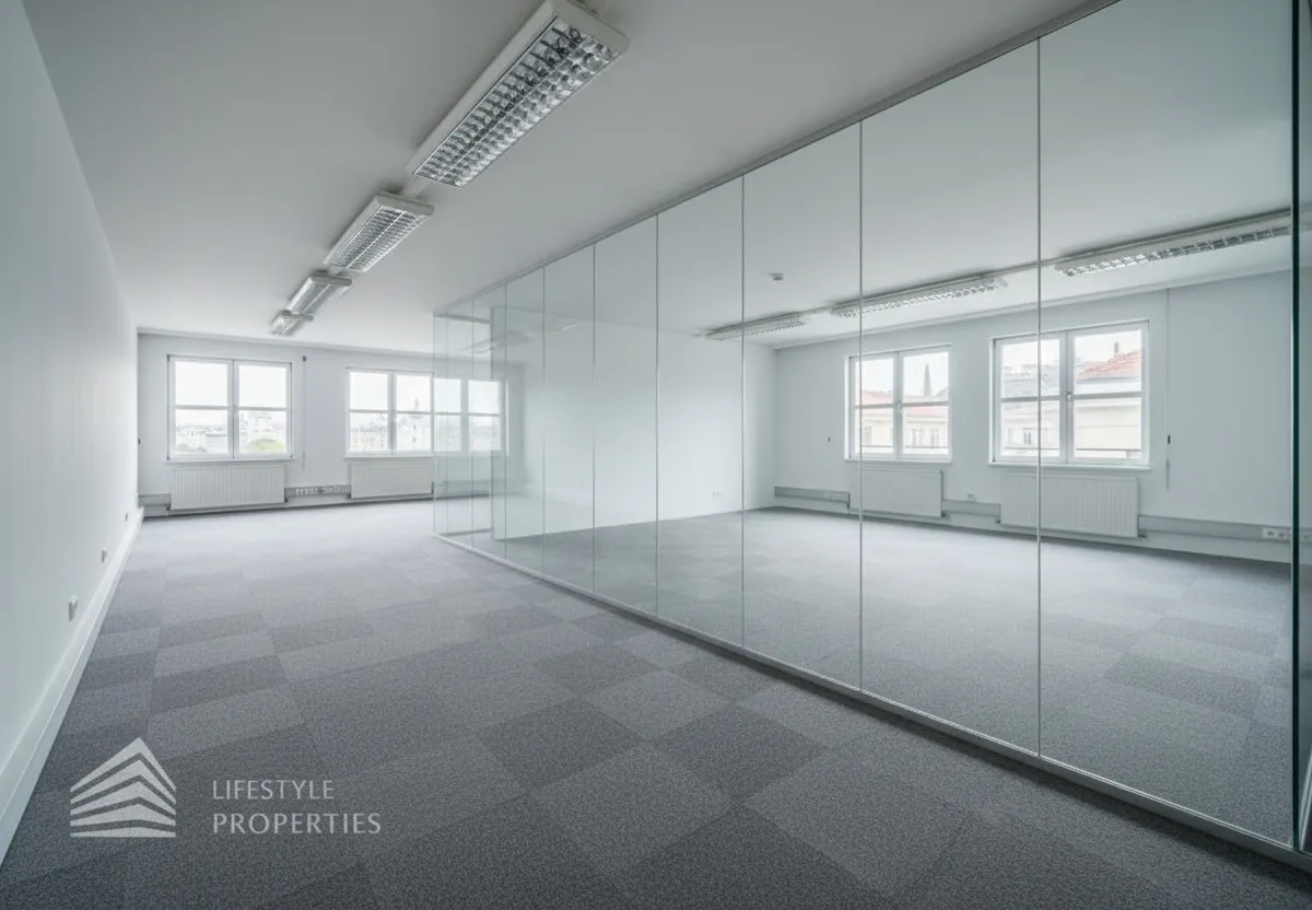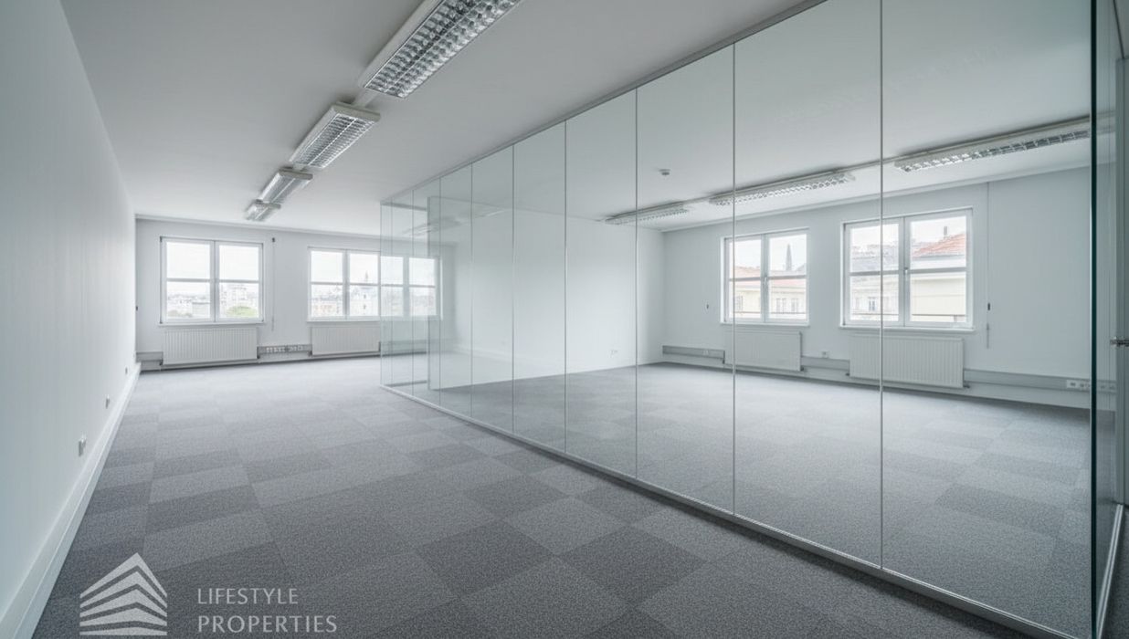 Sollten für die Büroräume Glaswände benötigt werden, erhöht sich der m² Preis der Nettomiete um 2,50.- Euro. Die gesamten Räume sind klimatisiert.