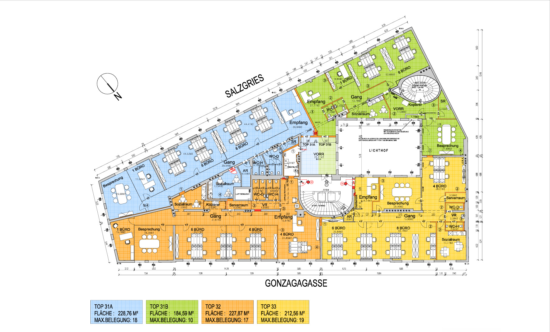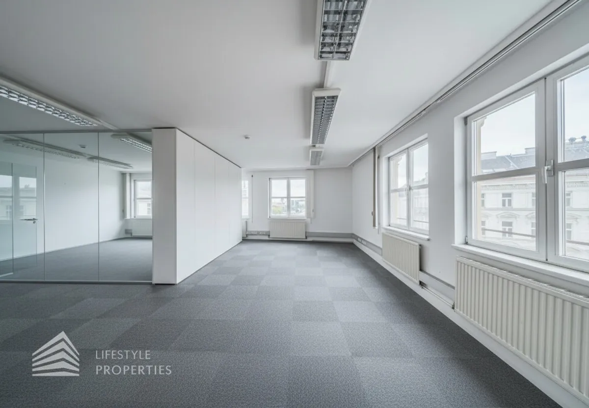 Beim Betreten des Büros steht man direkt im ca. 25 m² großen Vorraum, dieser mit dem angrenzenden Büro geteilt ist. Beim Eingang befindet sich der ca. 21 m² große Empfang. Durch einen ca. 30 m² langen Gang gelangt man zu den einzelnen Büroräumen. Auf der linken Seite des Ganges befindet sich ein Serverraum, ein Sozialraum mit einer Teeküche, die Toiletten für die Damen und Herren und ein Abstellraum. Die Fläche des Heizraumes wird auf vier Einheiten aufgeteilt.