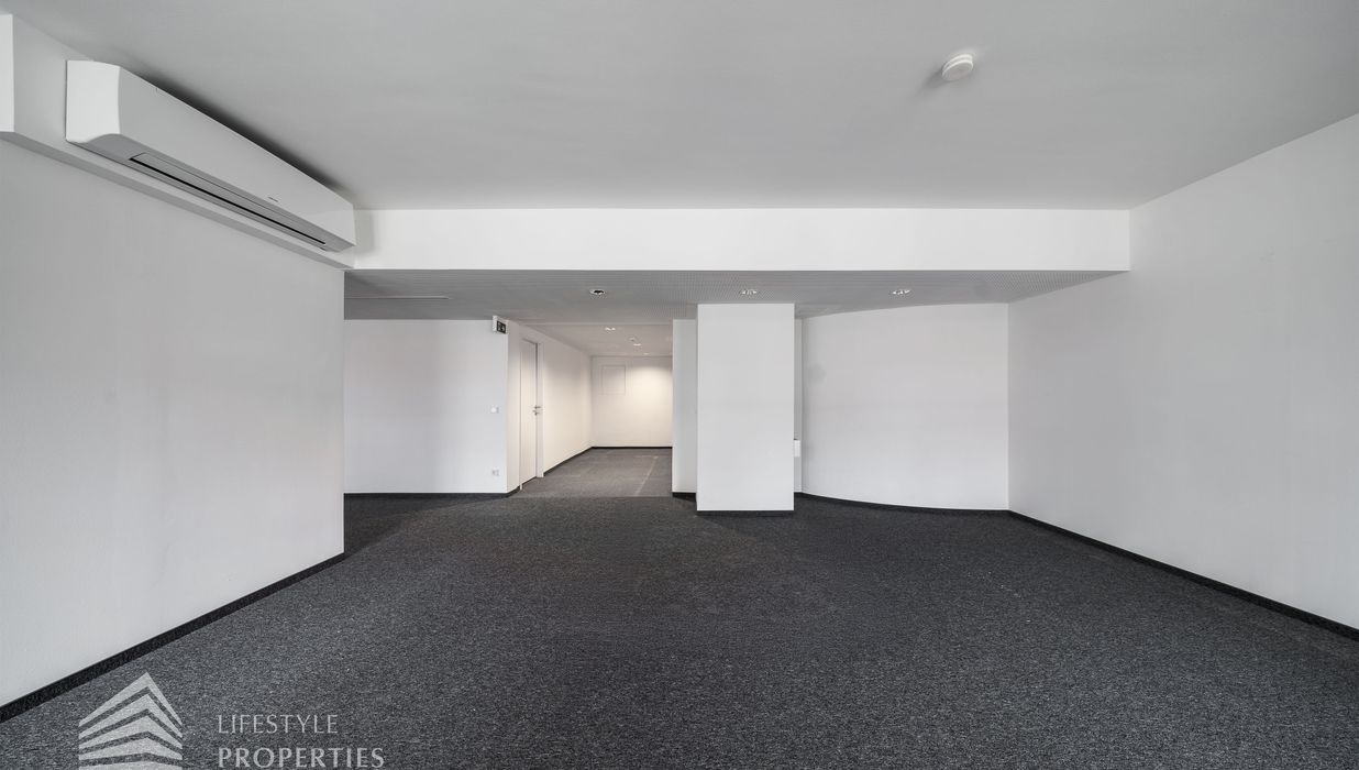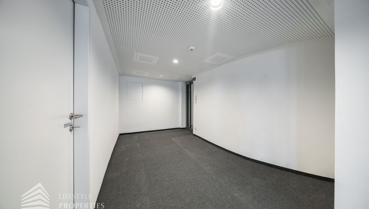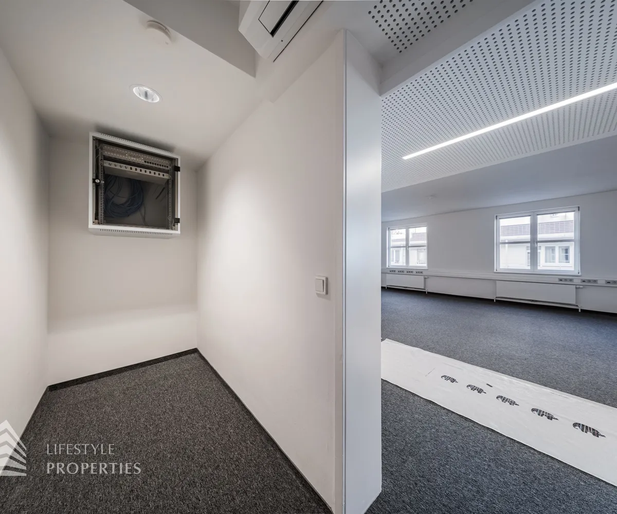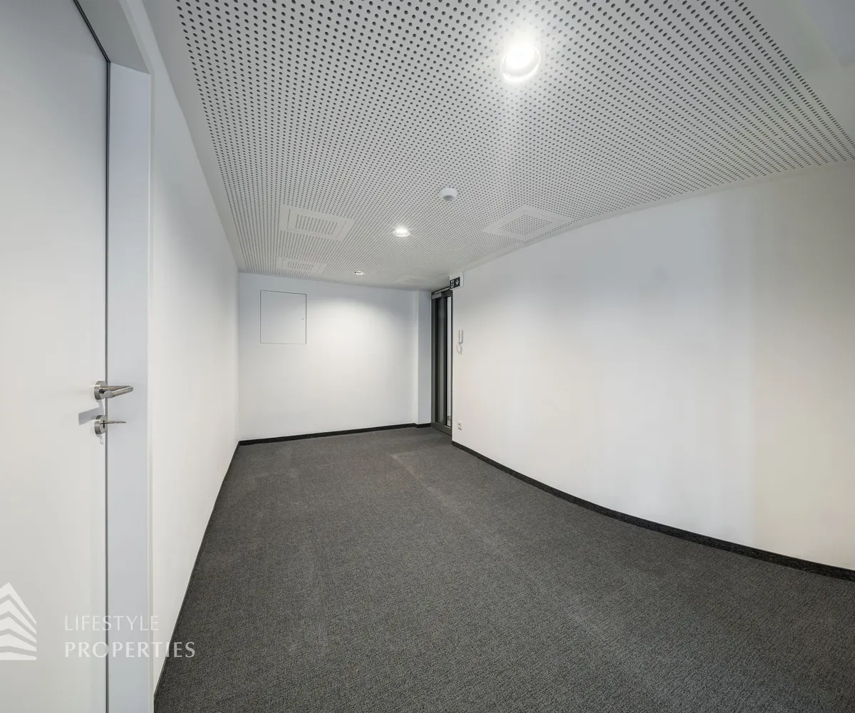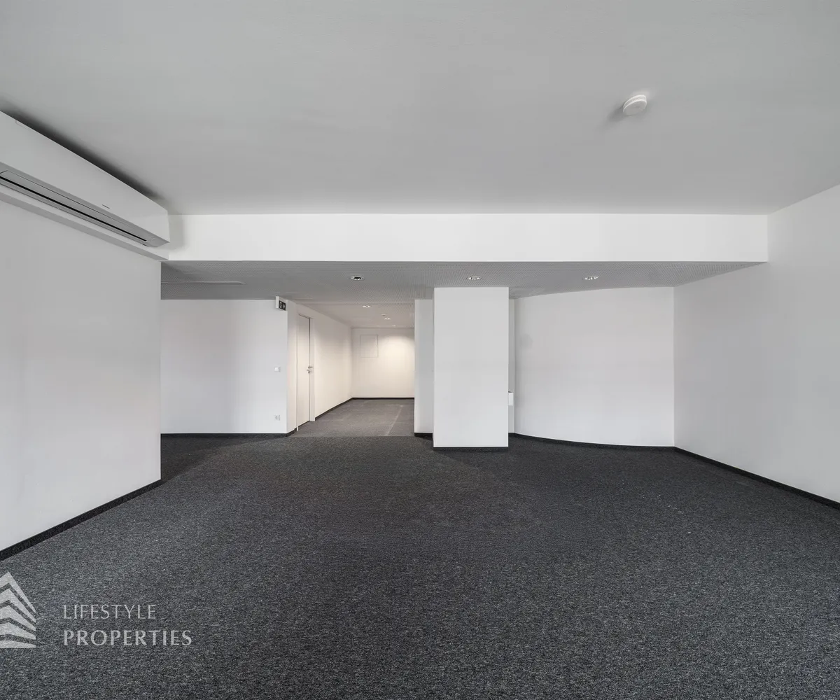 Beim Betreten des Büros befindet sich der ca. 16 m² große Empfang. Rechts beim Eingang befinden sich die Toiletten für die Damen und Herren. Durch einen ca. 37 m² langen Gang gelangt man zu den einzelnen Büroräumen. Auf der rechten Seite des Ganges befindet sich ein Serverraum, ein Sozialraum mit einer Teeküche und ein Abstellraum. Die Fläche des Heizraumes wird auf vier Einheiten aufgeteilt.