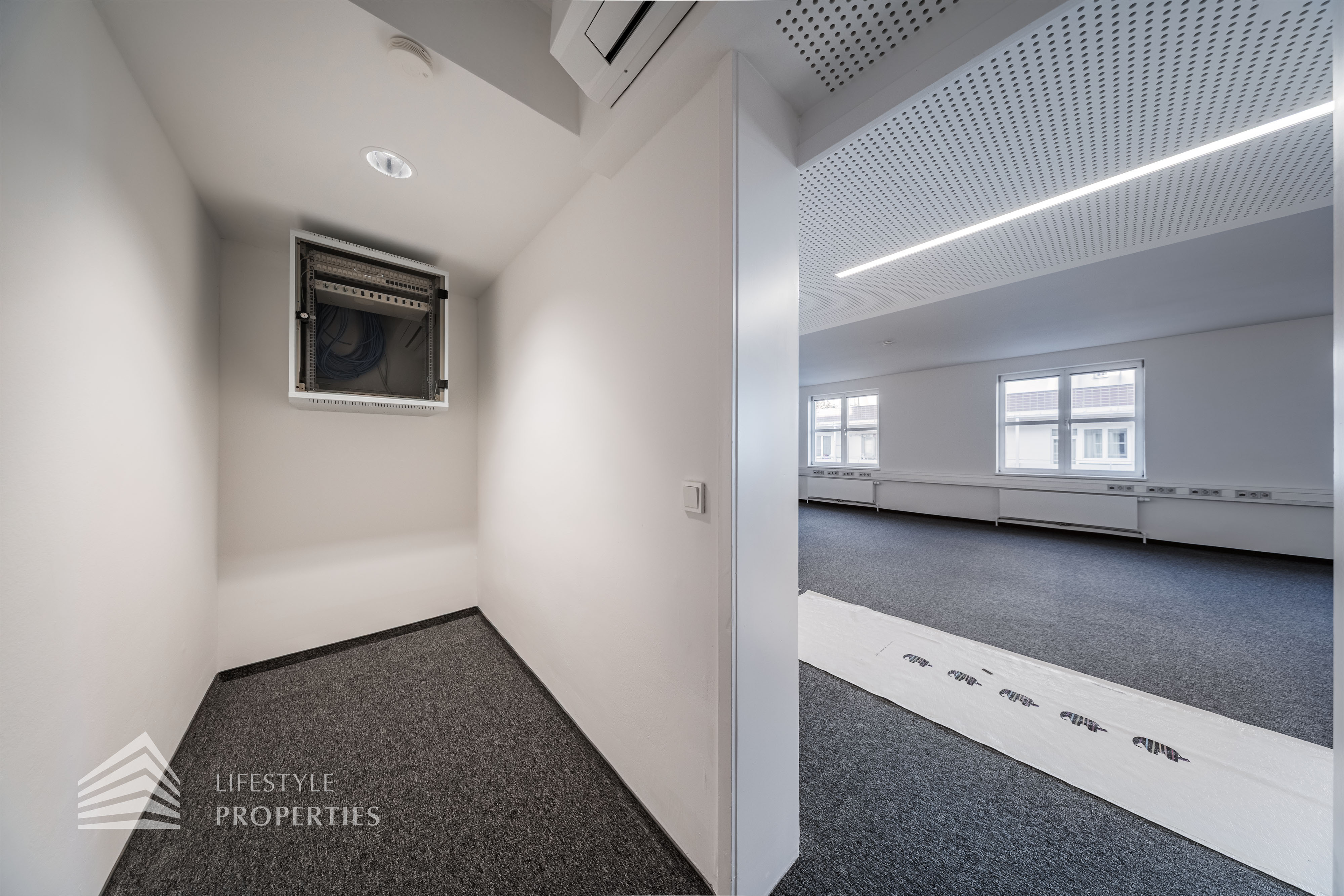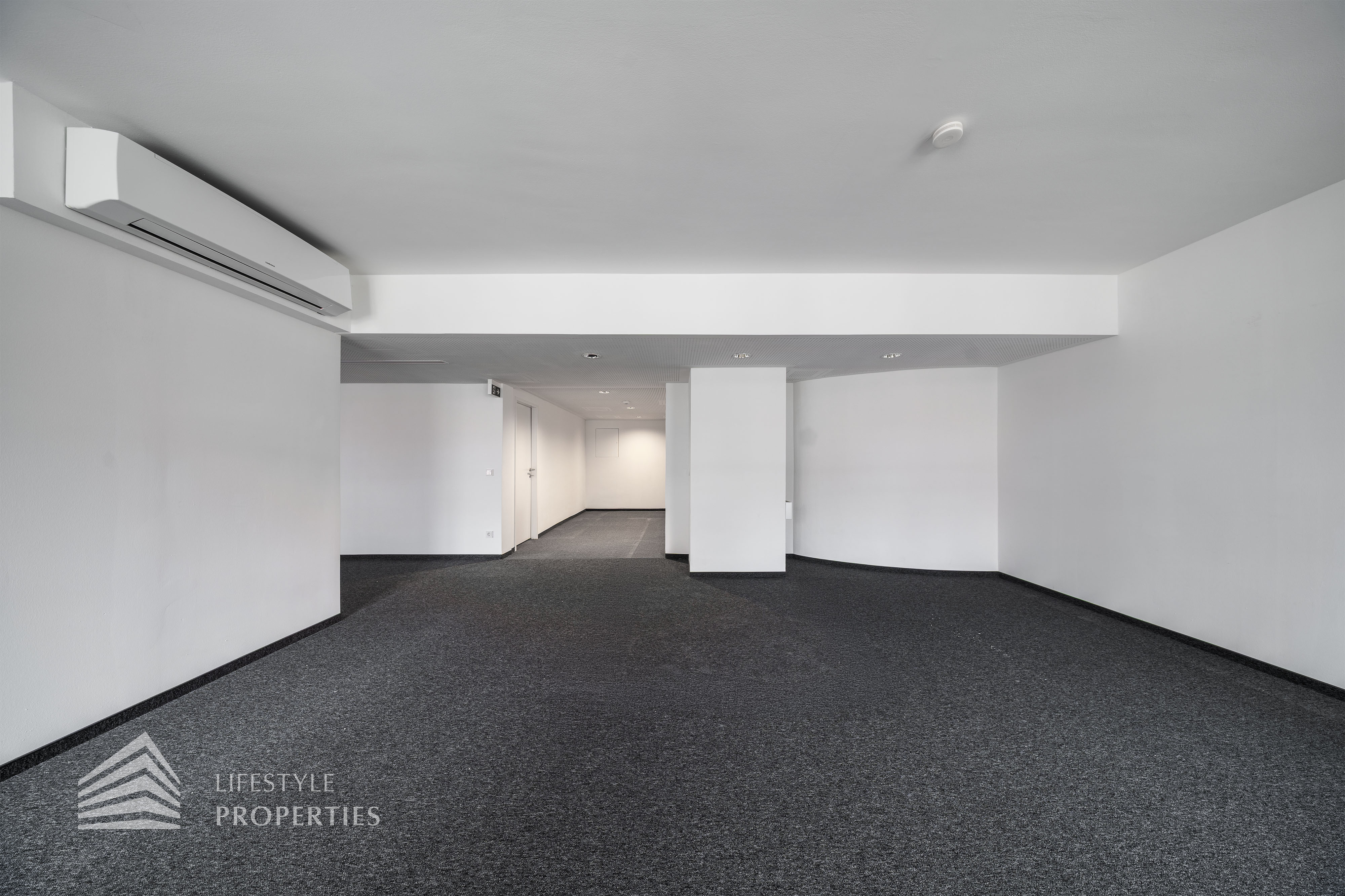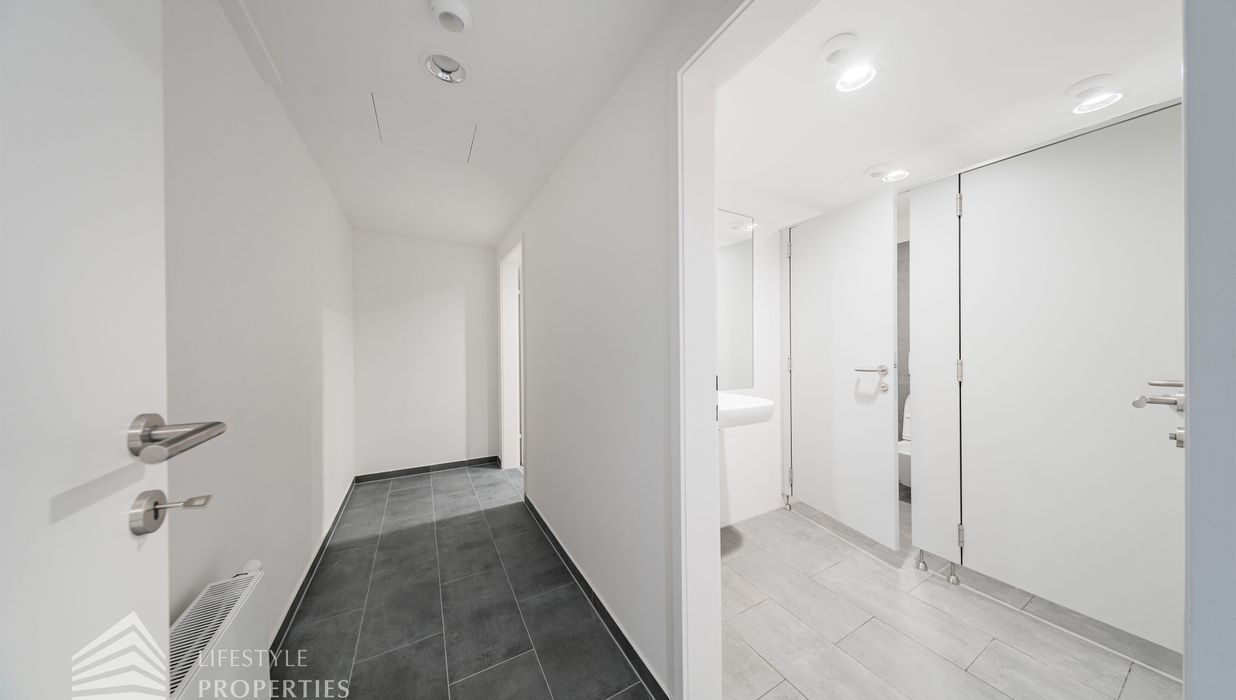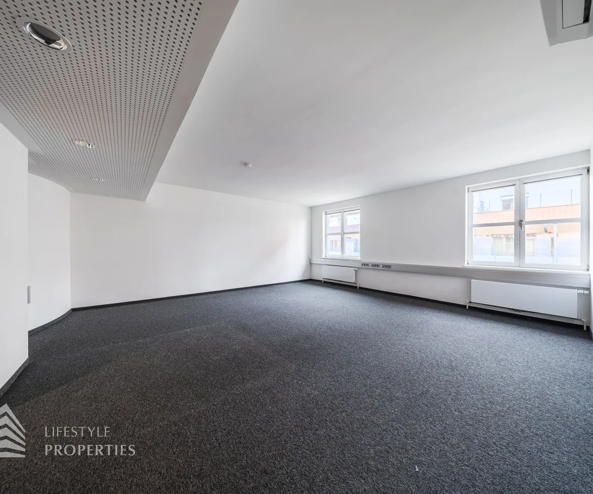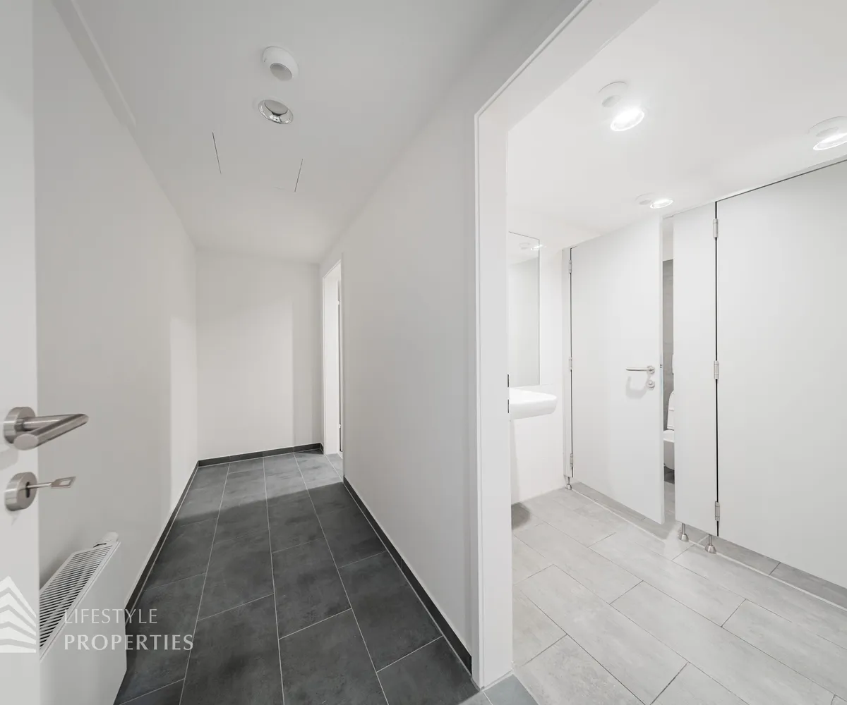 Beim Betreten des Büros befindet sich der ca. 16 m² große Empfang. Rechts beim Eingang befinden sich die Toiletten für die Damen und Herren. Durch einen ca. 37 m² langen Gang gelangt man zu den einzelnen Büroräumen. Auf der rechten Seite des Ganges befindet sich ein Serverraum, ein Sozialraum mit einer Teeküche und ein Abstellraum. Die Fläche des Heizraumes wird auf vier Einheiten aufgeteilt.
