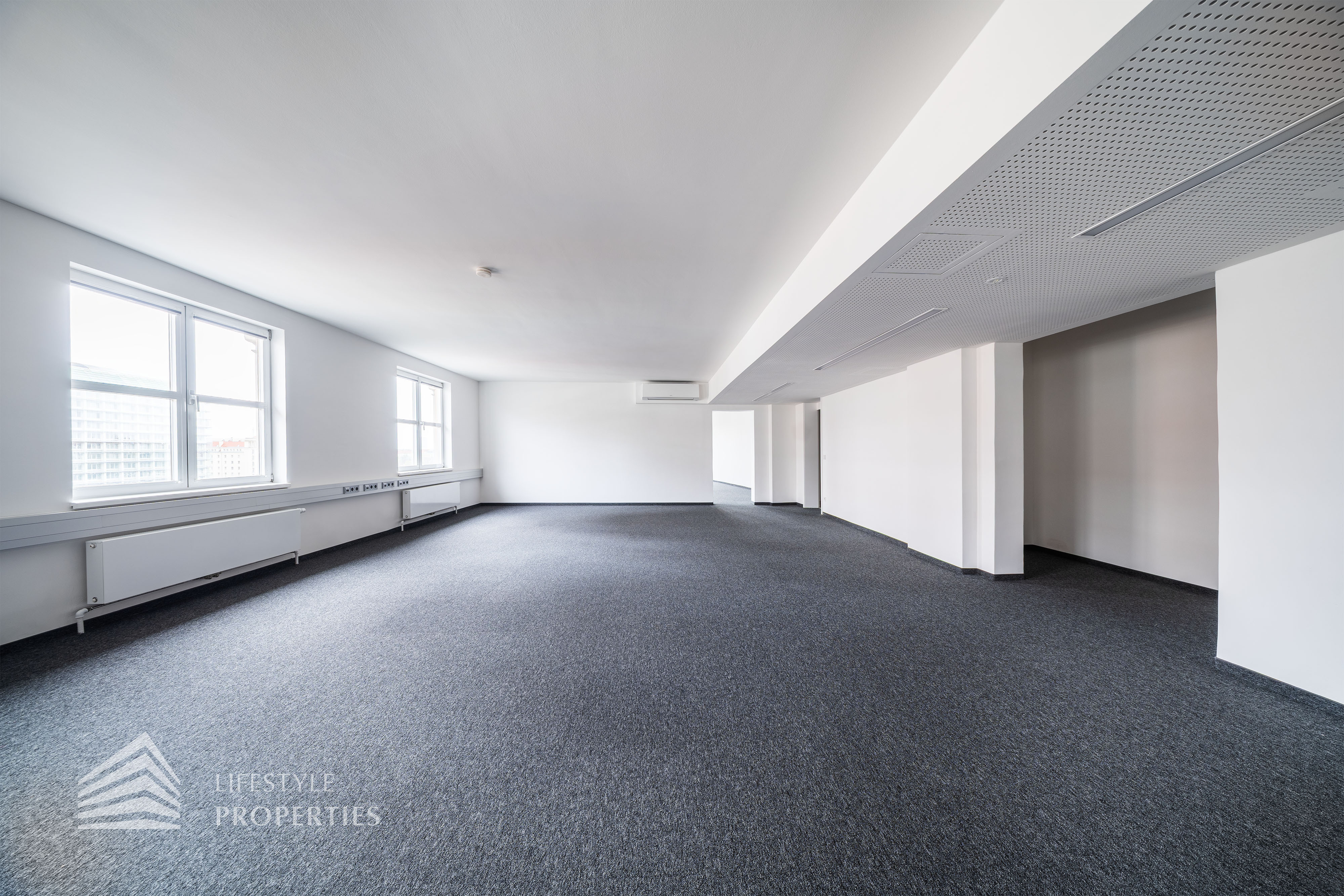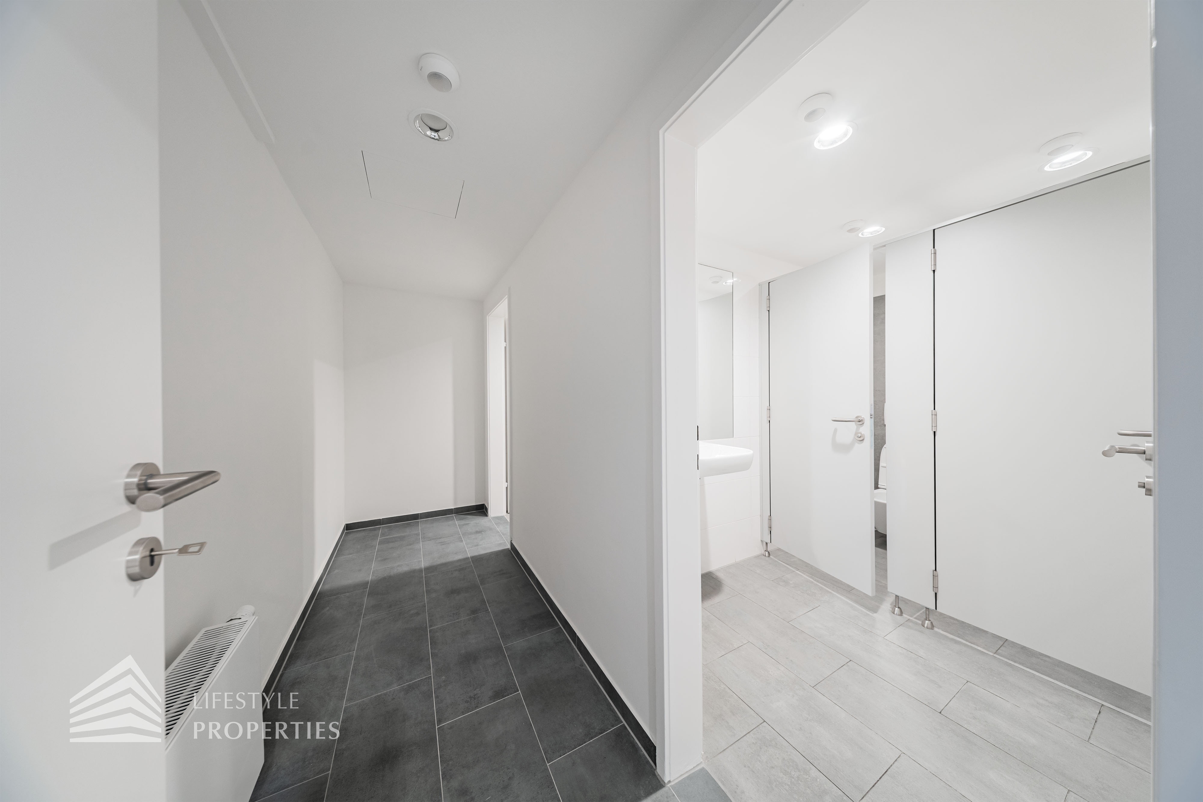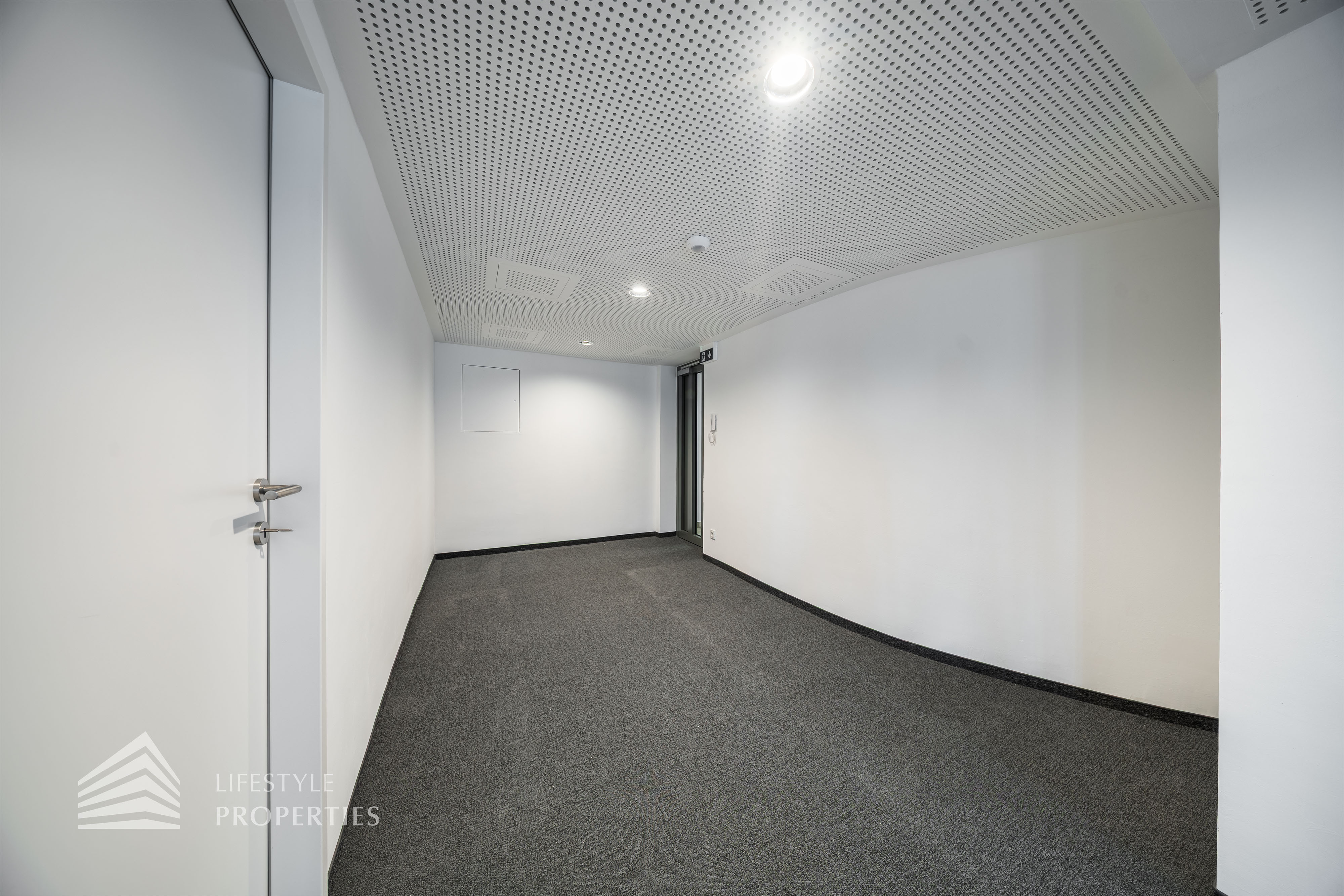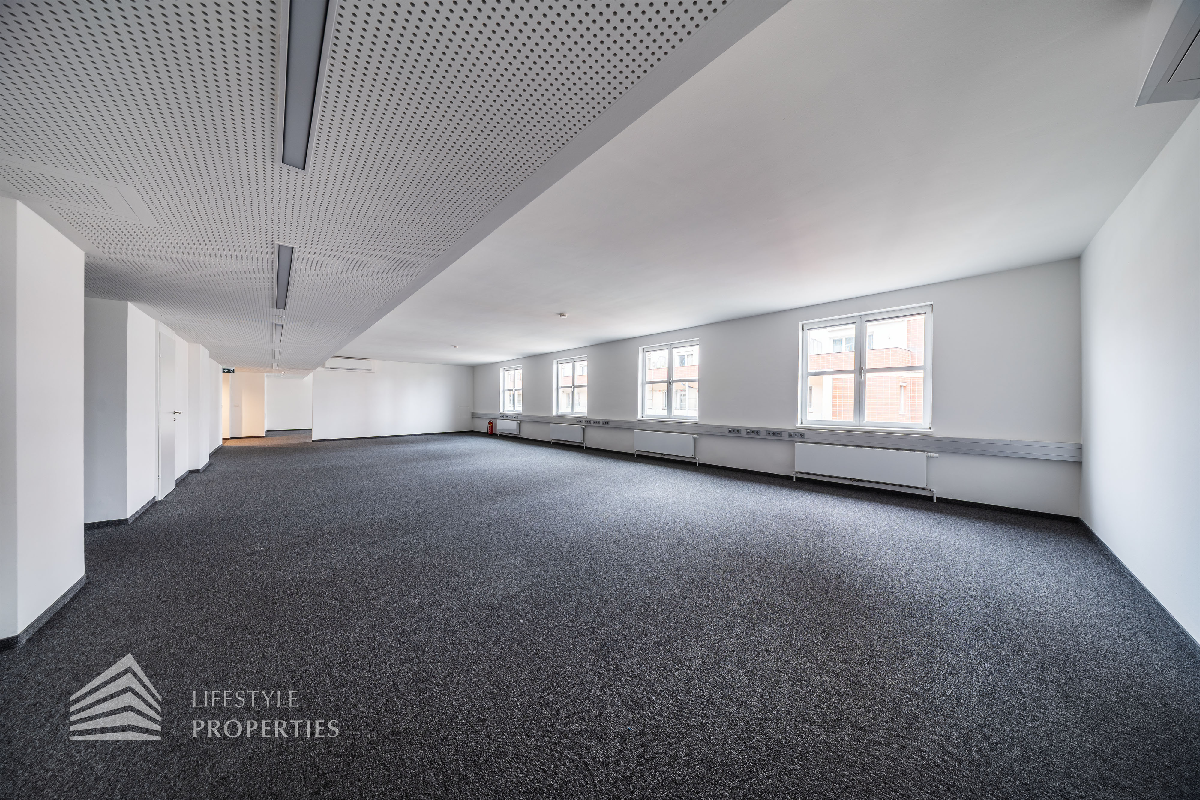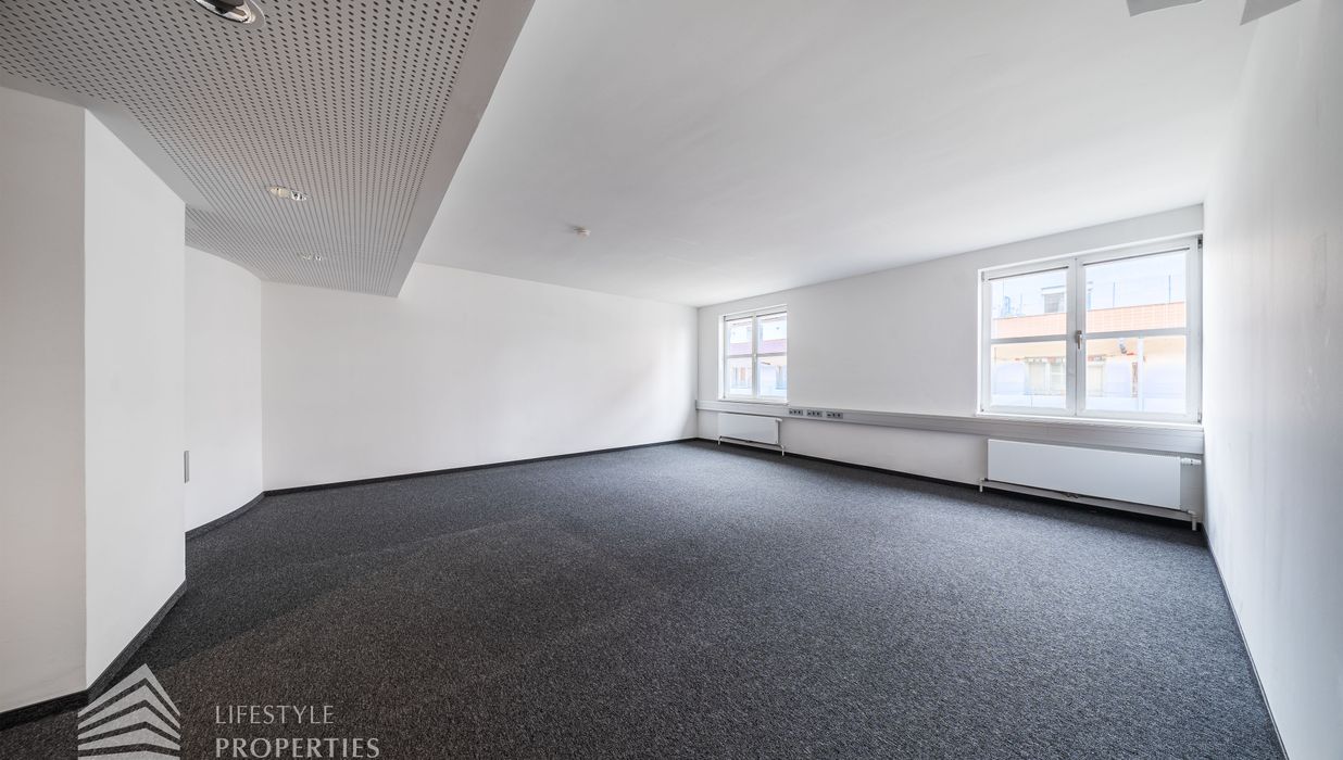 Beim Betreten des Büros befindet sich der ca. 16 m² große Empfang. Rechts beim Eingang befinden sich die Toiletten für die Damen und Herren. Durch einen ca. 37 m² langen Gang gelangt man zu den einzelnen Büroräumen. Auf der rechten Seite des Ganges befindet sich ein Serverraum, ein Sozialraum mit einer Teeküche und ein Abstellraum. Die Fläche des Heizraumes wird auf vier Einheiten aufgeteilt.