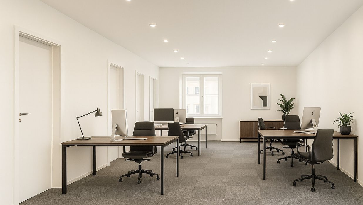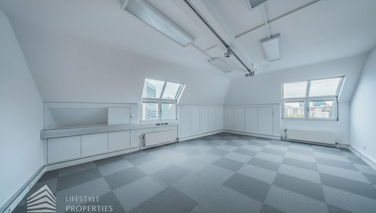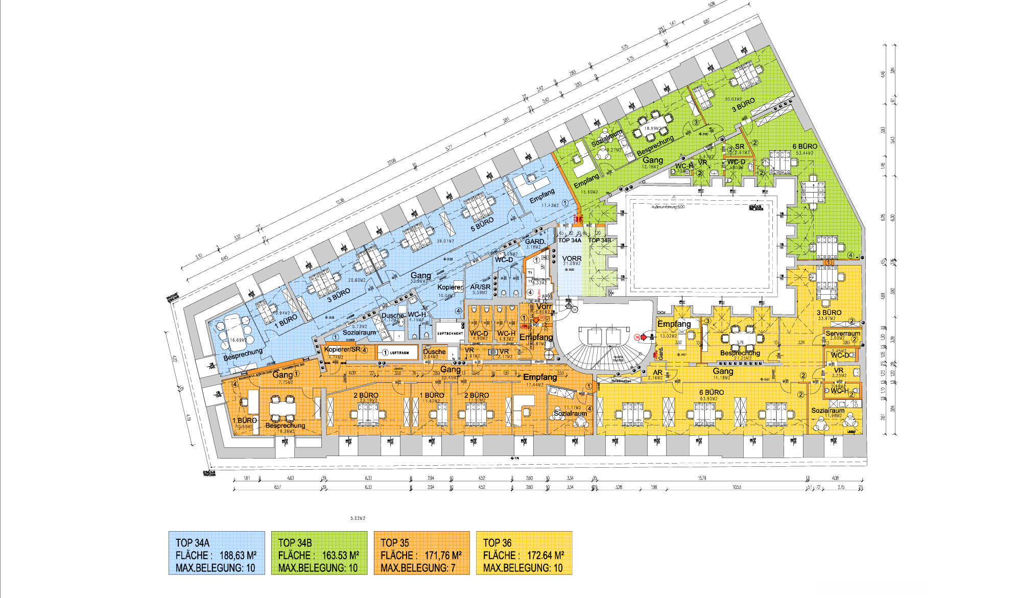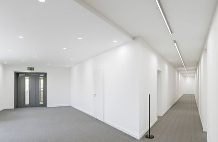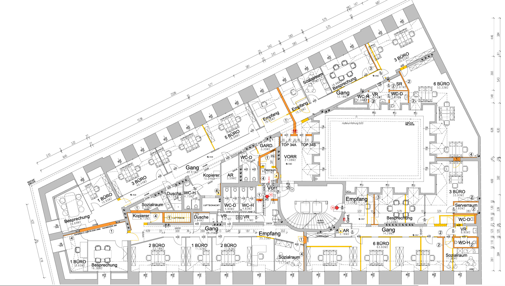 Beim Betreten des Büros steht man direkt im ca. 21 m² großen Vorraum, dieser mit dem angrenzenden Büro geteilt ist. Beim Eingang befindet sich der ca. 18 m² große Empfang. Durch einen ca. 33 m² langen Gang gelangt man zu den einzelnen Büroräumen. Auf der linken Seite des Ganges befindet sich ein Serverraum, ein Sozialraum mit einer Teeküche, die Toiletten für die Damen und Herren, ein Badezimmer, ein Kopierraum und ein Abstellraum. Die Fläche des Heizraumes wird auf vier Einheiten aufgeteilt.