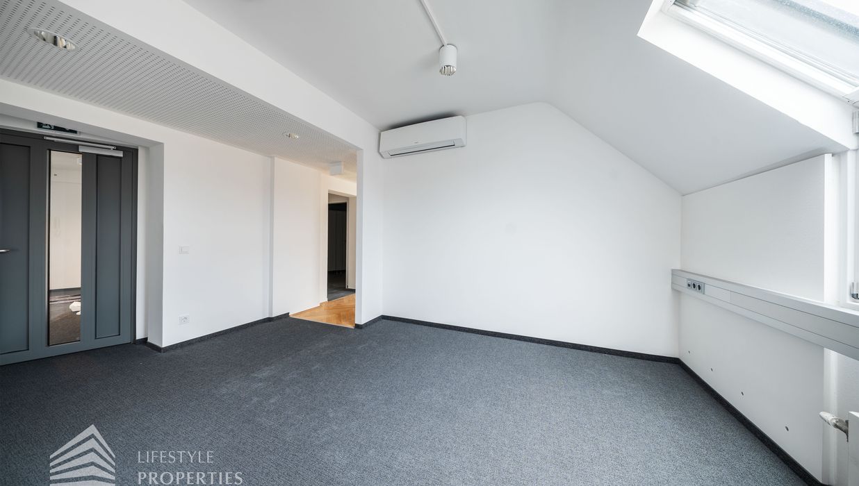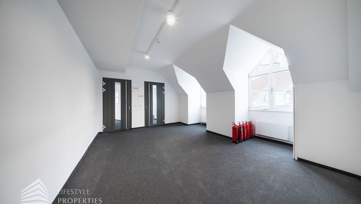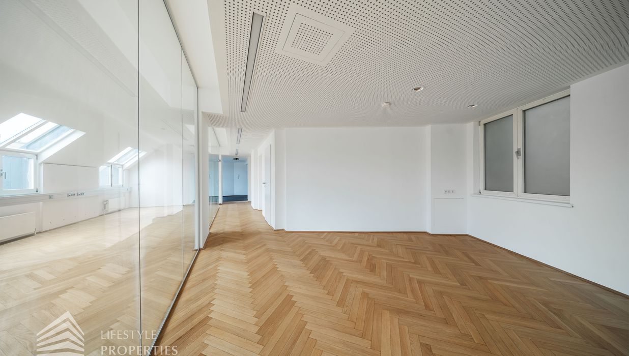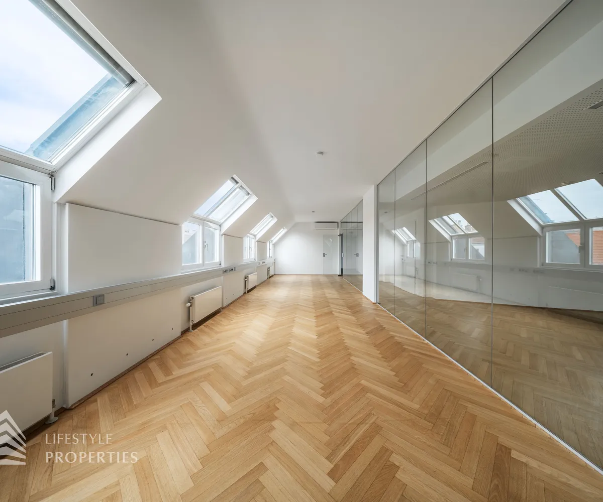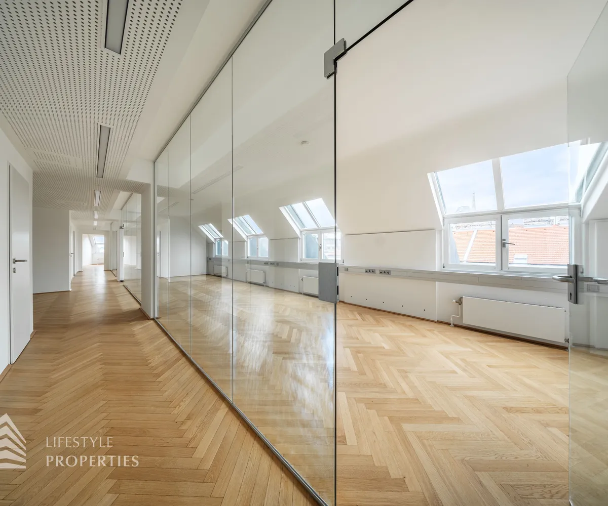 Beim Betreten des Büros steht man direkt im ca. 21 m² großen Vorraum, dieser mit dem angrenzenden Büro geteilt ist. Beim Eingang befindet sich der ca. 18 m² große Empfang. Durch einen ca. 33 m² langen Gang gelangt man zu den einzelnen Büroräumen. Auf der linken Seite des Ganges befindet sich ein Serverraum, ein Sozialraum mit einer Teeküche, die Toiletten für die Damen und Herren, ein Badezimmer, ein Kopierraum und ein Abstellraum. Die Fläche des Heizraumes wird auf vier Einheiten aufgeteilt.
