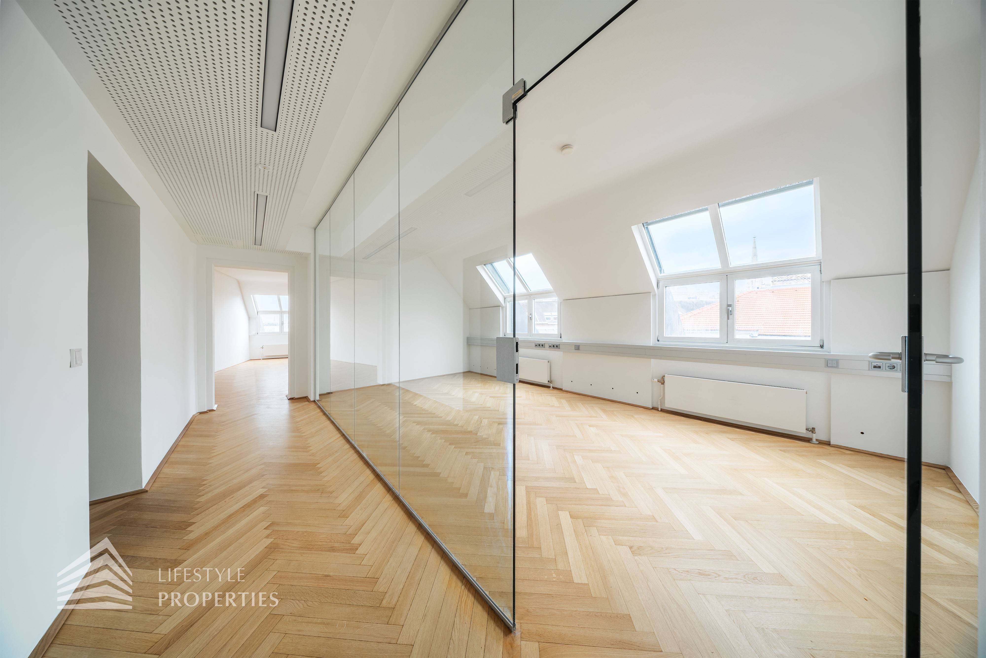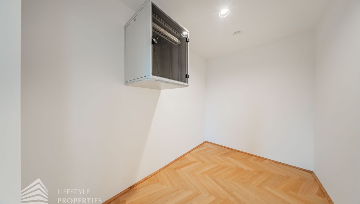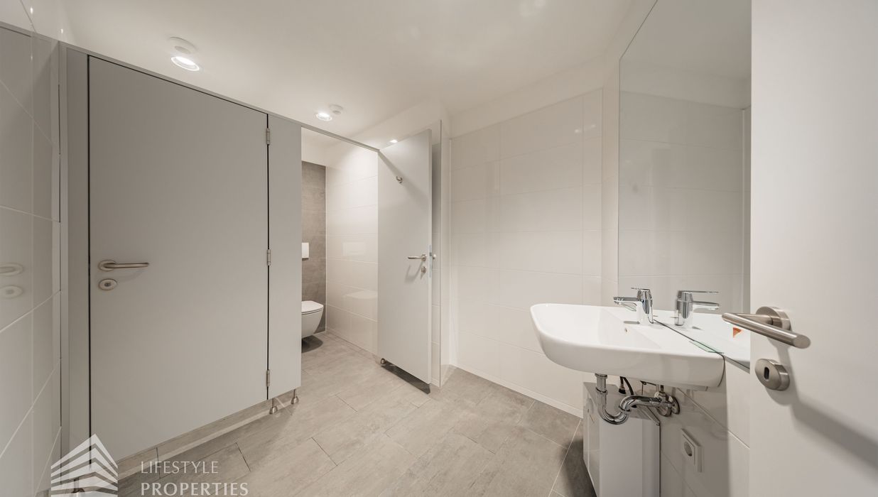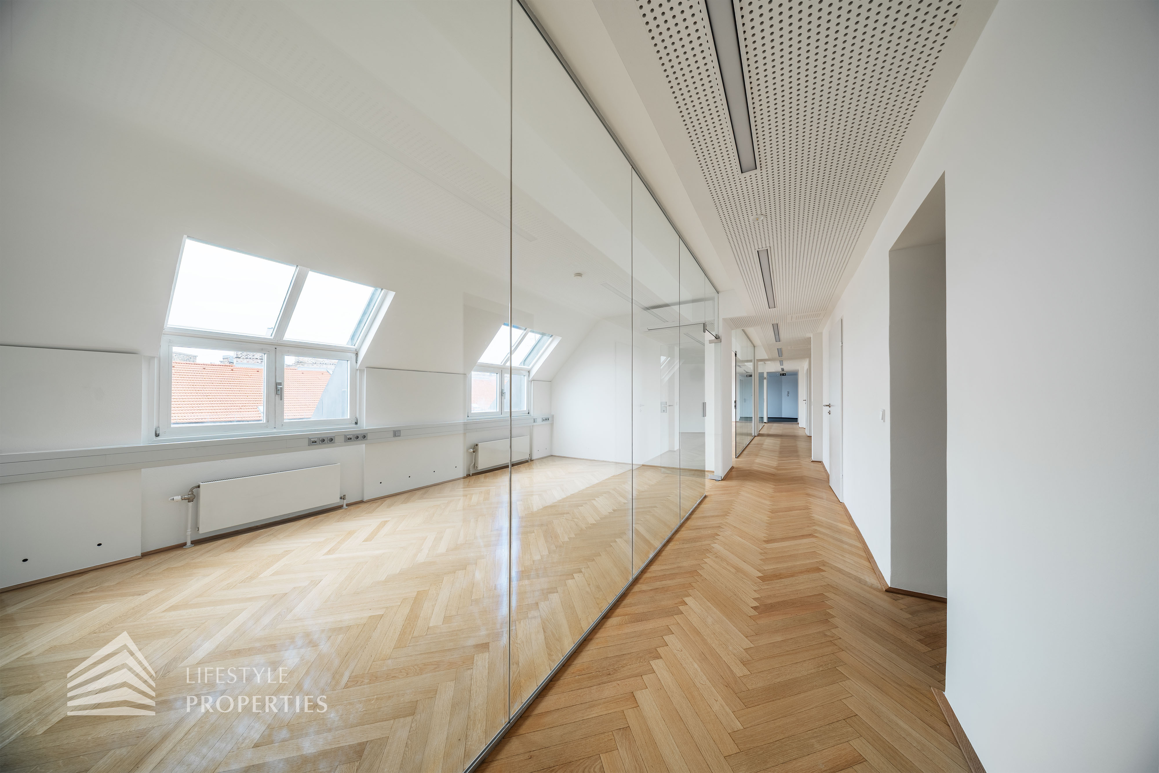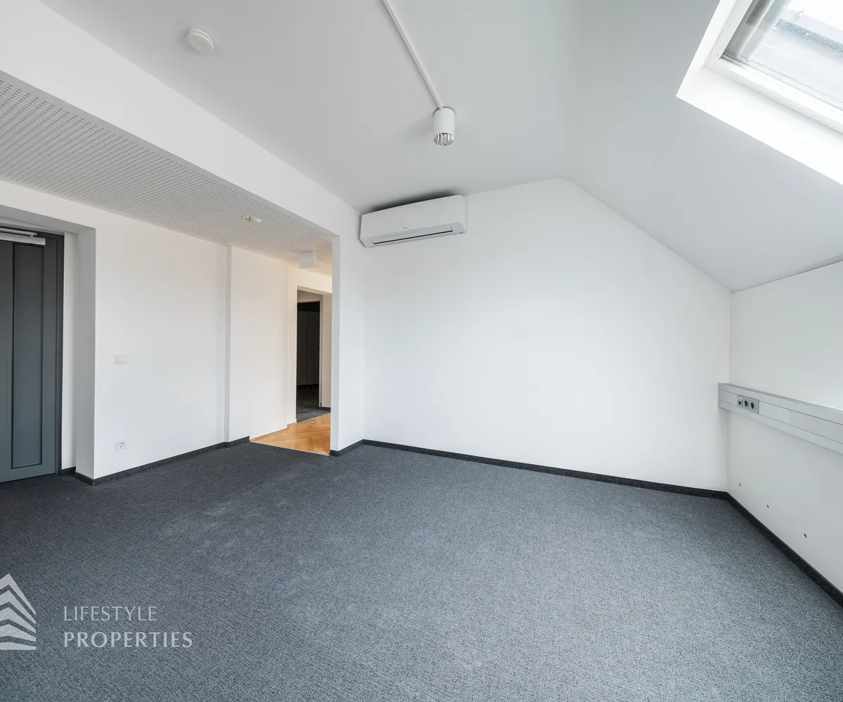 Beim Betreten des Büros steht man direkt im ca. 21 m² großen Vorraum, dieser mit dem angrenzenden Büro geteilt ist. Beim Eingang befindet sich der ca. 18 m² große Empfang. Durch einen ca. 33 m² langen Gang gelangt man zu den einzelnen Büroräumen. Auf der linken Seite des Ganges befindet sich ein Serverraum, ein Sozialraum mit einer Teeküche, die Toiletten für die Damen und Herren, ein Badezimmer, ein Kopierraum und ein Abstellraum. Die Fläche des Heizraumes wird auf vier Einheiten aufgeteilt.