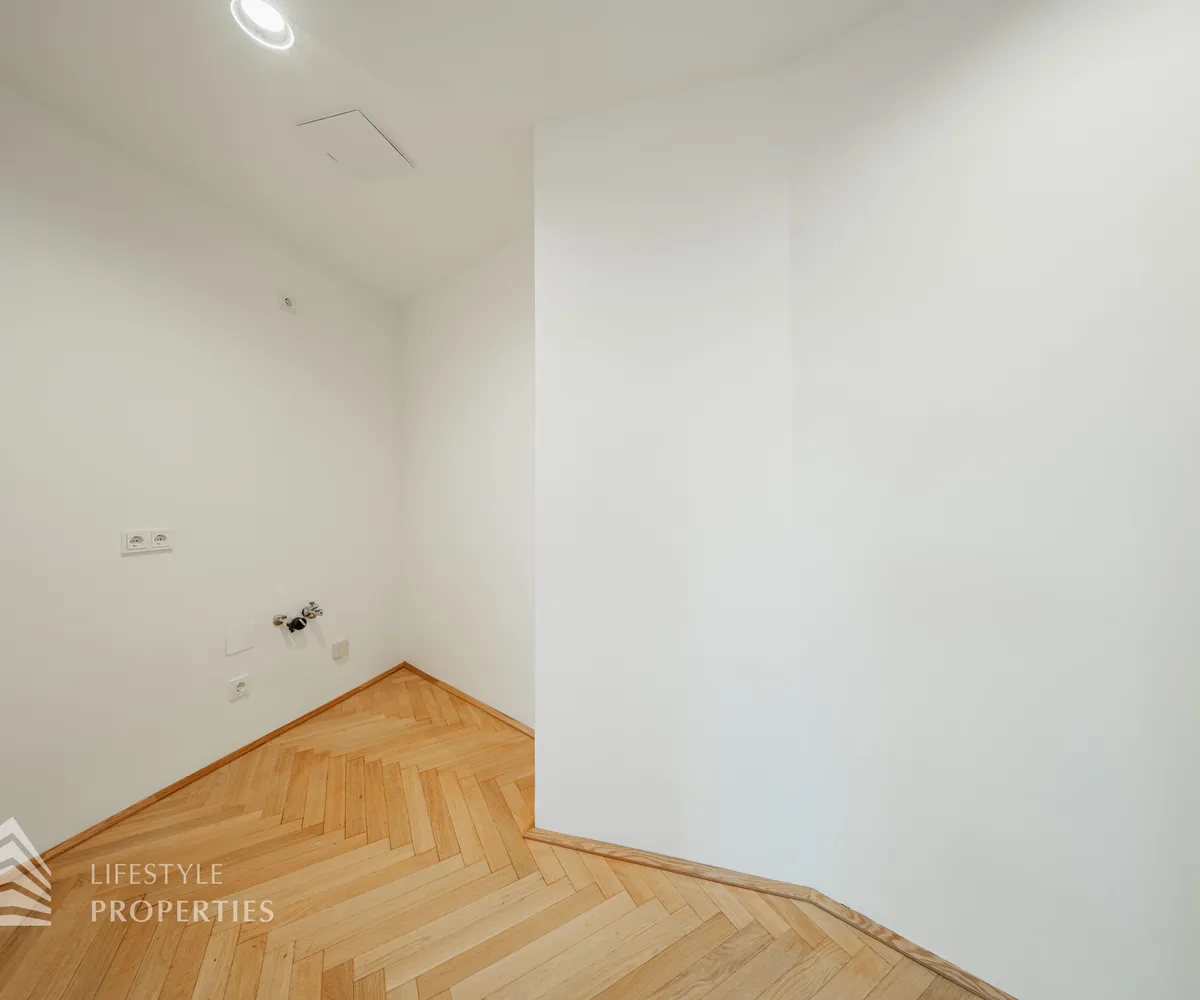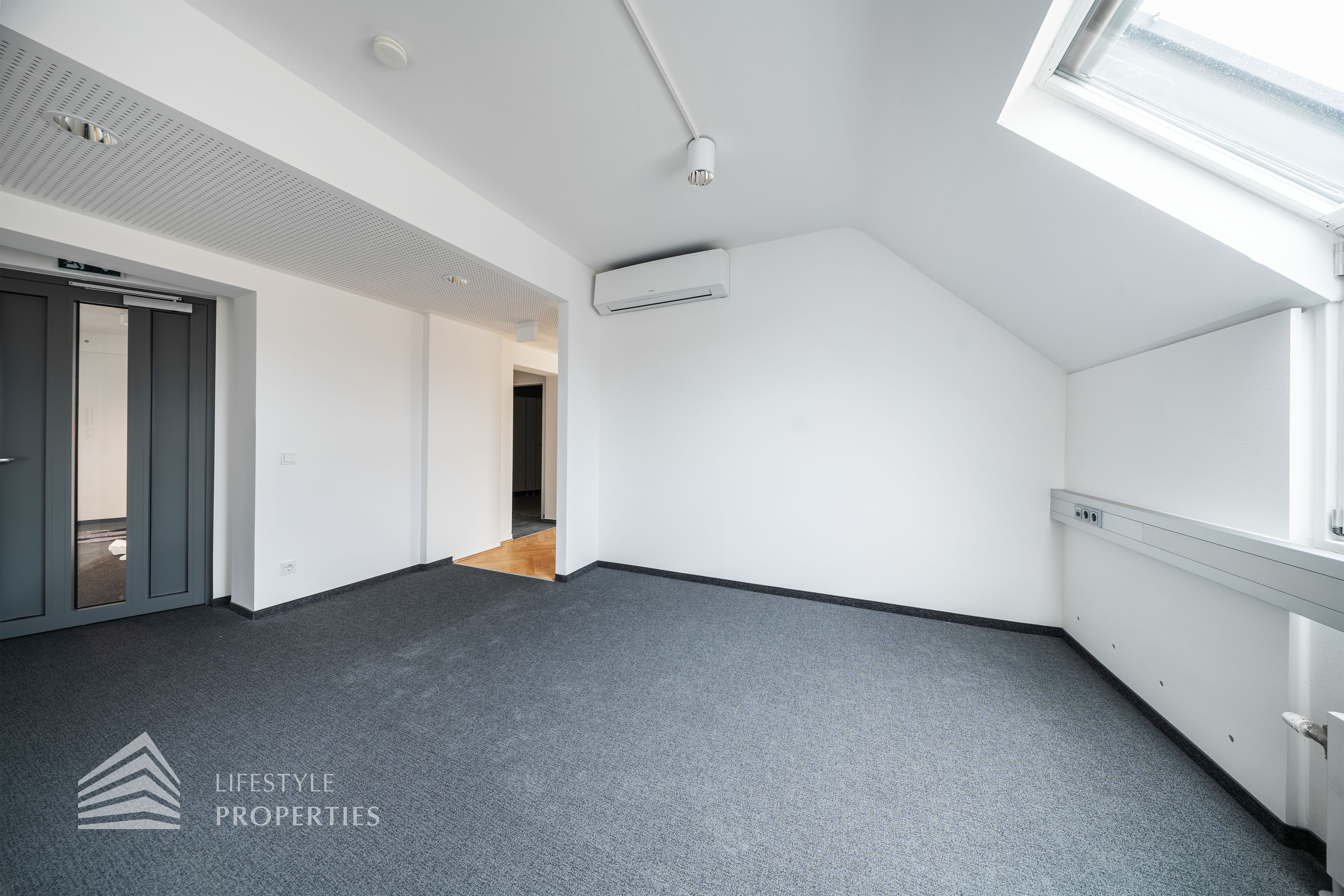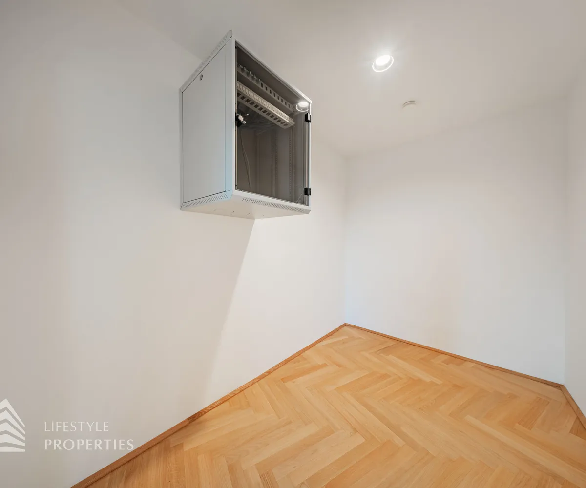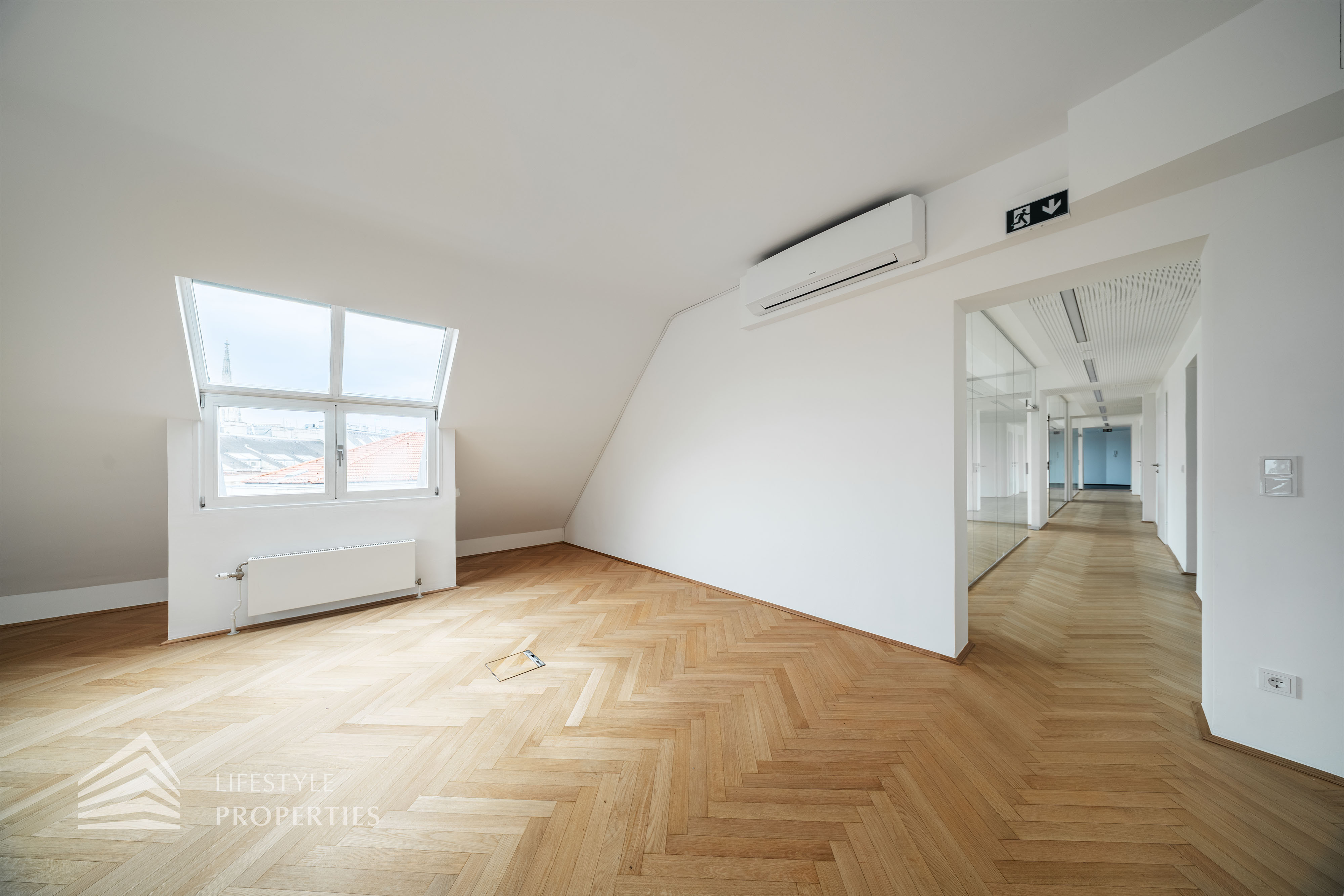 Beim Betreten des Büros steht man direkt im ca. 21 m² großen Vorraum, dieser mit dem angrenzenden Büro geteilt ist. Beim Eingang befindet sich der ca. 18 m² große Empfang. Durch einen ca. 33 m² langen Gang gelangt man zu den einzelnen Büroräumen. Auf der linken Seite des Ganges befindet sich ein Serverraum, ein Sozialraum mit einer Teeküche, die Toiletten für die Damen und Herren, ein Badezimmer, ein Kopierraum und ein Abstellraum. Die Fläche des Heizraumes wird auf vier Einheiten aufgeteilt.