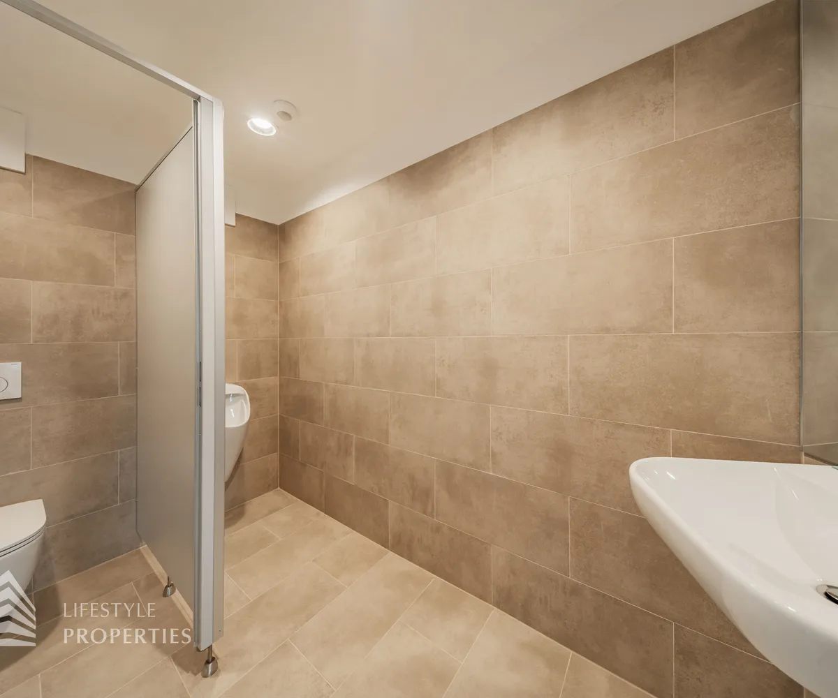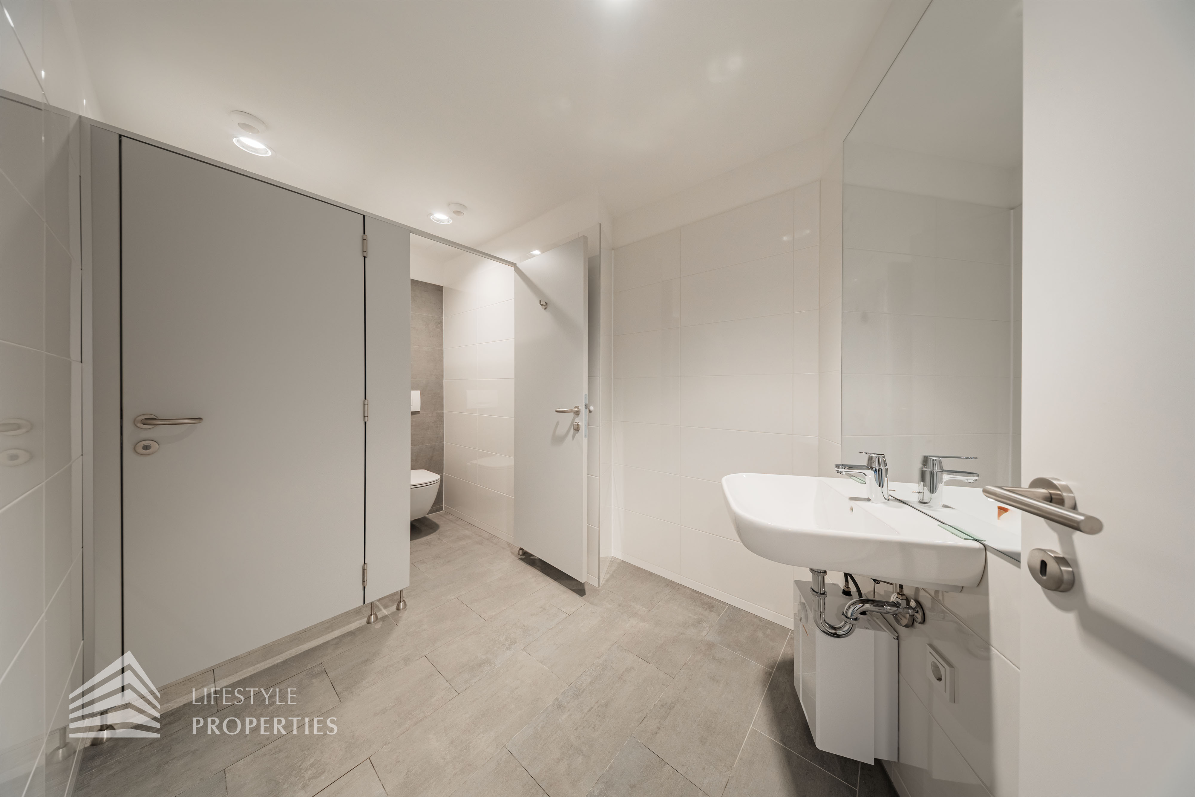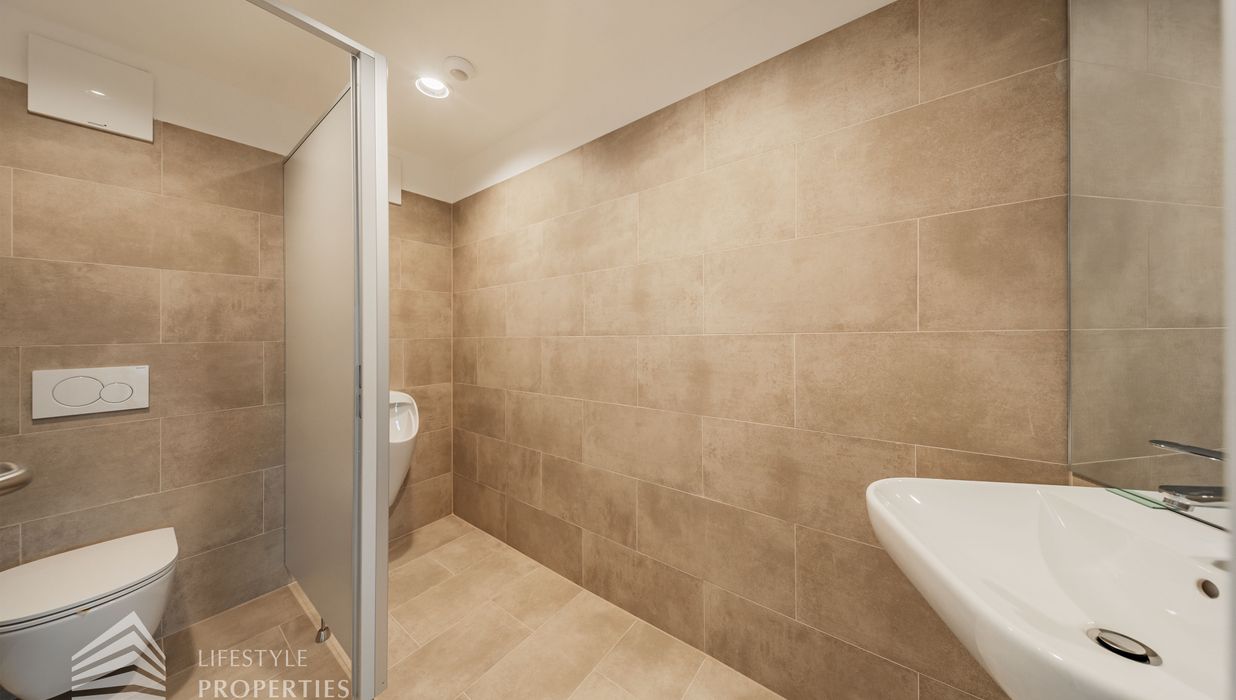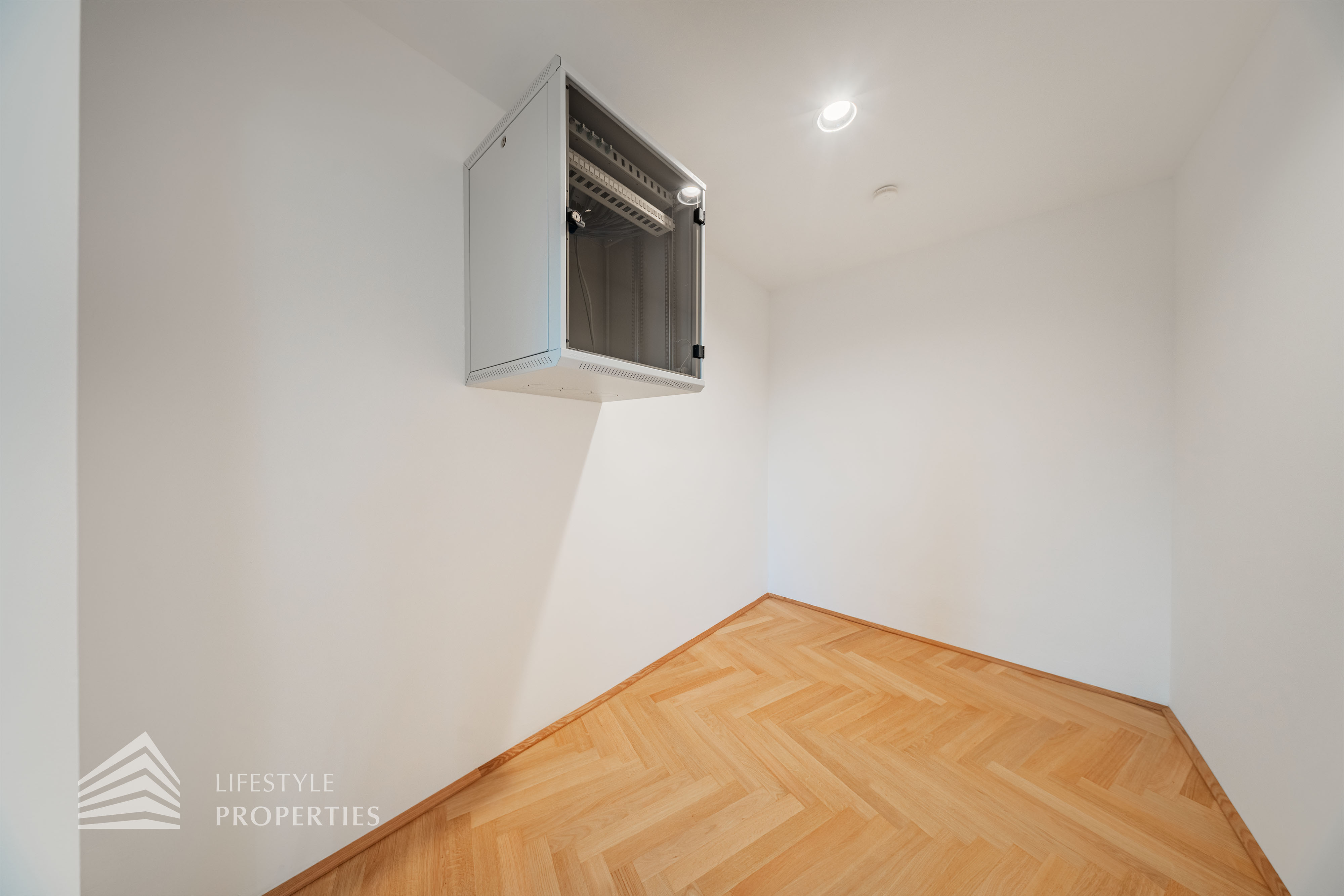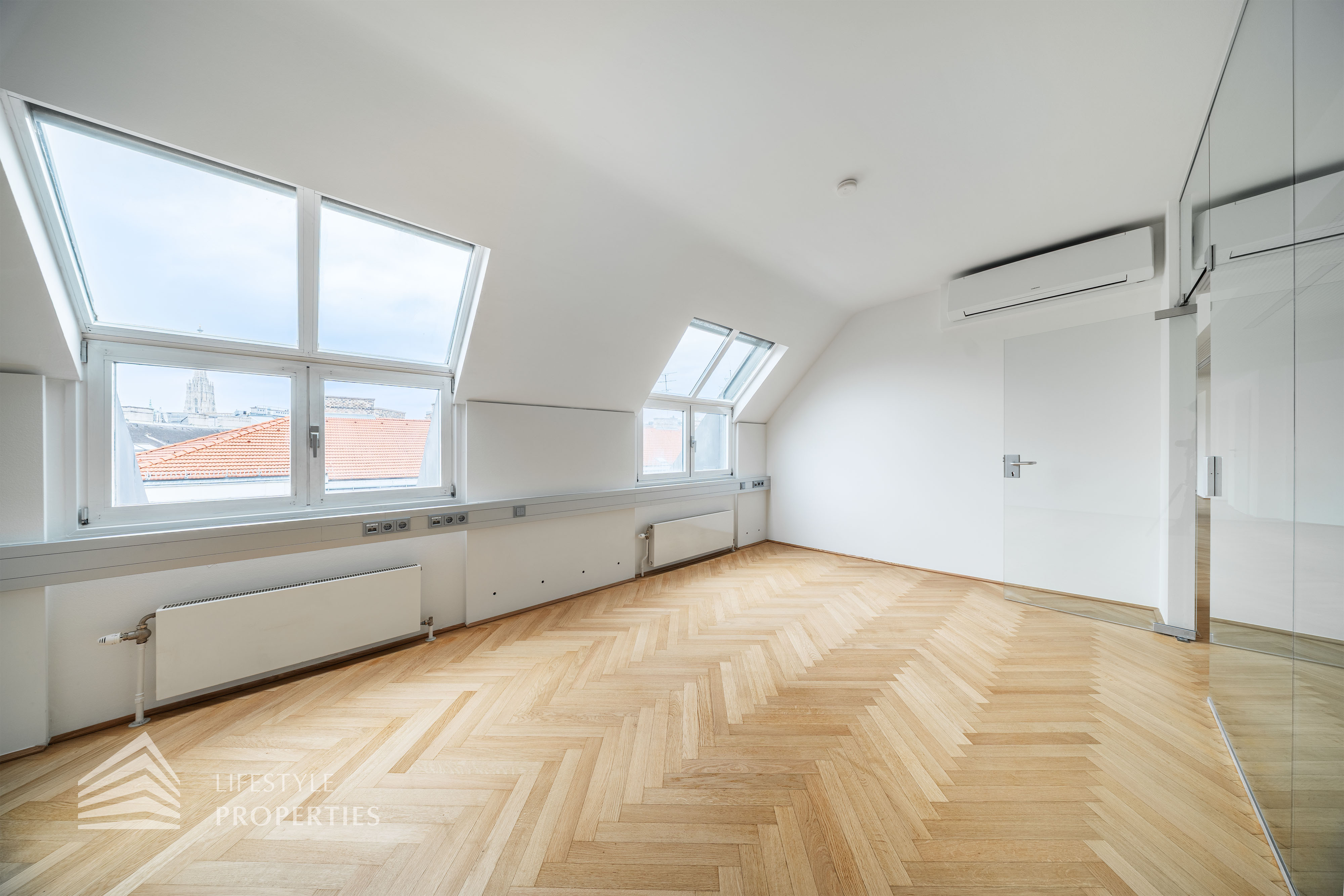 Beim Betreten des Büros steht man direkt im ca. 21 m² großen Vorraum, dieser mit dem angrenzenden Büro geteilt ist. Beim Eingang befindet sich der ca. 18 m² große Empfang. Durch einen ca. 33 m² langen Gang gelangt man zu den einzelnen Büroräumen. Auf der linken Seite des Ganges befindet sich ein Serverraum, ein Sozialraum mit einer Teeküche, die Toiletten für die Damen und Herren, ein Badezimmer, ein Kopierraum und ein Abstellraum. Die Fläche des Heizraumes wird auf vier Einheiten aufgeteilt.