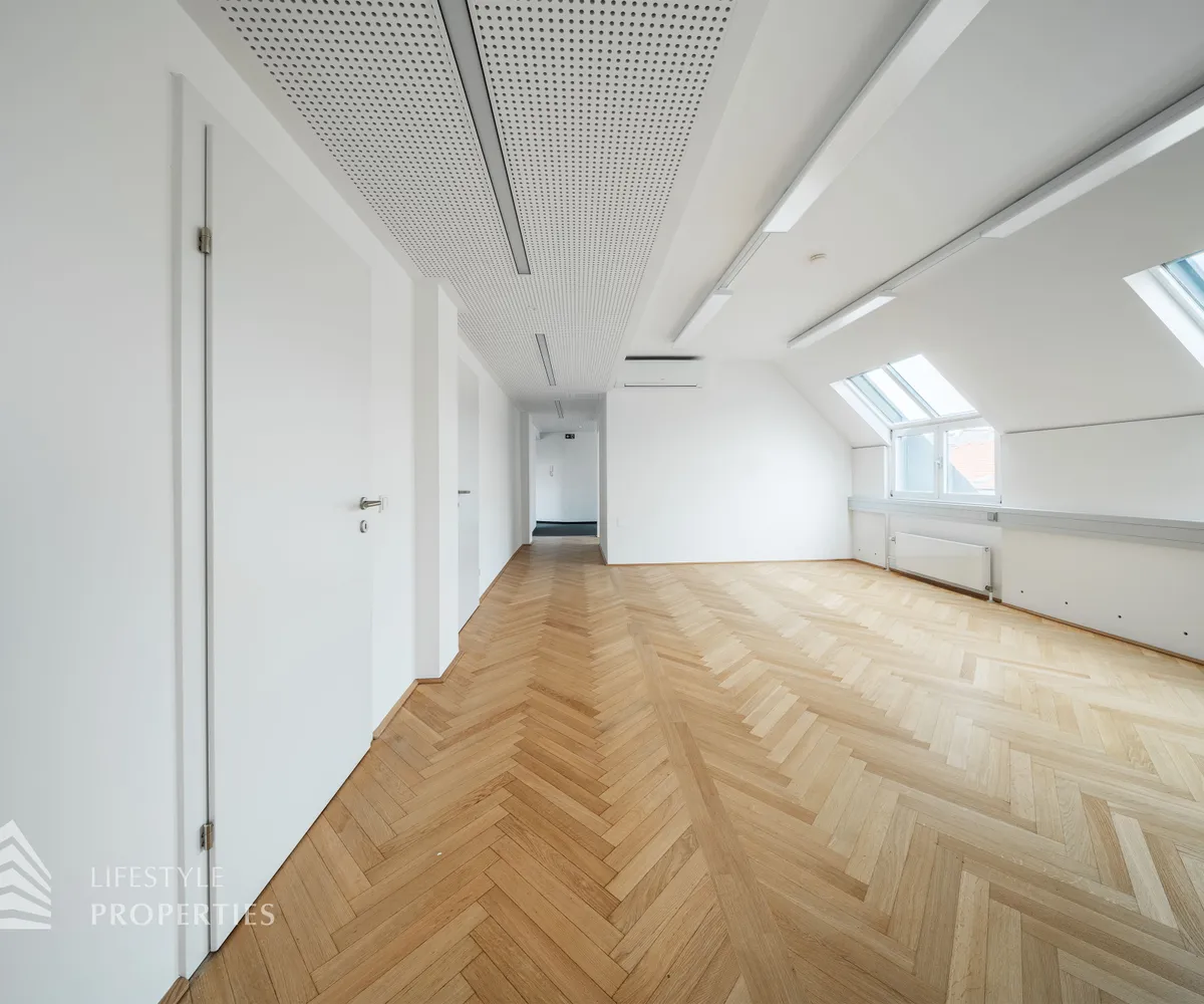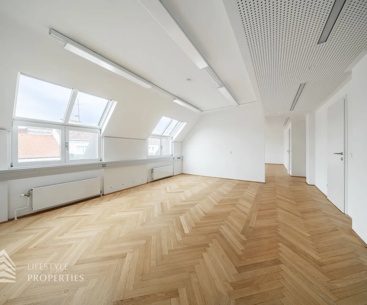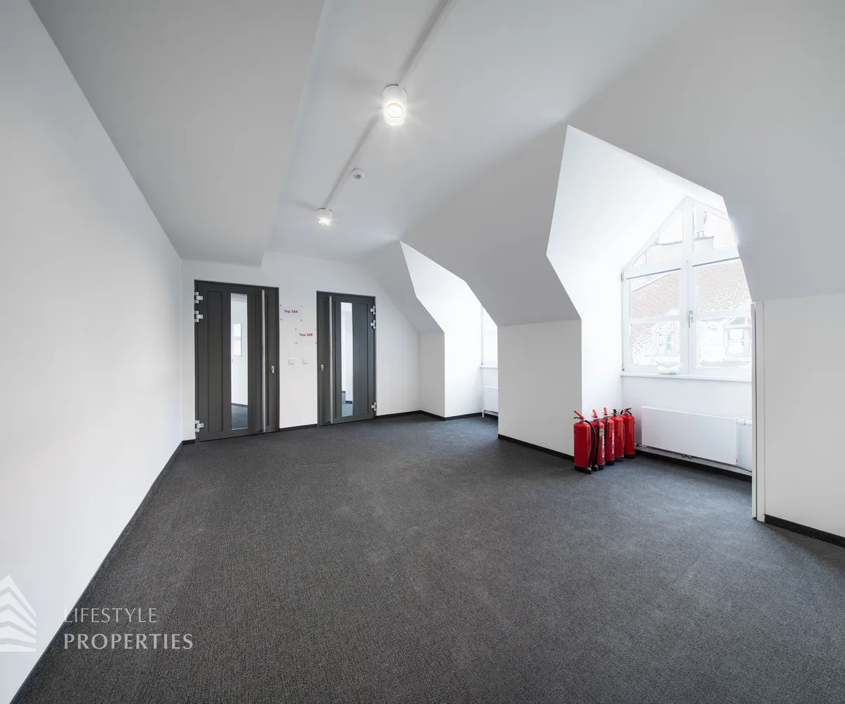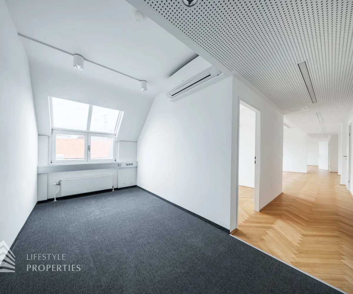 Beim Betreten des Büros steht man direkt im ca. 21 m² großen Vorraum, dieser mit dem angrenzenden Büro geteilt ist. Beim Eingang befindet sich der ca. 15 m² große Empfang. Durch einen ca. 12 m² langen Gang gelangt man zu den einzelnen Büroräumen. Auf der linken Seite des Ganges befindet sich ein Sozialraum mit einer Teeküche sowie auf der rechten Seite die Toiletten für die Damen und Herren und einen Serverraum. Die Fläche des Heizraumes wird auf vier Einheiten aufgeteilt.