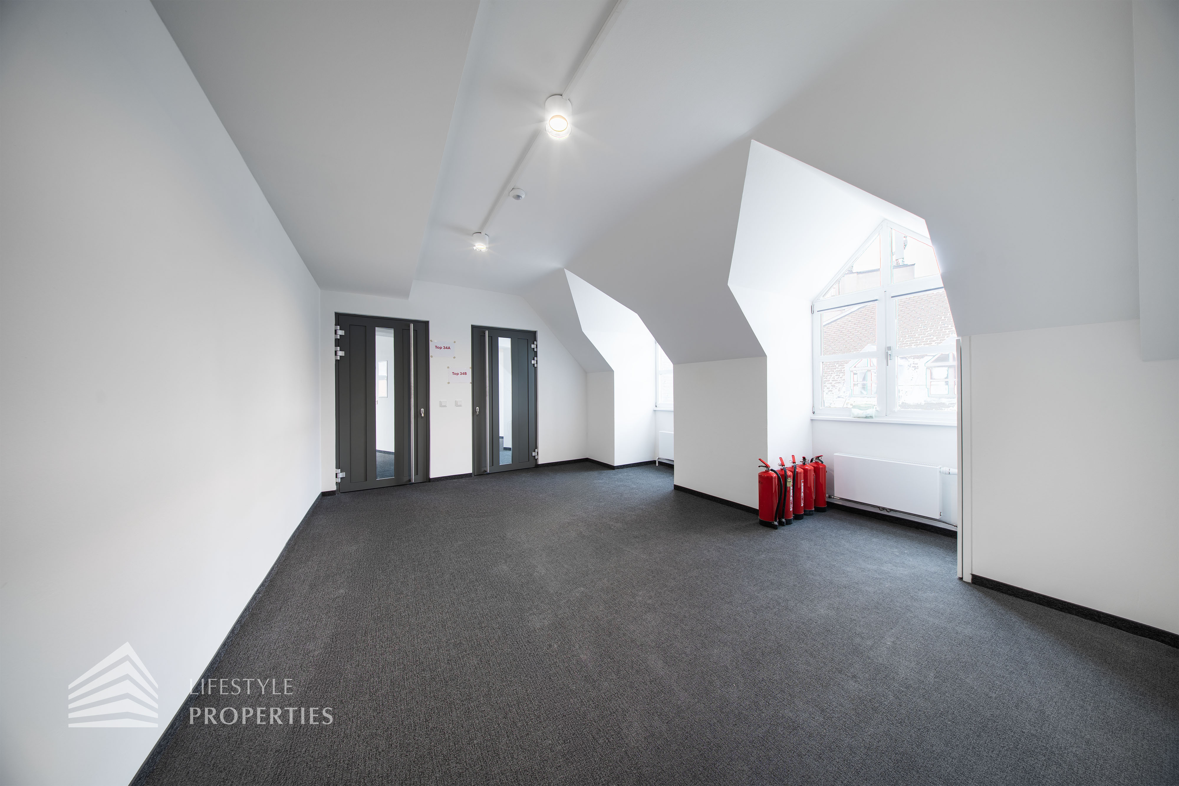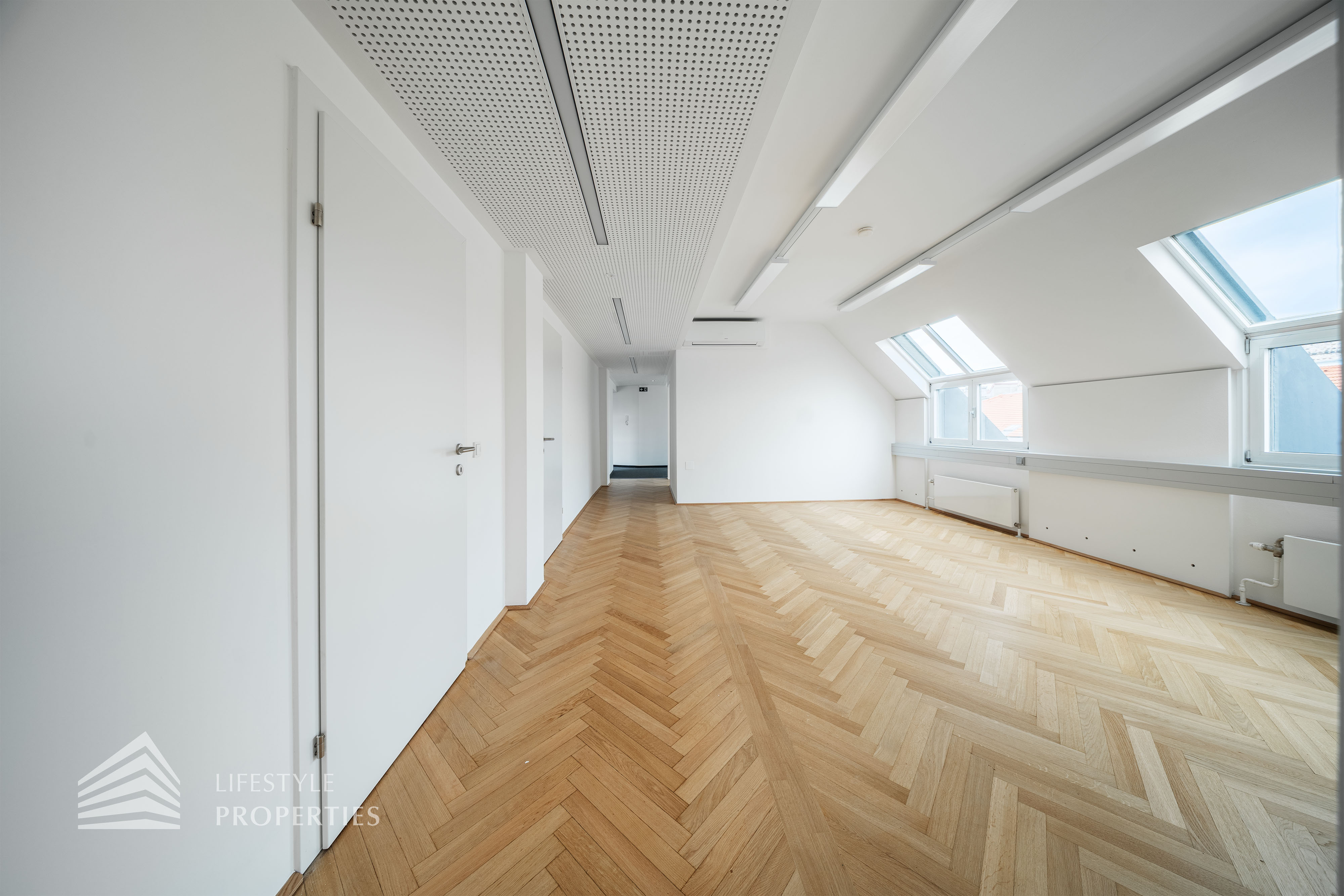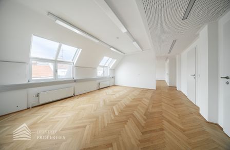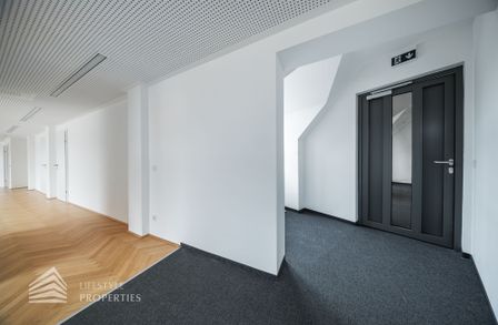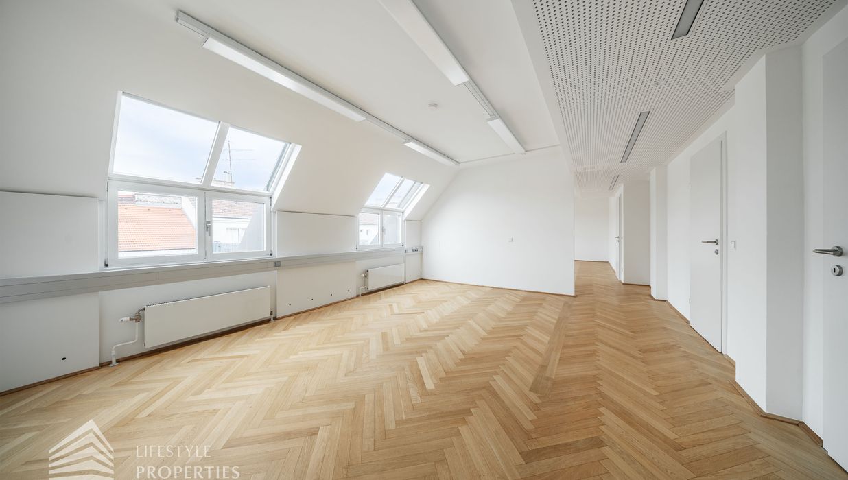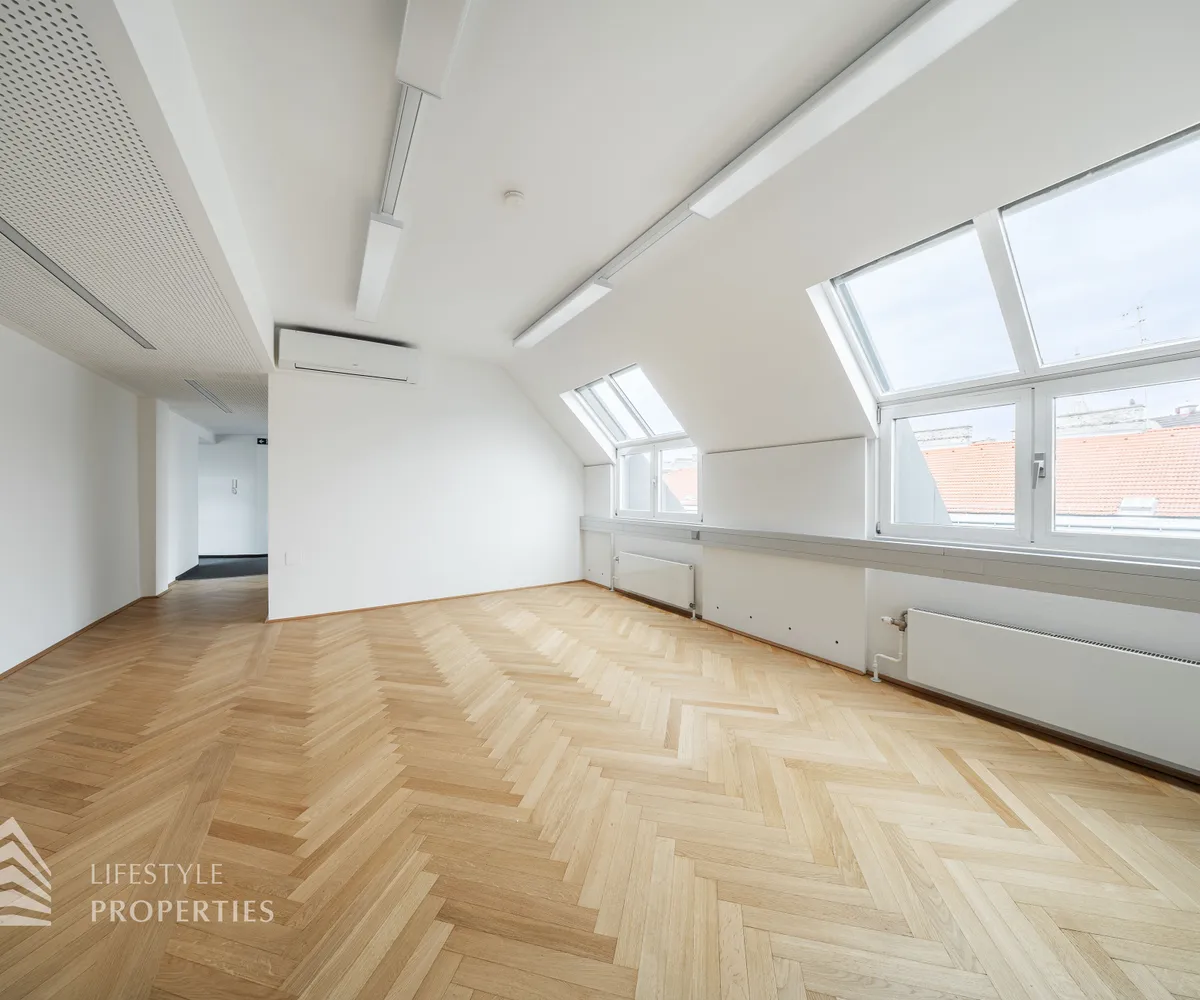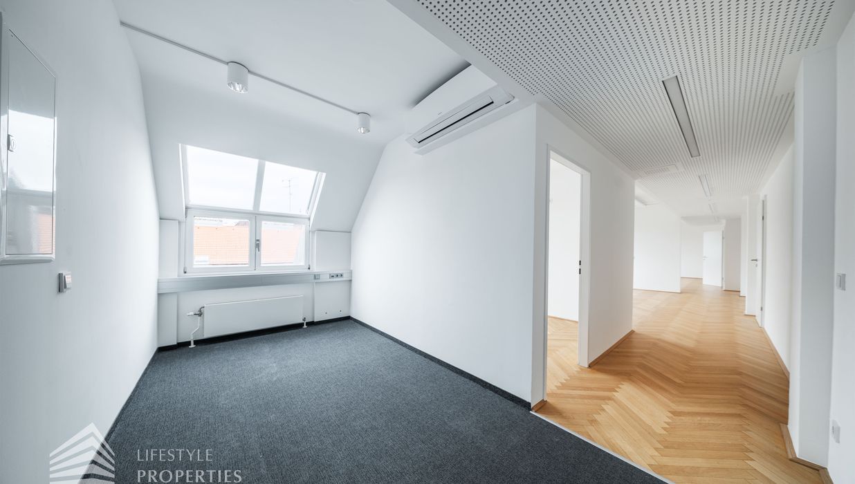 Beim Betreten des Büros steht man direkt im ca. 21 m² großen Vorraum, dieser mit dem angrenzenden Büro geteilt ist. Beim Eingang befindet sich der ca. 15 m² große Empfang. Durch einen ca. 12 m² langen Gang gelangt man zu den einzelnen Büroräumen. Auf der linken Seite des Ganges befindet sich ein Sozialraum mit einer Teeküche sowie auf der rechten Seite die Toiletten für die Damen und Herren und einen Serverraum. Die Fläche des Heizraumes wird auf vier Einheiten aufgeteilt.