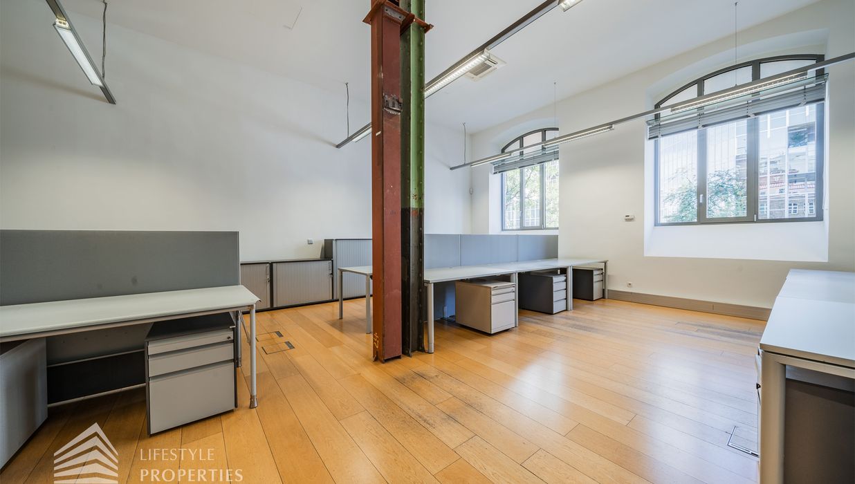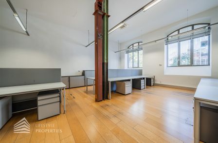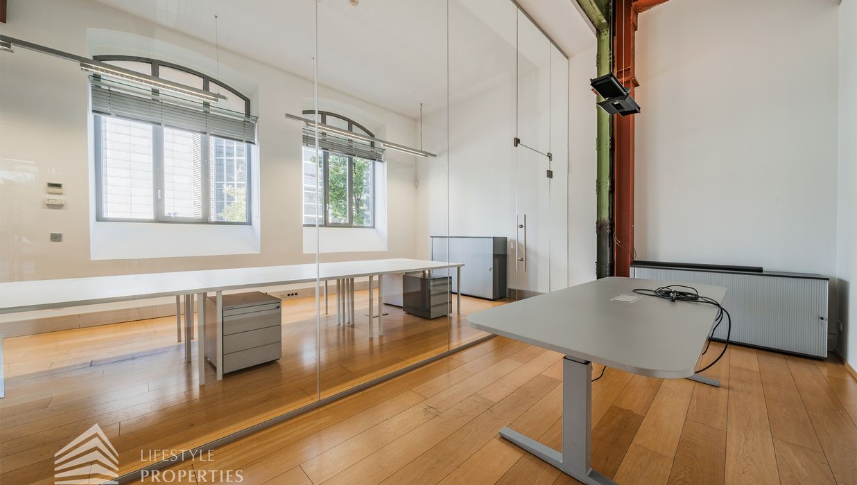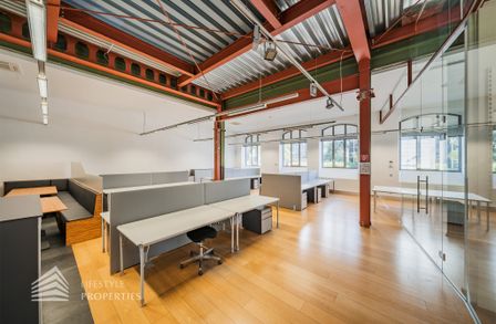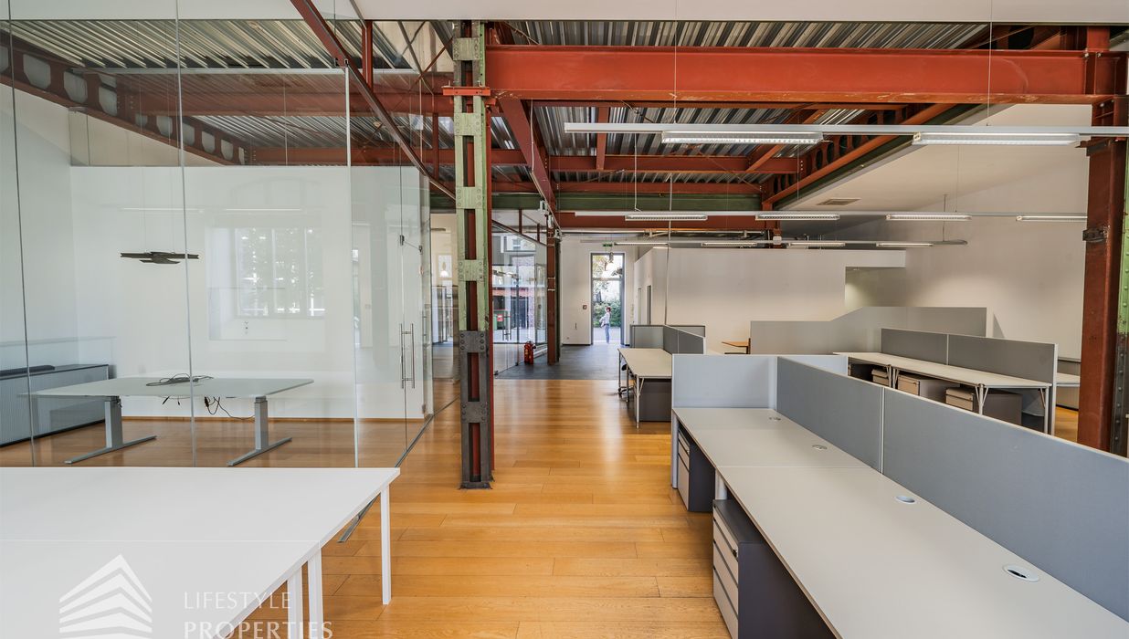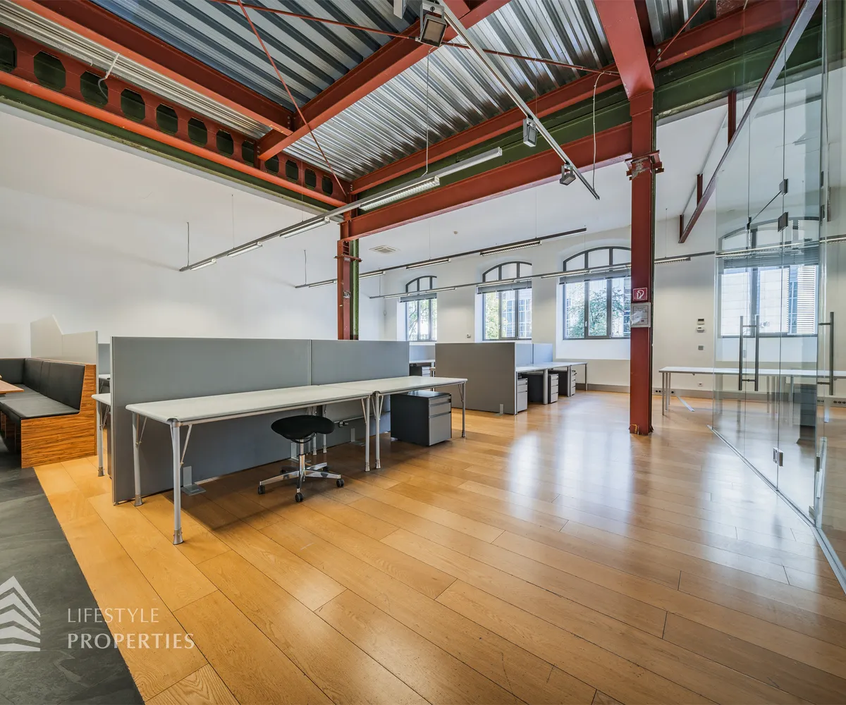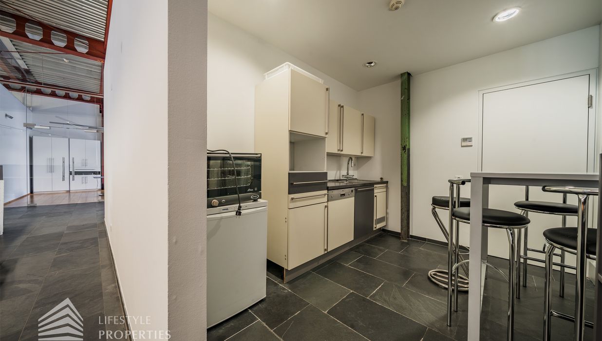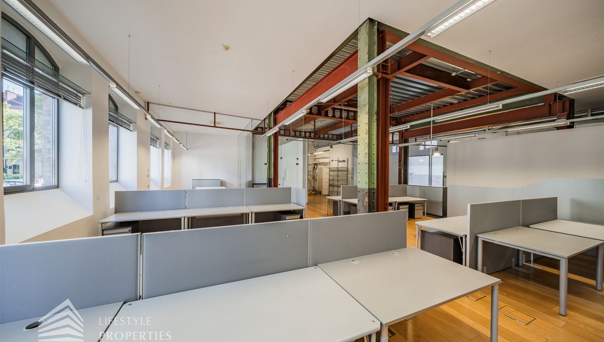 Das Büro zeichnet sich durch die offene Raumgestaltung aus. Viele große Fenster versorgen die Räumlichkeiten mit viel Licht und schaffen eine angenehme Arbeitsatmosphäre. Die Küche ist mit allen notwendigen Geräten ausgestattet und verfügt über ausreichend Stauraum. Die Fotos zeigen die Räumlichkeiten, wie sie damals ausgesehen haben, als sie für Bürozwecke genutzt wurden, und wie sie im Moment aussehen.