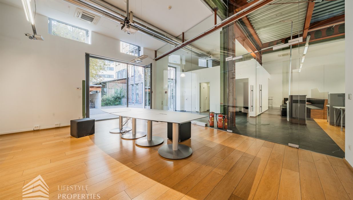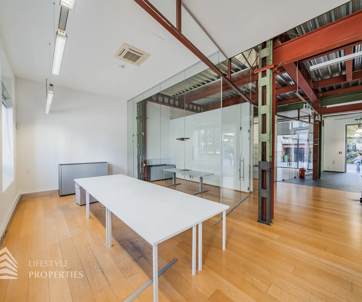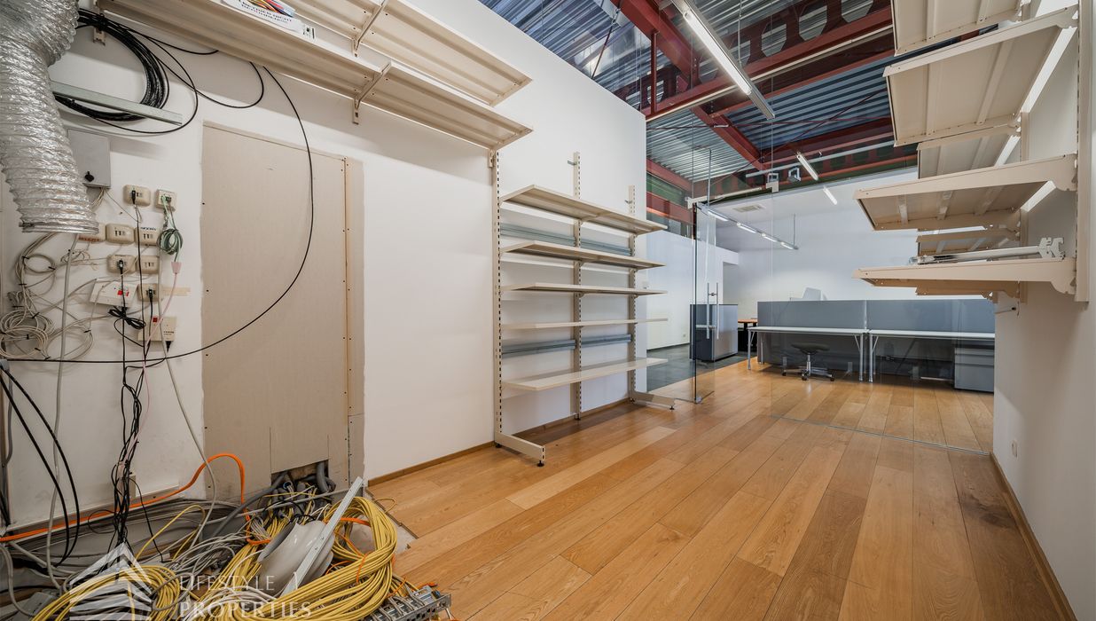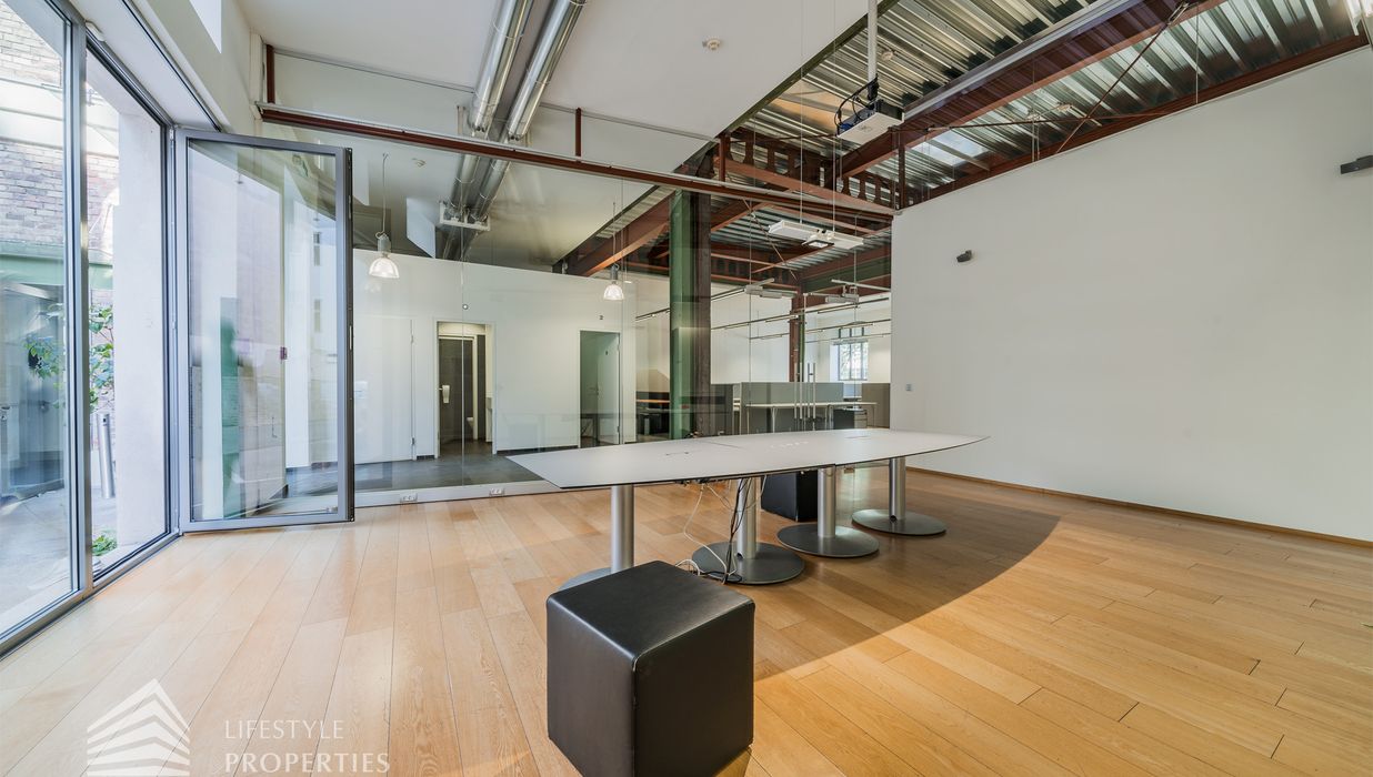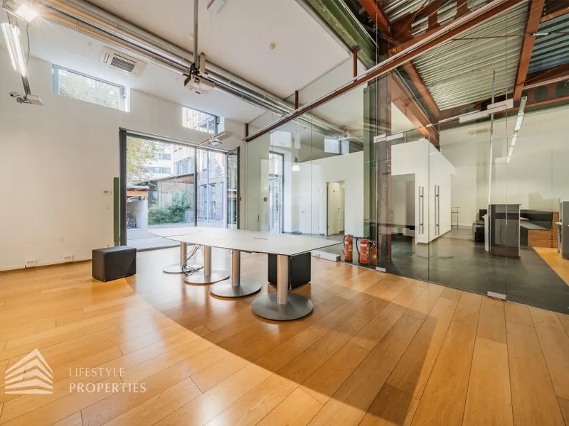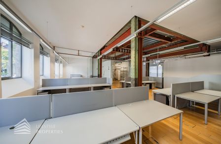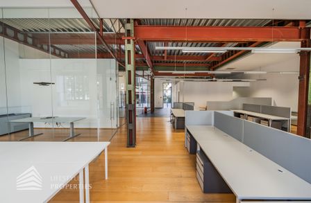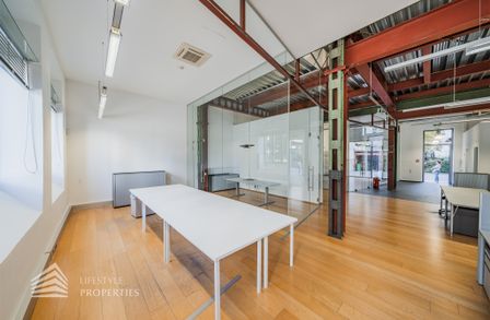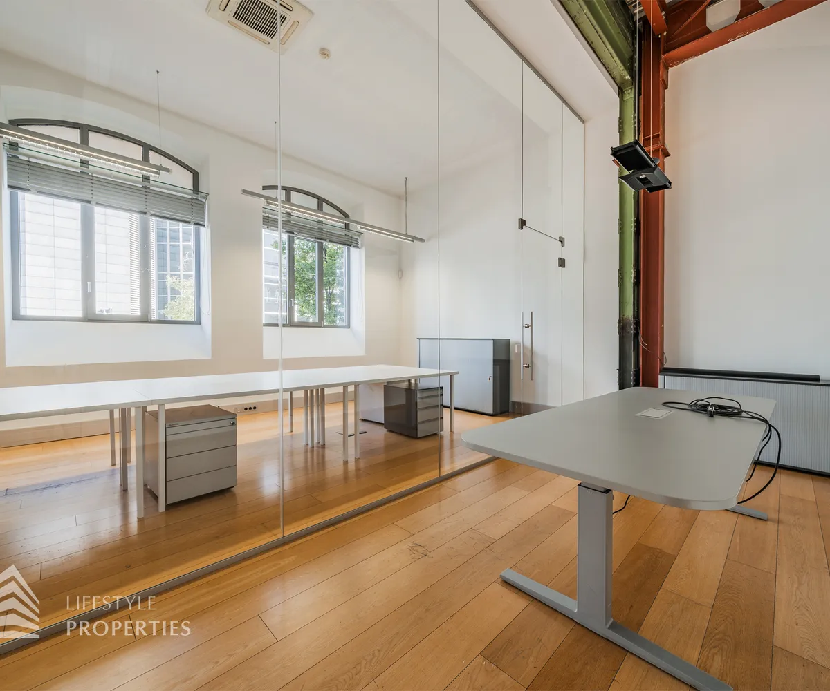Das Büro zeichnet sich durch die offene Raumgestaltung aus. Viele große Fenster versorgen die Räumlichkeiten mit viel Licht und schaffen eine angenehme Arbeitsatmosphäre. Die Küche ist mit allen notwendigen Geräten ausgestattet und verfügt über ausreichend Stauraum. Die Fotos zeigen die Räumlichkeiten, wie sie damals ausgesehen haben, als sie für Bürozwecke genutzt wurden, und wie sie im Moment aussehen.