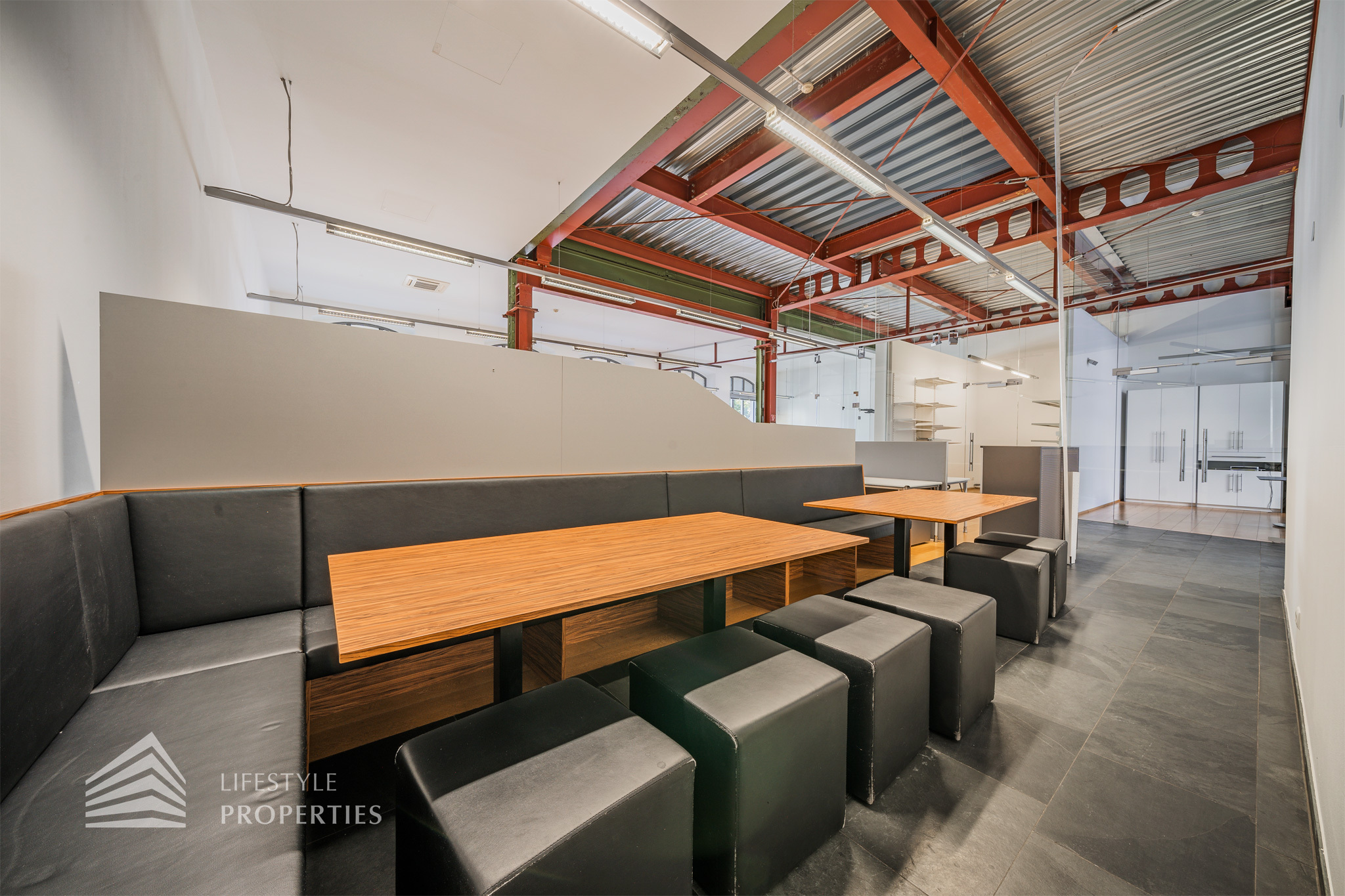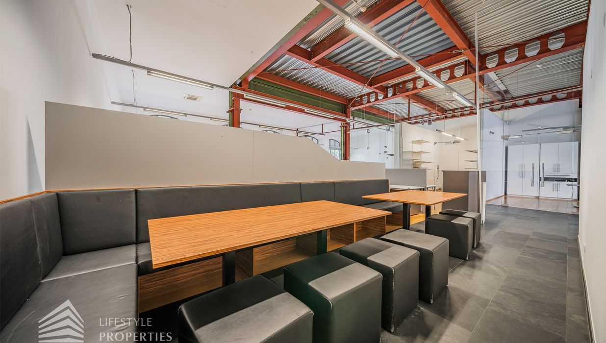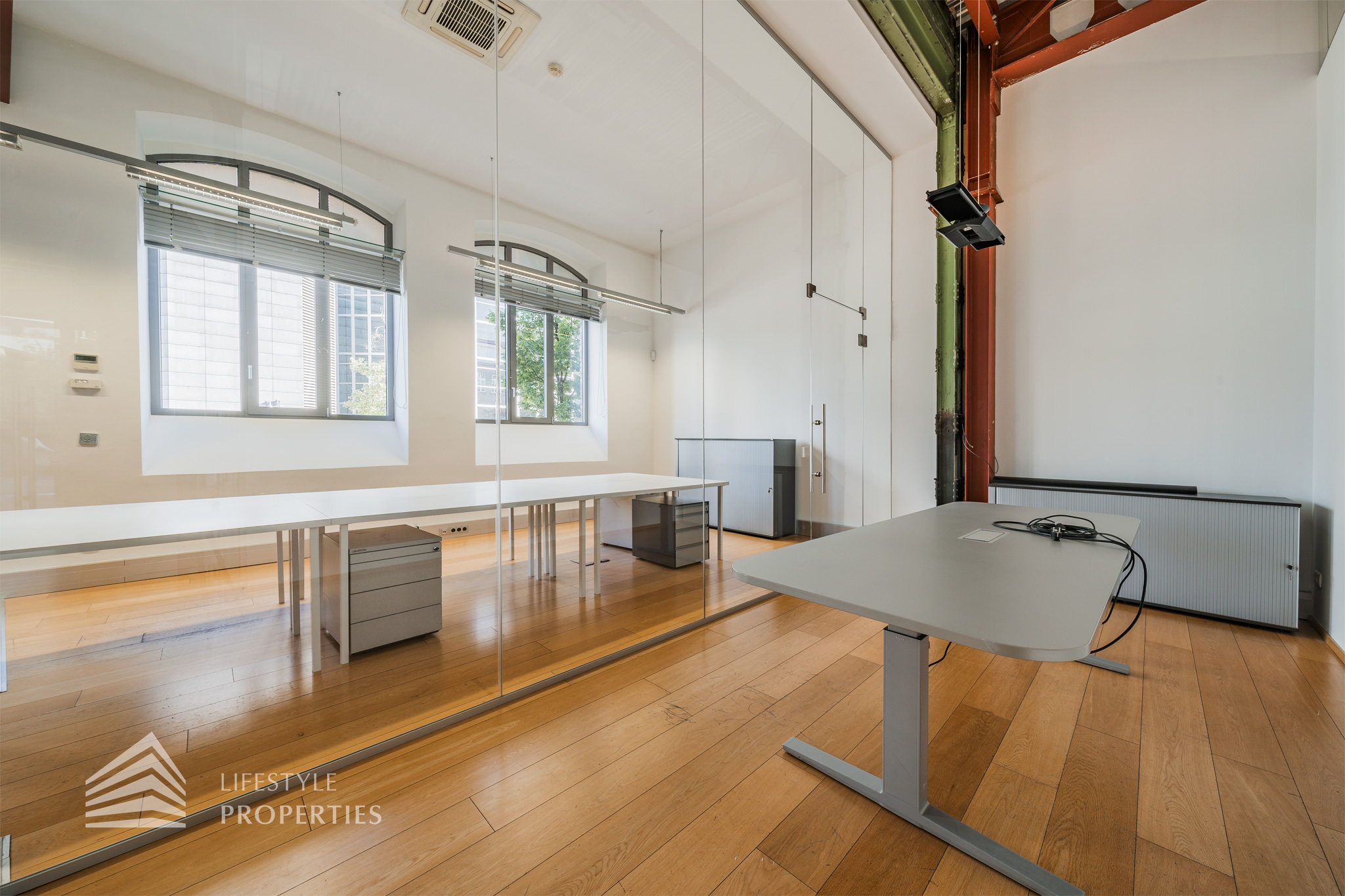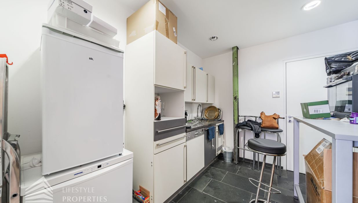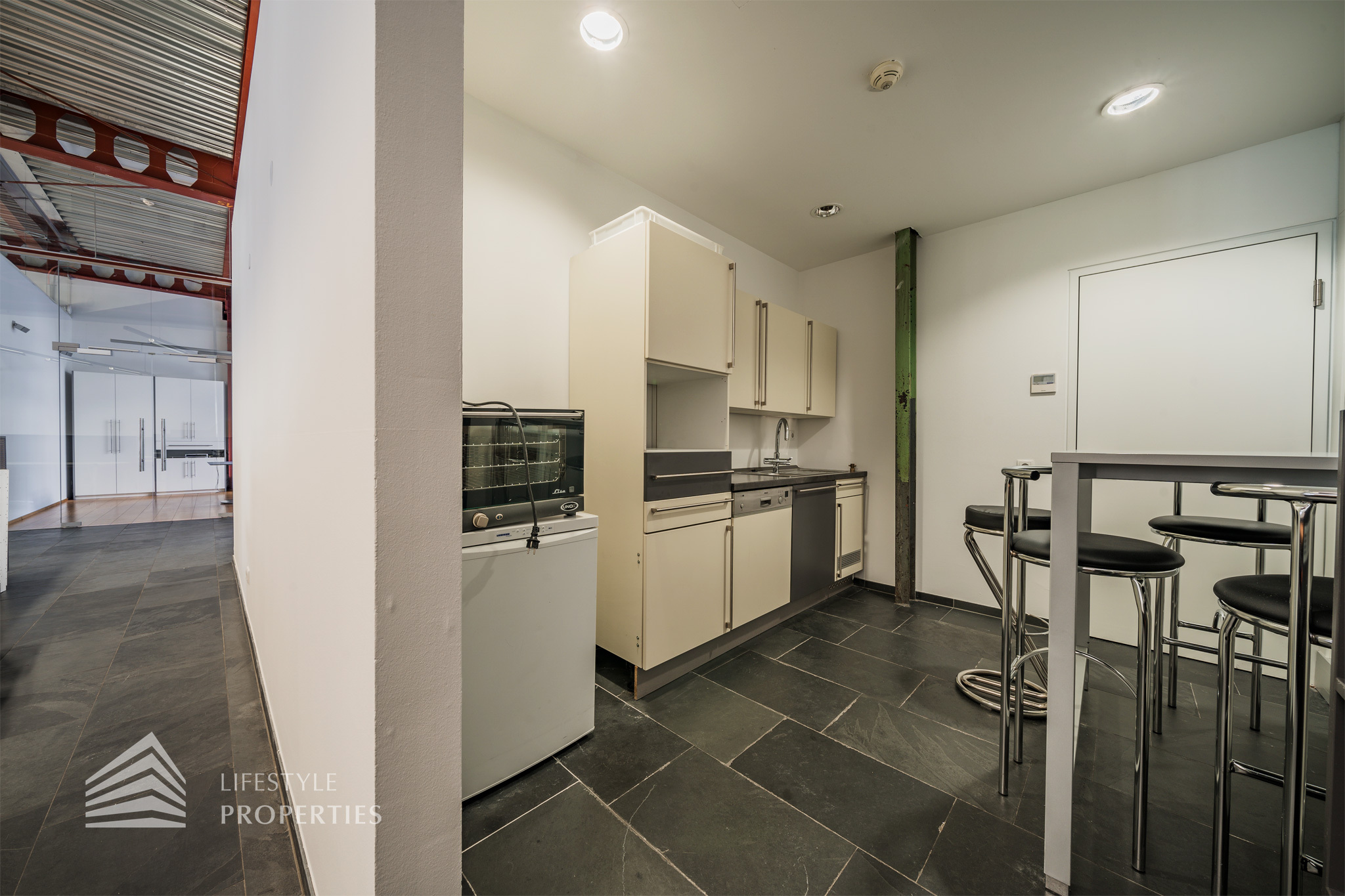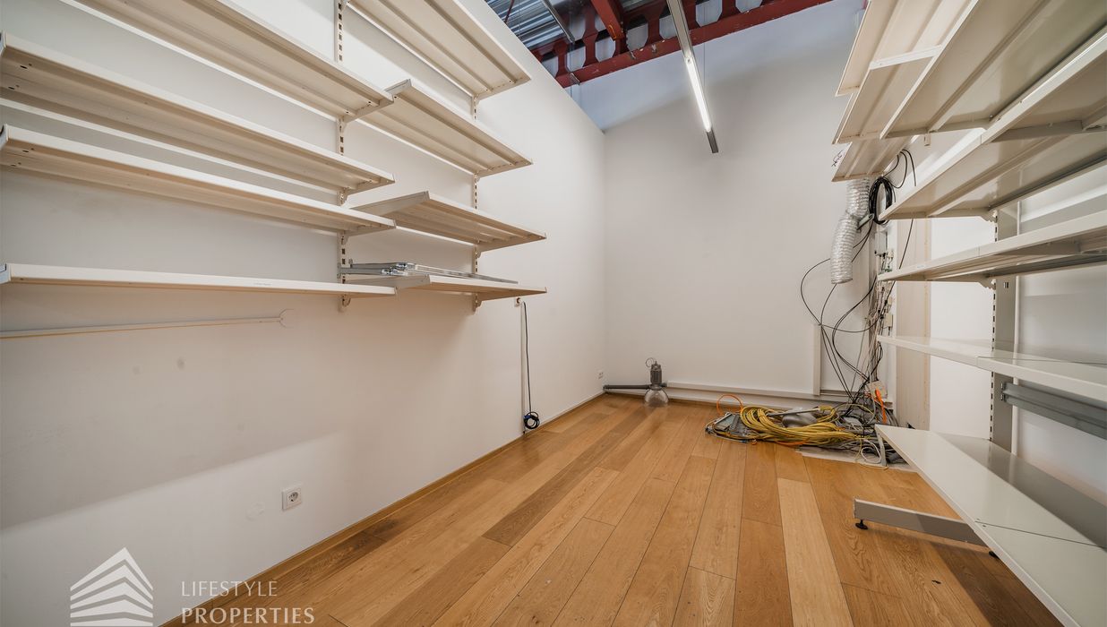 Das Büro zeichnet sich durch die offene Raumgestaltung aus. Viele große Fenster versorgen die Räumlichkeiten mit viel Licht und schaffen eine angenehme Arbeitsatmosphäre. Die Küche ist mit allen notwendigen Geräten ausgestattet und verfügt über ausreichend Stauraum. Die Fotos zeigen die Räumlichkeiten, wie sie damals ausgesehen haben, als sie für Bürozwecke genutzt wurden, und wie sie im Moment aussehen.