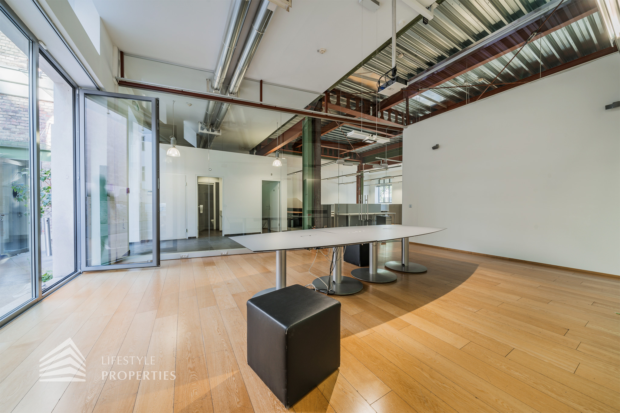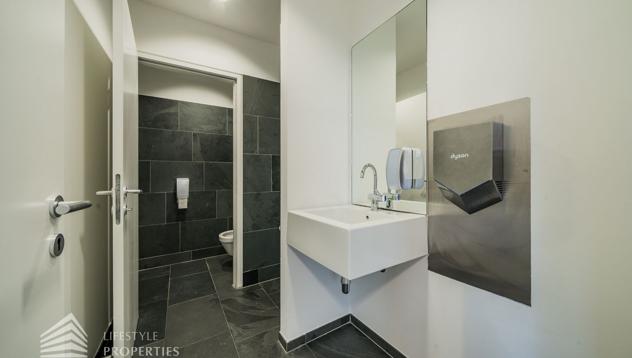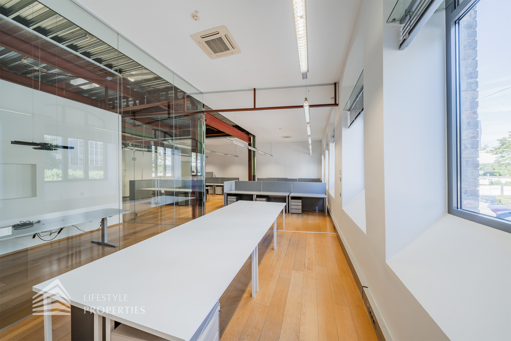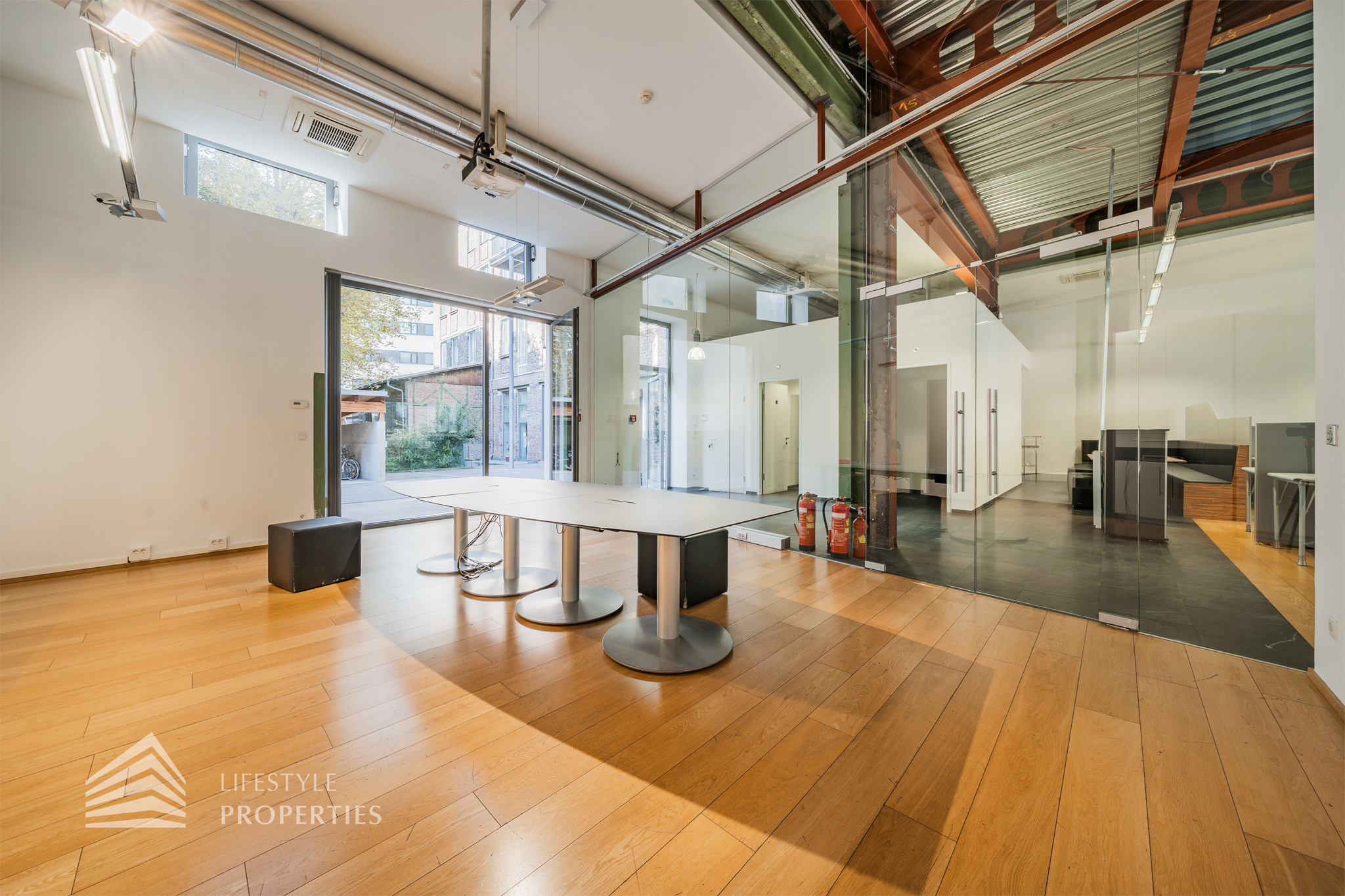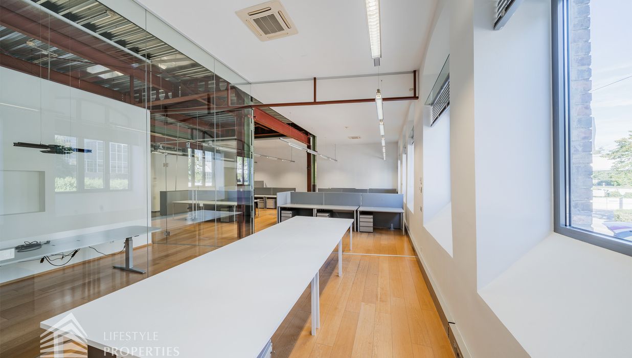 Das Büro zeichnet sich durch die offene Raumgestaltung aus. Viele große Fenster versorgen die Räumlichkeiten mit viel Licht und schaffen eine angenehme Arbeitsatmosphäre. Die Küche ist mit allen notwendigen Geräten ausgestattet und verfügt über ausreichend Stauraum. Die Fotos zeigen die Räumlichkeiten, wie sie damals ausgesehen haben, als sie für Bürozwecke genutzt wurden, und wie sie im Moment aussehen.